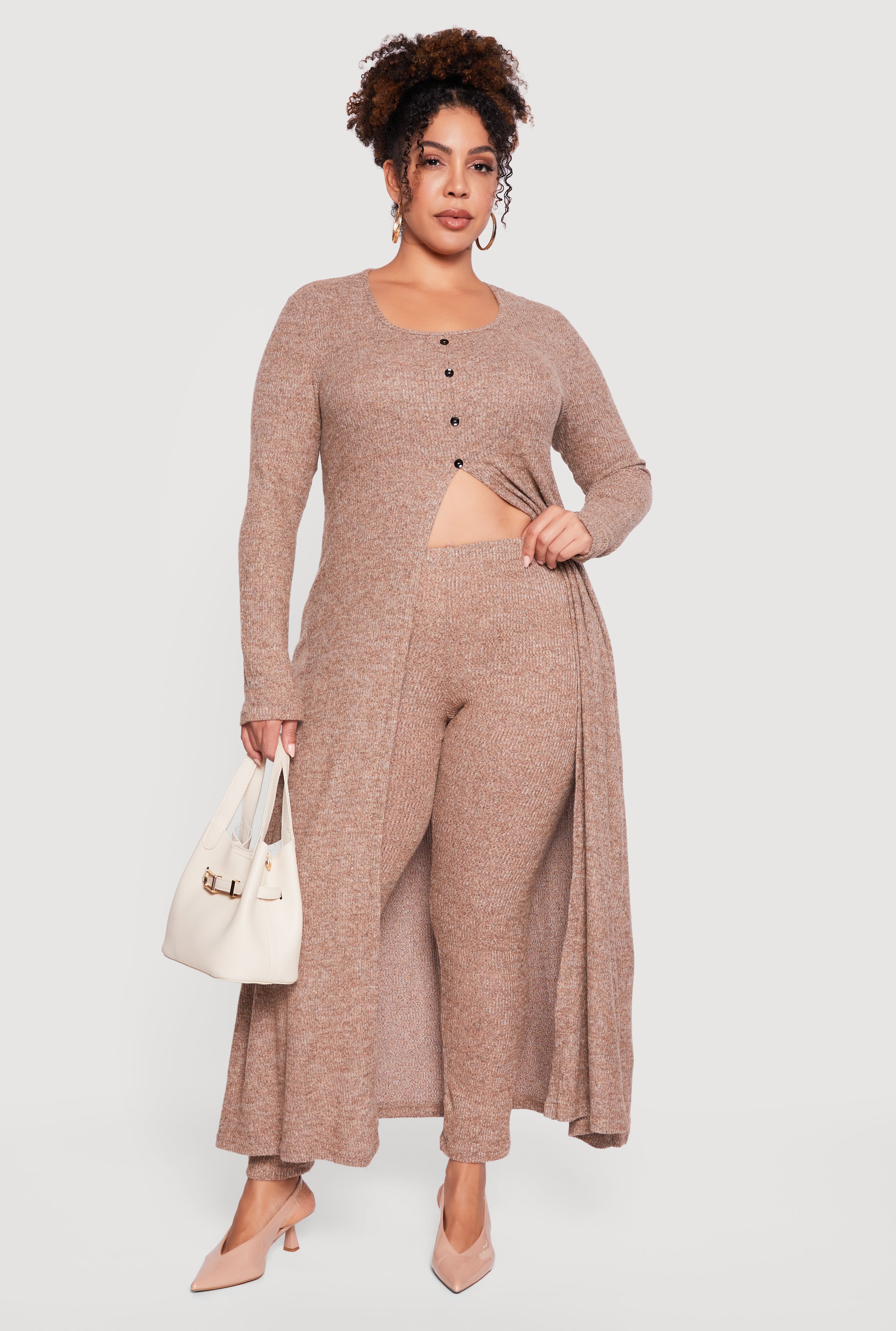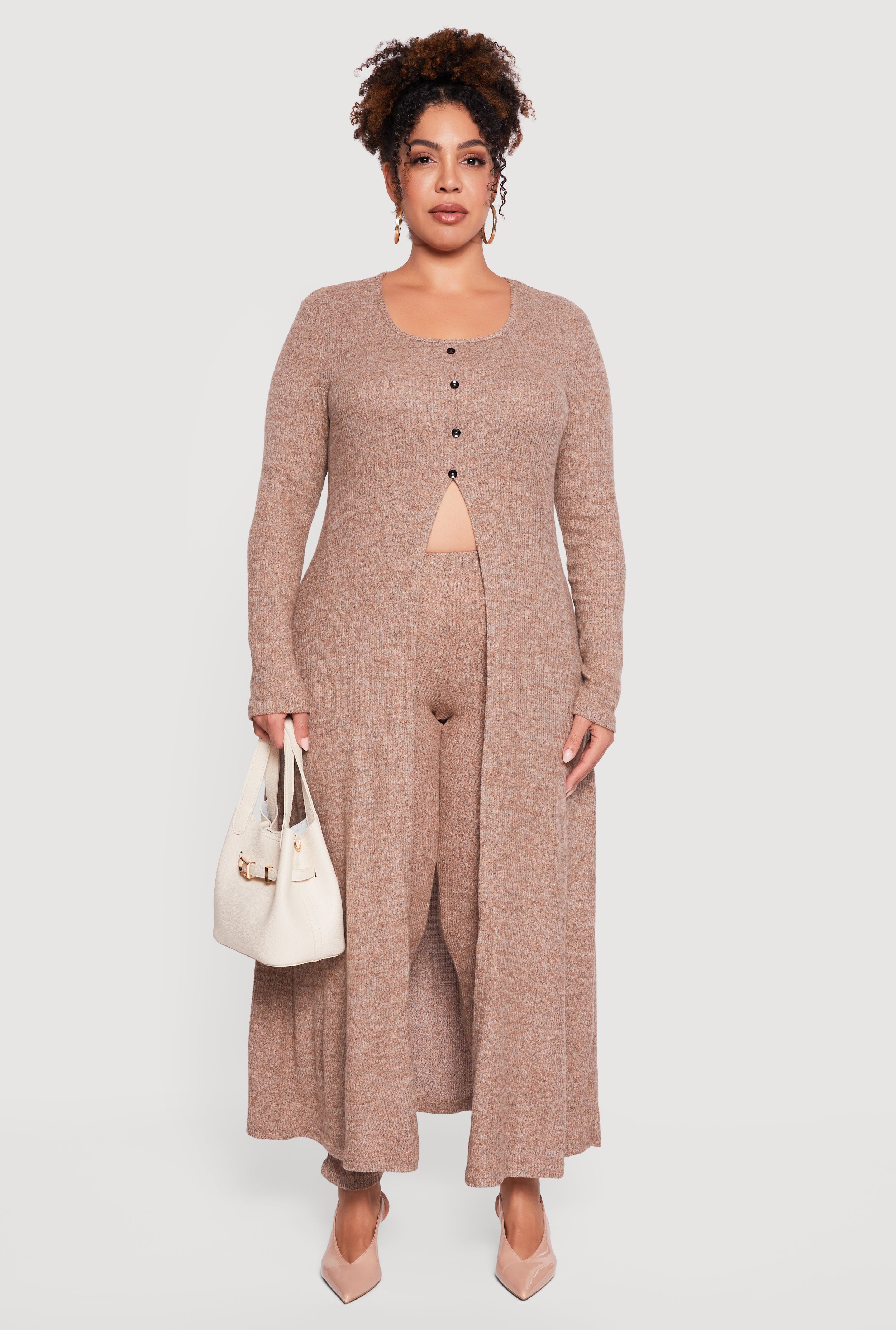 Plus Size Split Hem Long Sweater with Faux Buttons