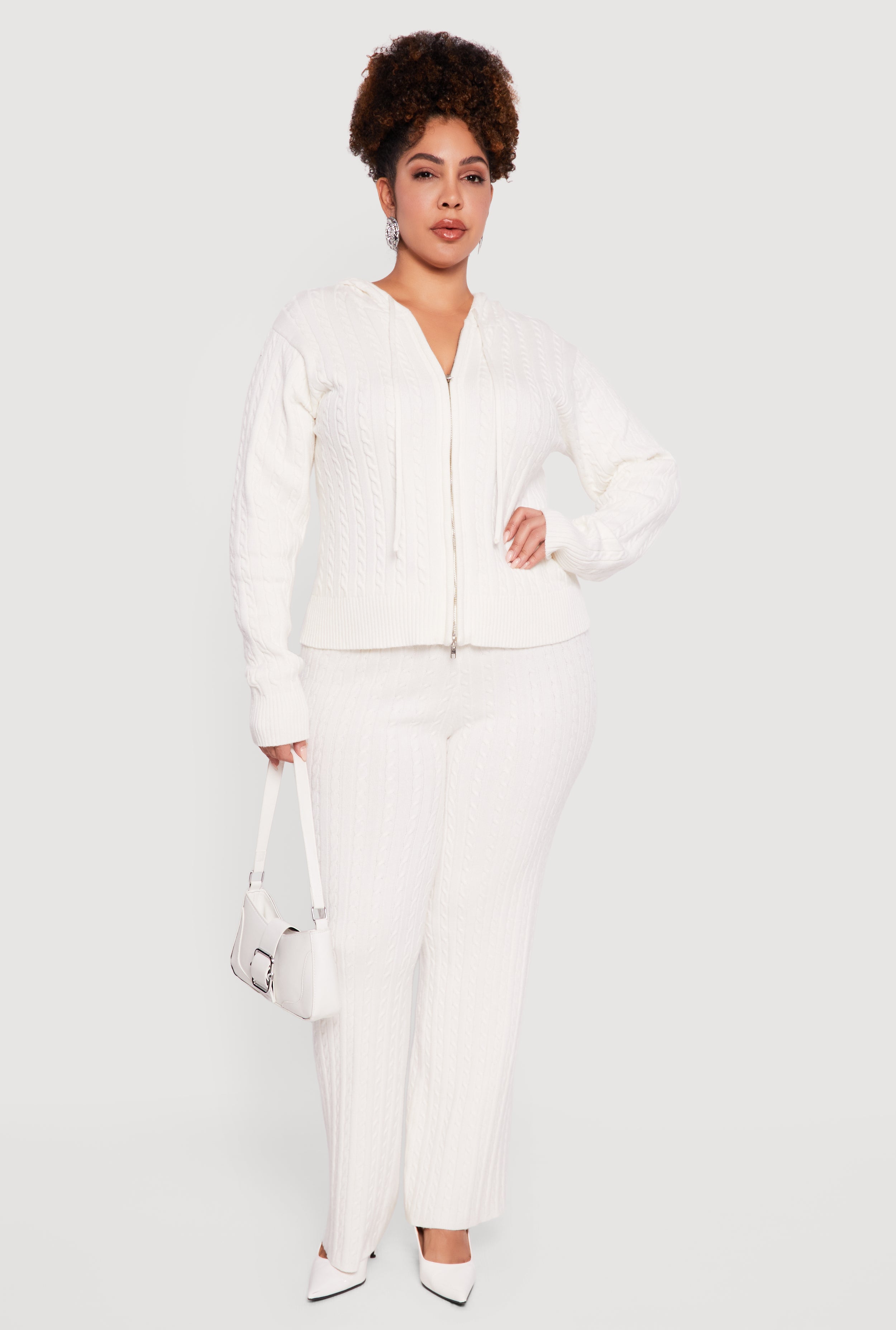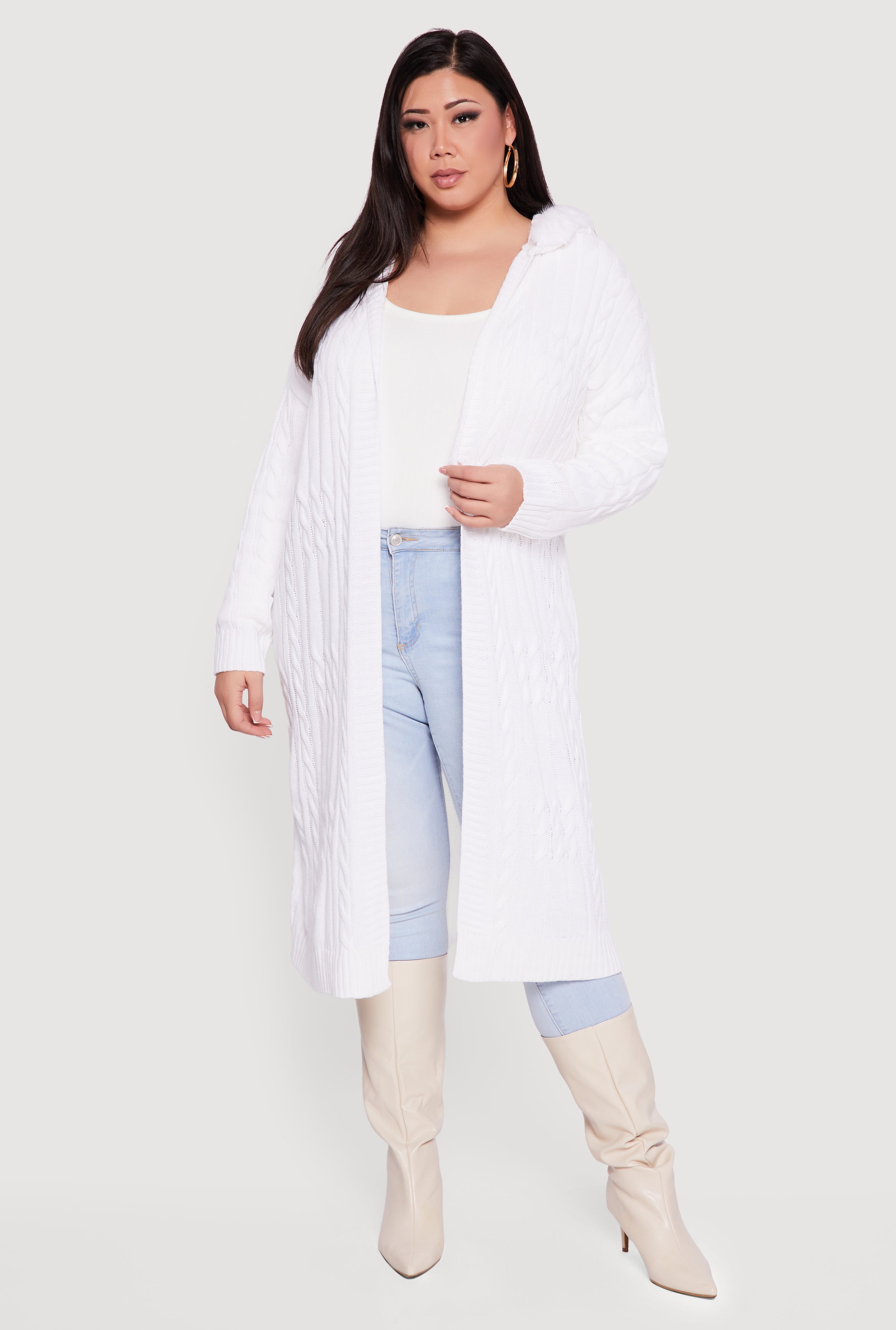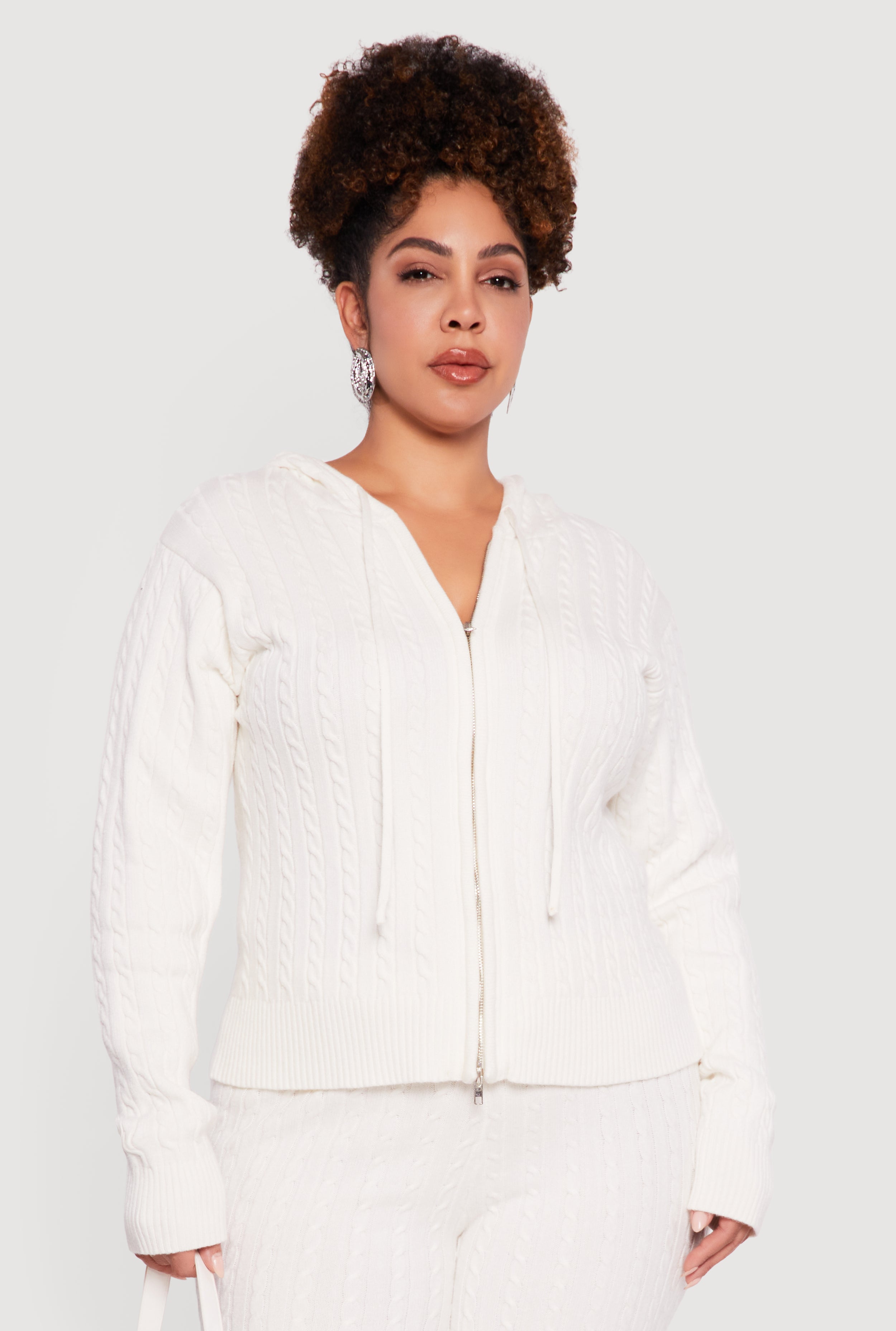 Plus Size Zip Front Cable Knit Sweater Hoodie
