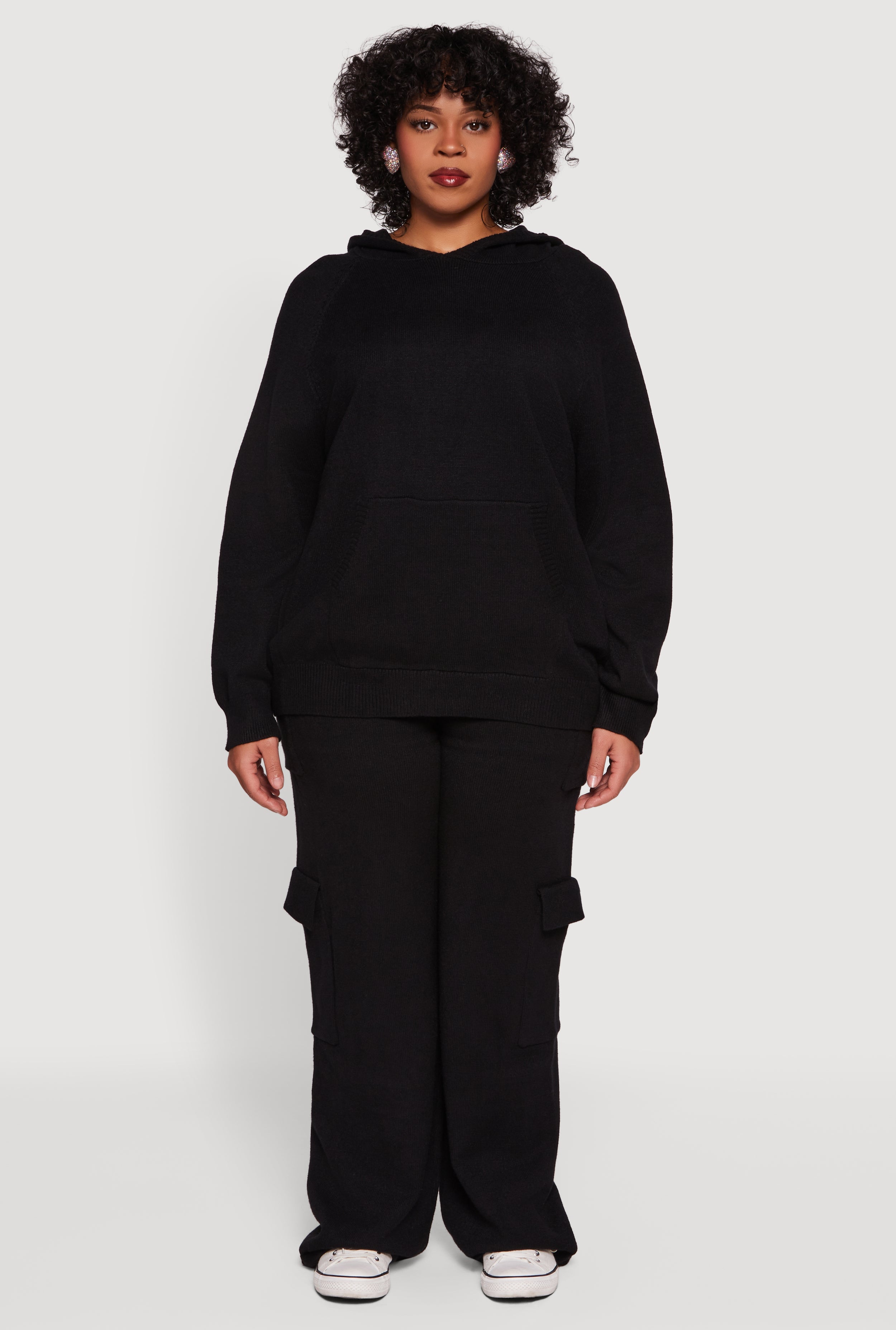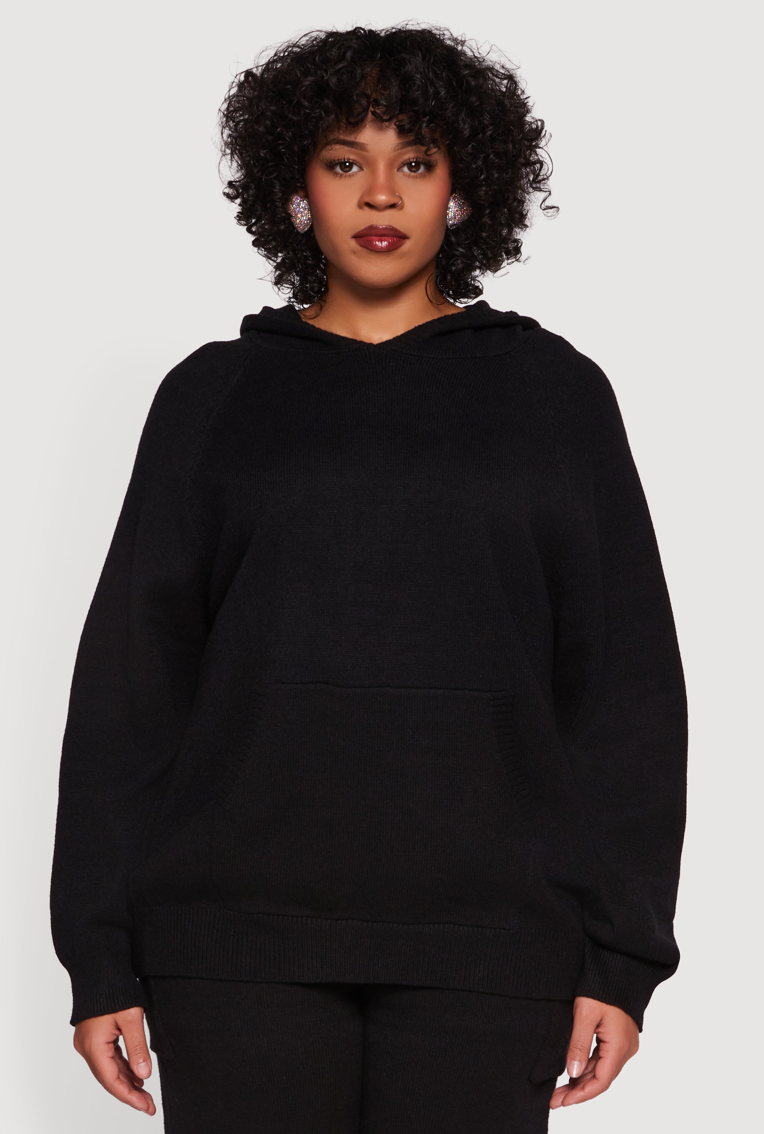 Plus Size Kangaroo Pocket Ribbed Knit Sweater Hoodie