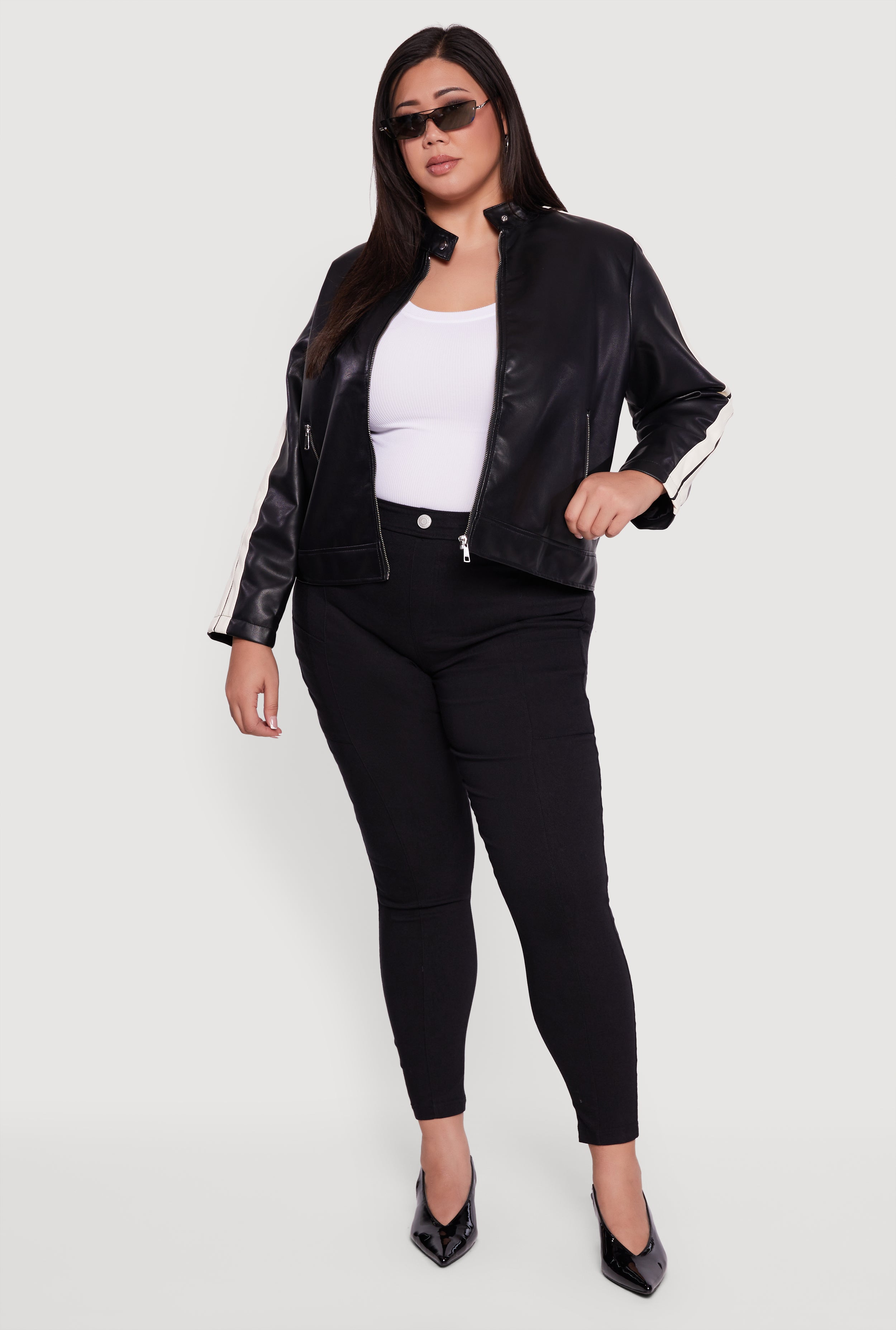 Plus Size Contrast Trim Faux Leather Moto Jacket