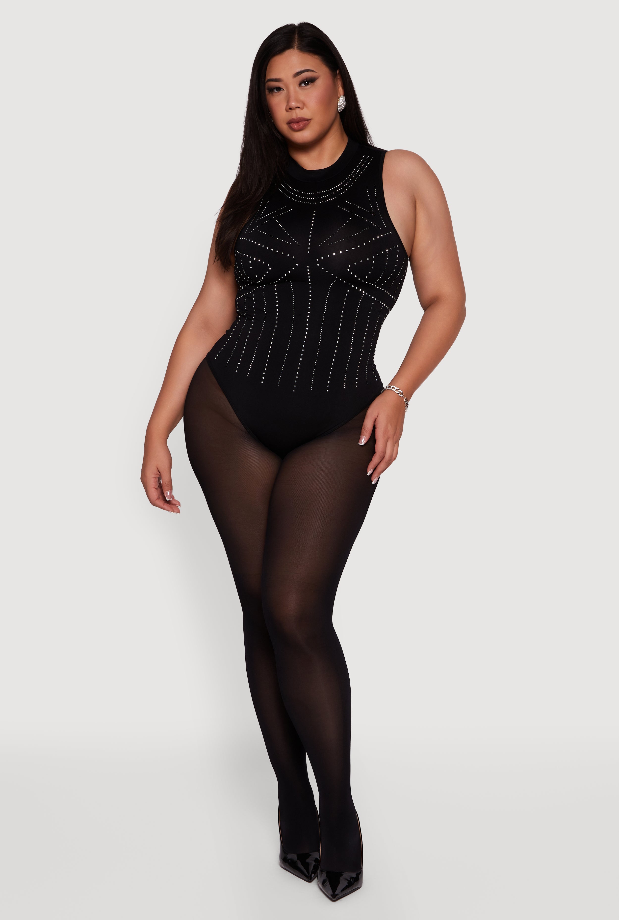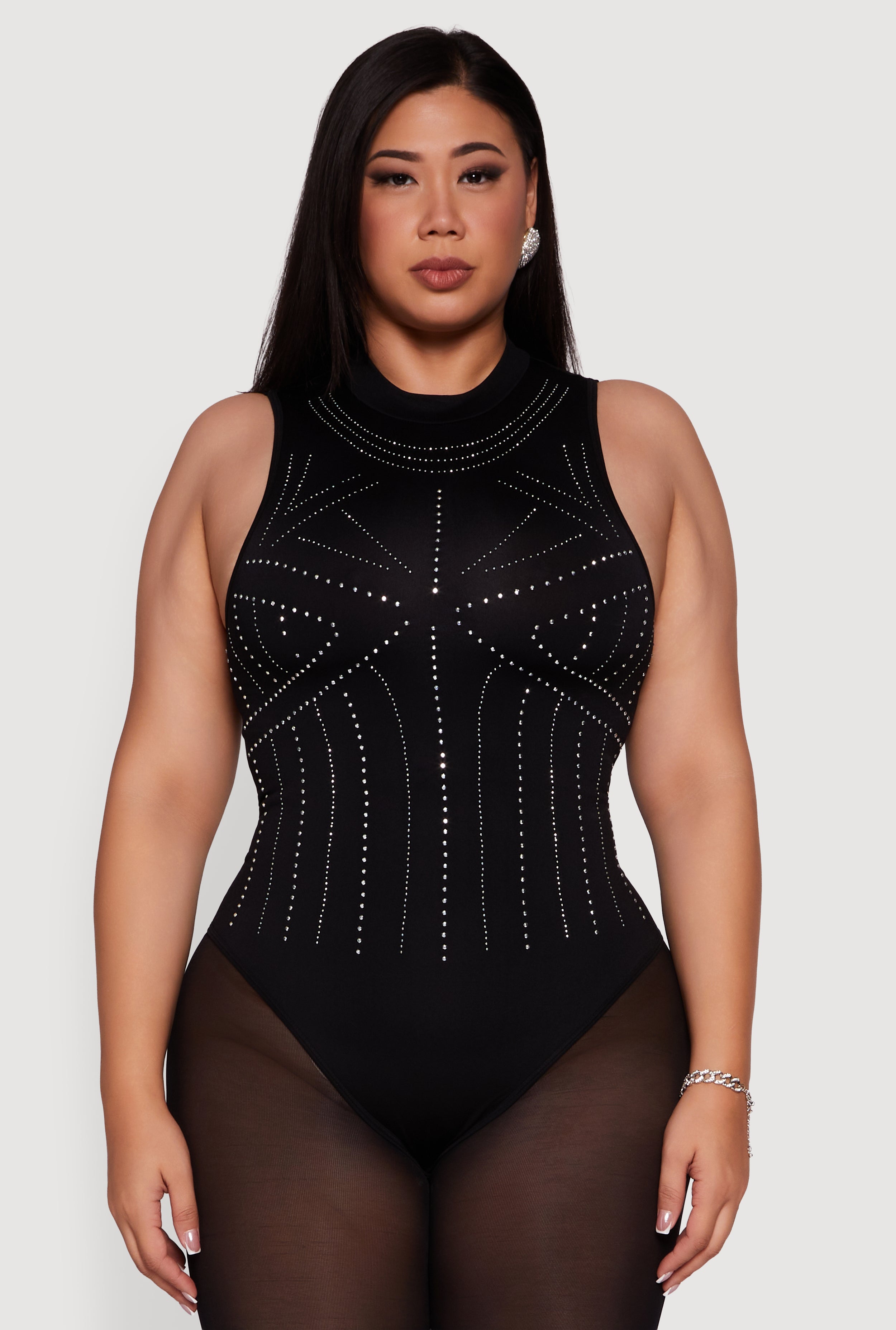 Plus Size Rhinestone Seamless High Neck Bodysuit