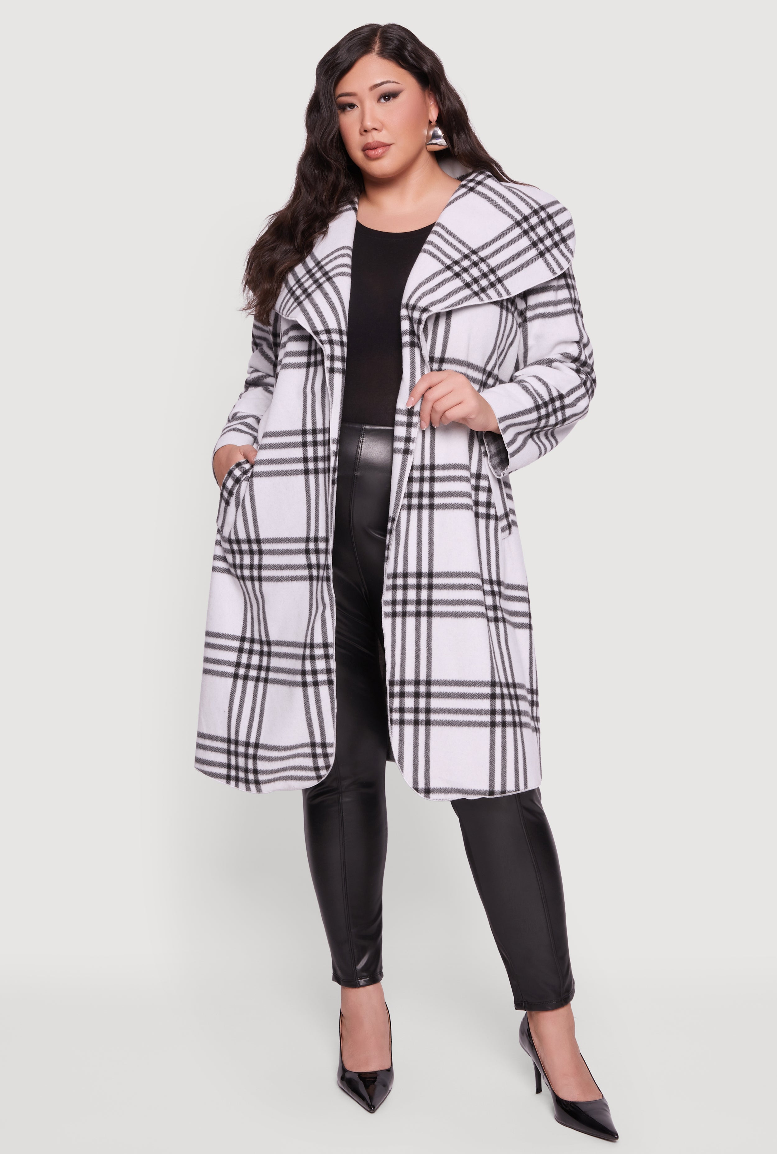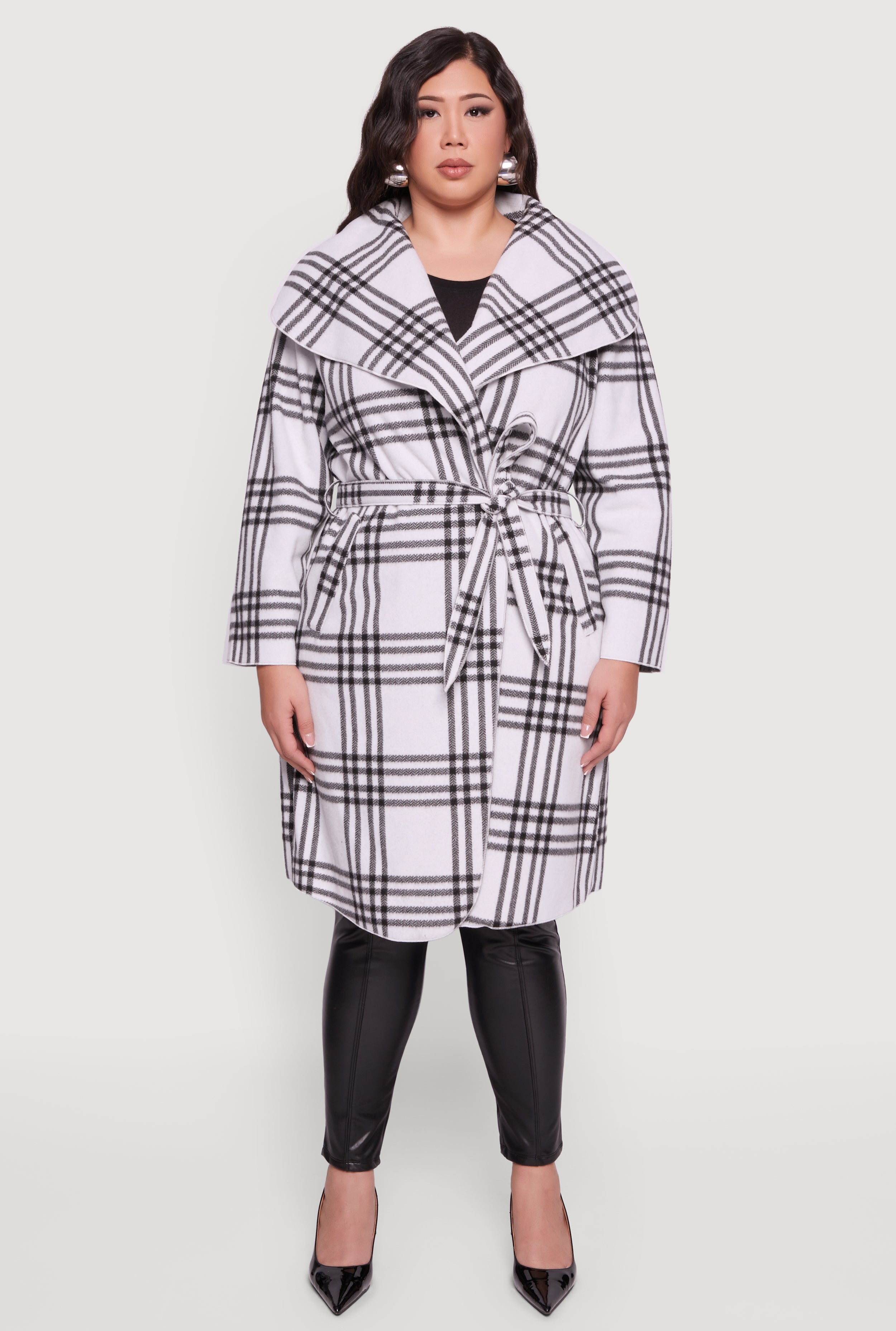 Plus Size Plaid Fleece Wrap Coat with Tie Waist Belt