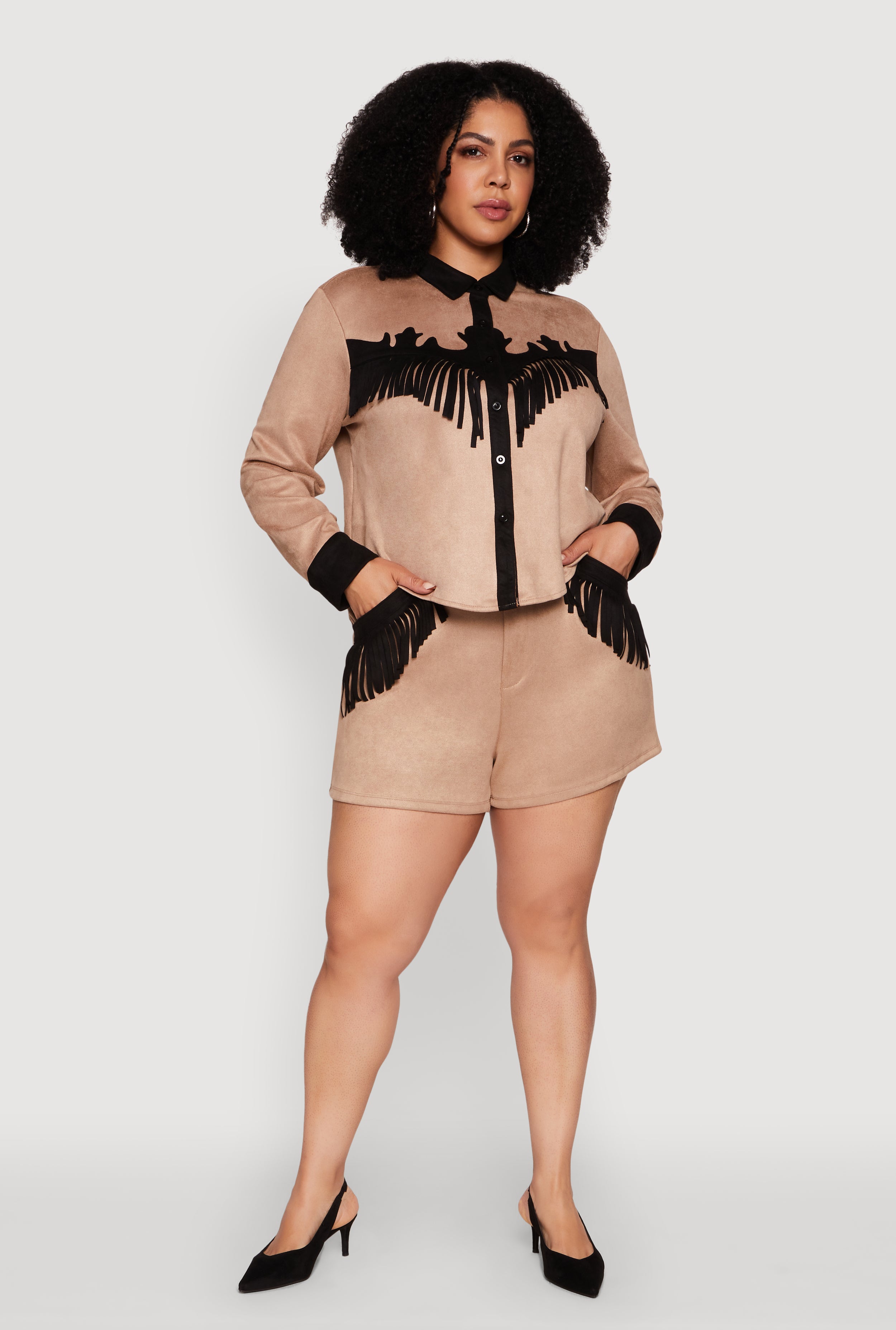 Plus Size Faux Suede High Waisted Fringe Hem Shorts