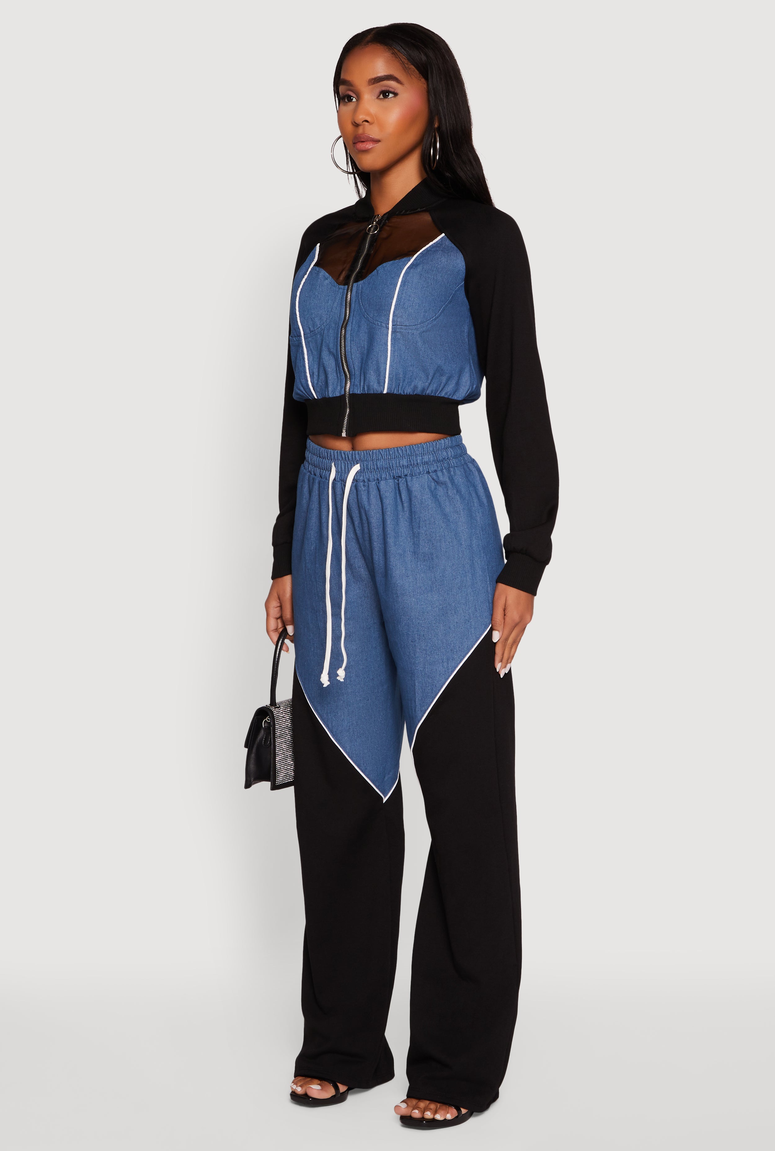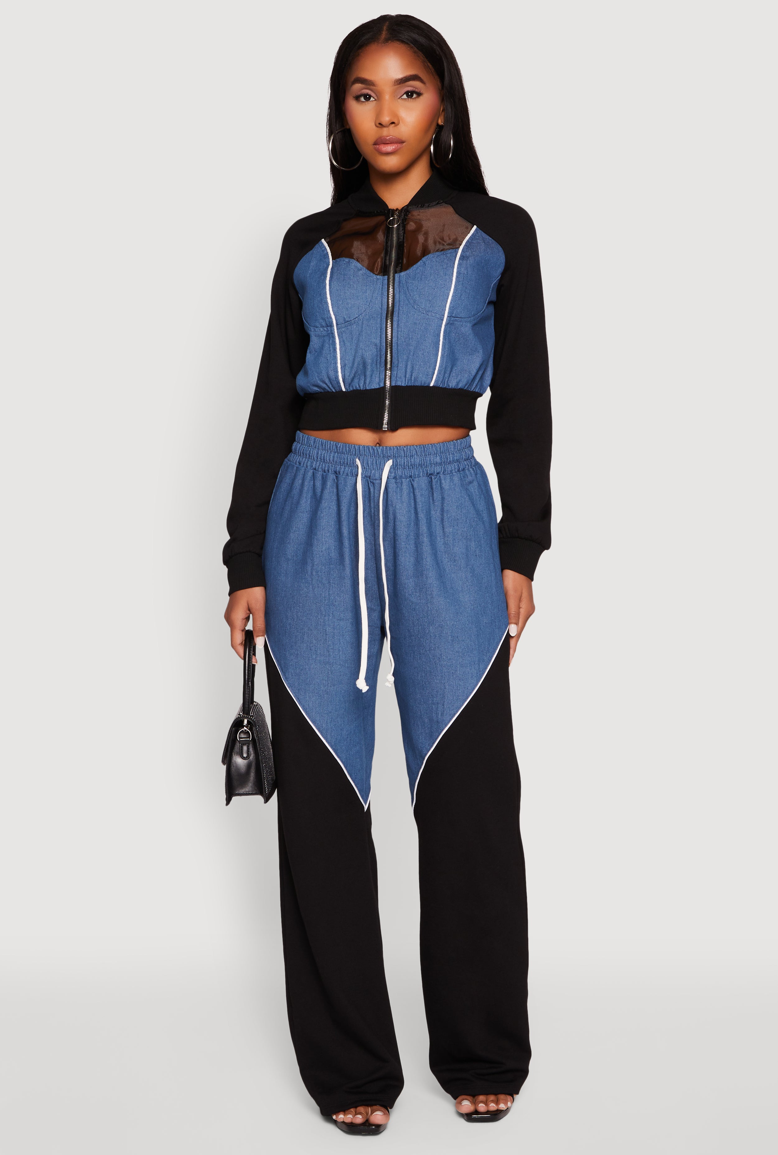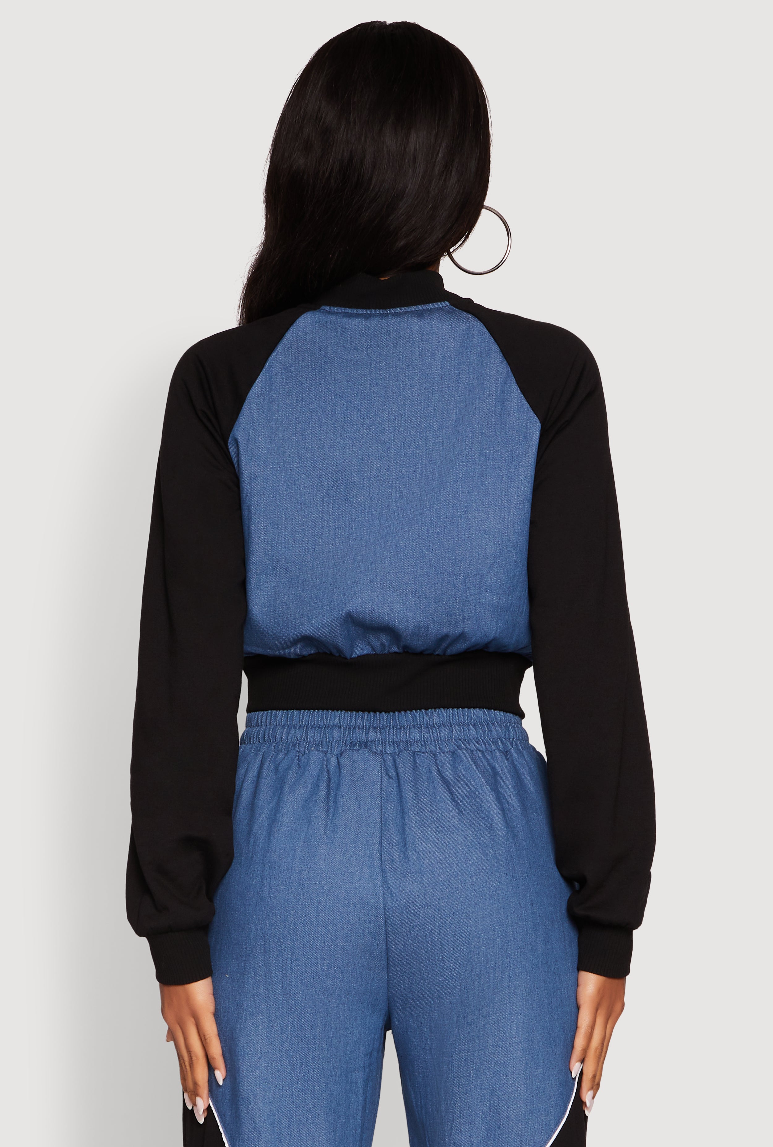 Step up your style game with this Color Block Sheer Insert Bustier Detail Bomber Jacket. Perfect for those who love mixing edgy and casual vibes, this jacket features a sleek O-ring zip front and playful sheer trim details that add just the right amount of flair. Made from comfy denim and fleece, it’s your new go-to for athleisure looks that turn heads without trying too hard. Whether you’re hitting the streets or chilling with friends, this cropped bomber brings effortless cool to every outfit.