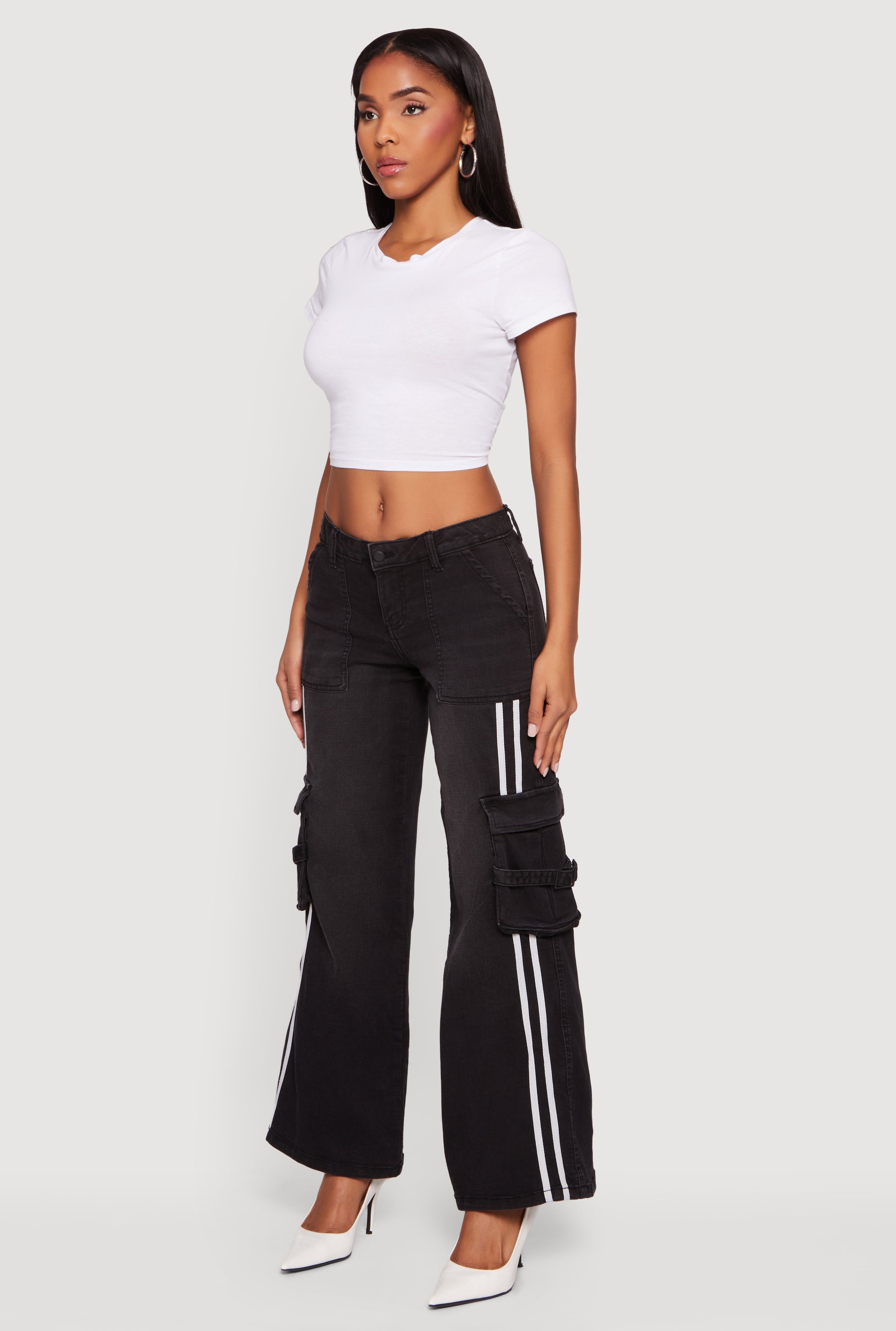 Step up your denim game with these Varsity Stripe Cargo Pocket Flare Leg Jeans. Designed for the trend-savvy woman who loves a mix of sporty vibes and streetwear edge, these jeans feature a flattering mid rise and a modern fit that hugs your curves just right. The standout varsity stripe detail adds a playful pop, while the cargo pockets bring functional style to your everyday look. Perfect for casual days when you want to feel comfortable but still turn heads.