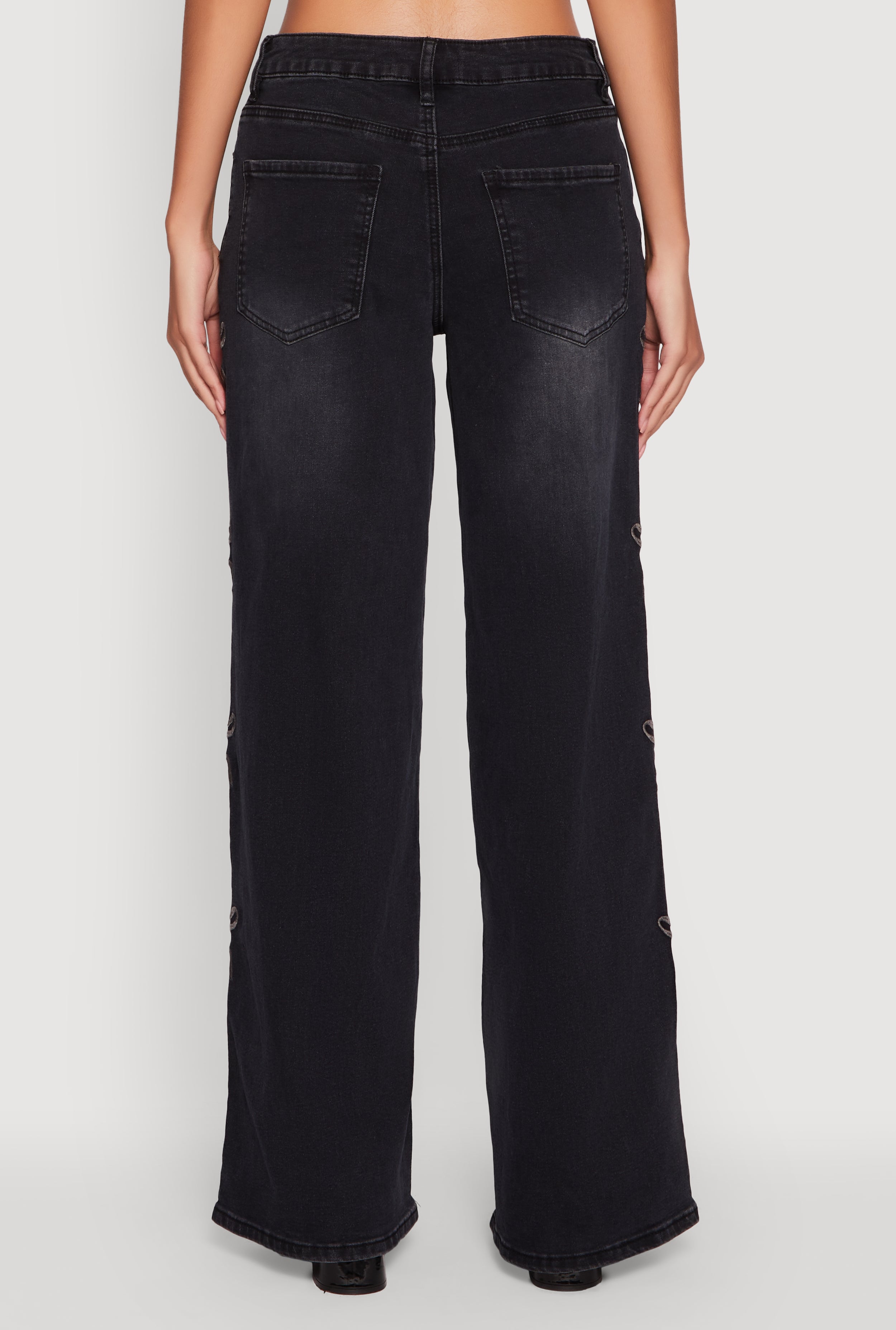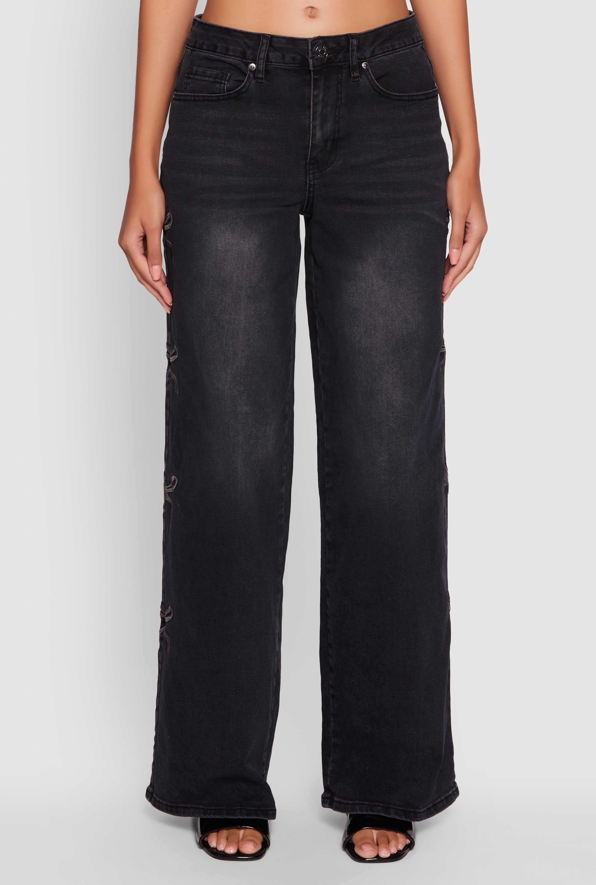 Step up your denim game with the Mineral Wash Embroidered Bow Side Jeans. These mid-rise, straight-leg jeans bring a fresh twist to your casual wardrobe with their unique embroidered bow details running down the sides. The classic fit and full-length cut make them perfect for streetwear vibes or laid-back days when comfort meets style. The mineral wash and acid wash pattern add that effortlessly cool, vintage-inspired look you'll want to wear on repeat.