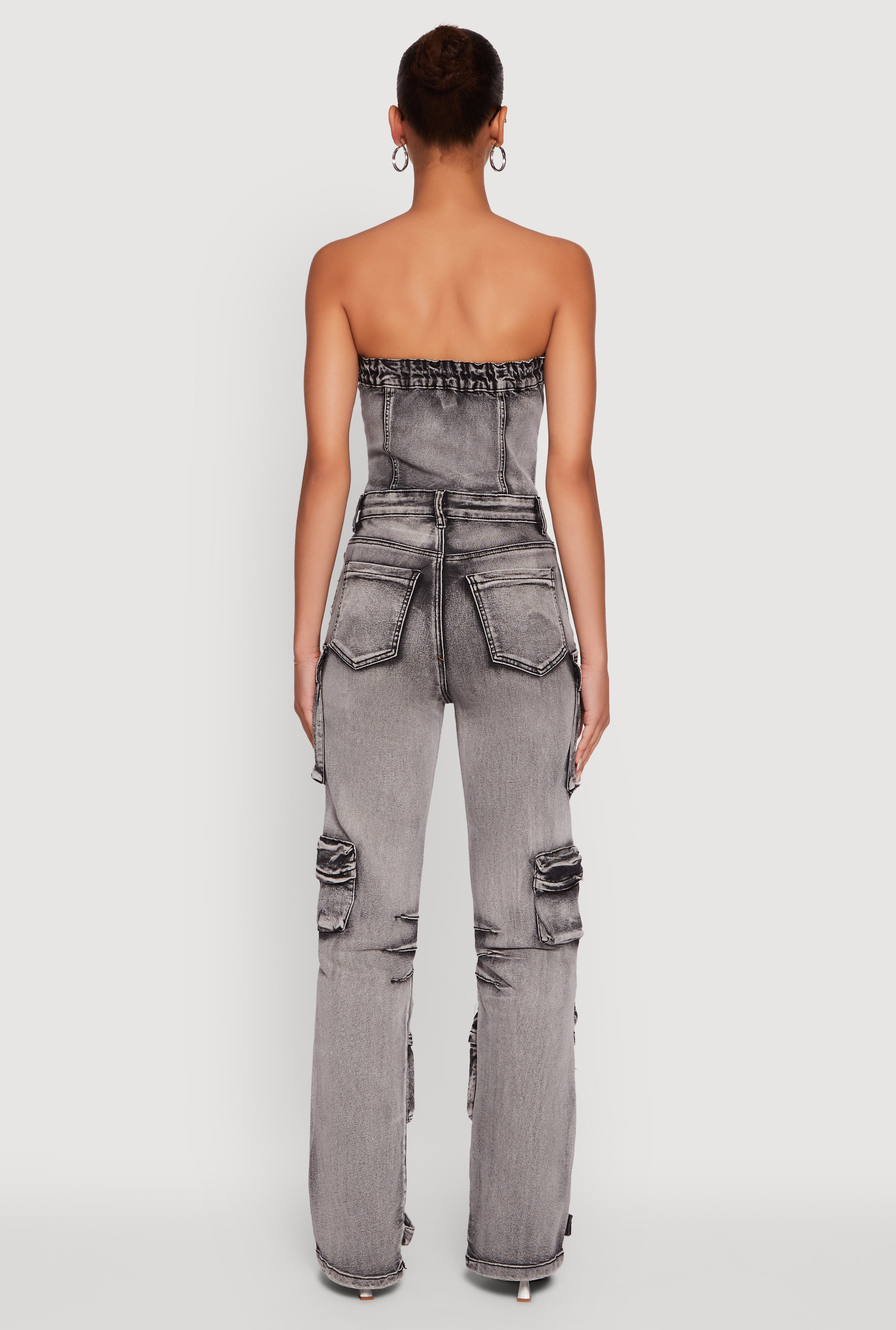 Acid Wash Denim Multi Cargo Pocket Strapless Jumpsuit