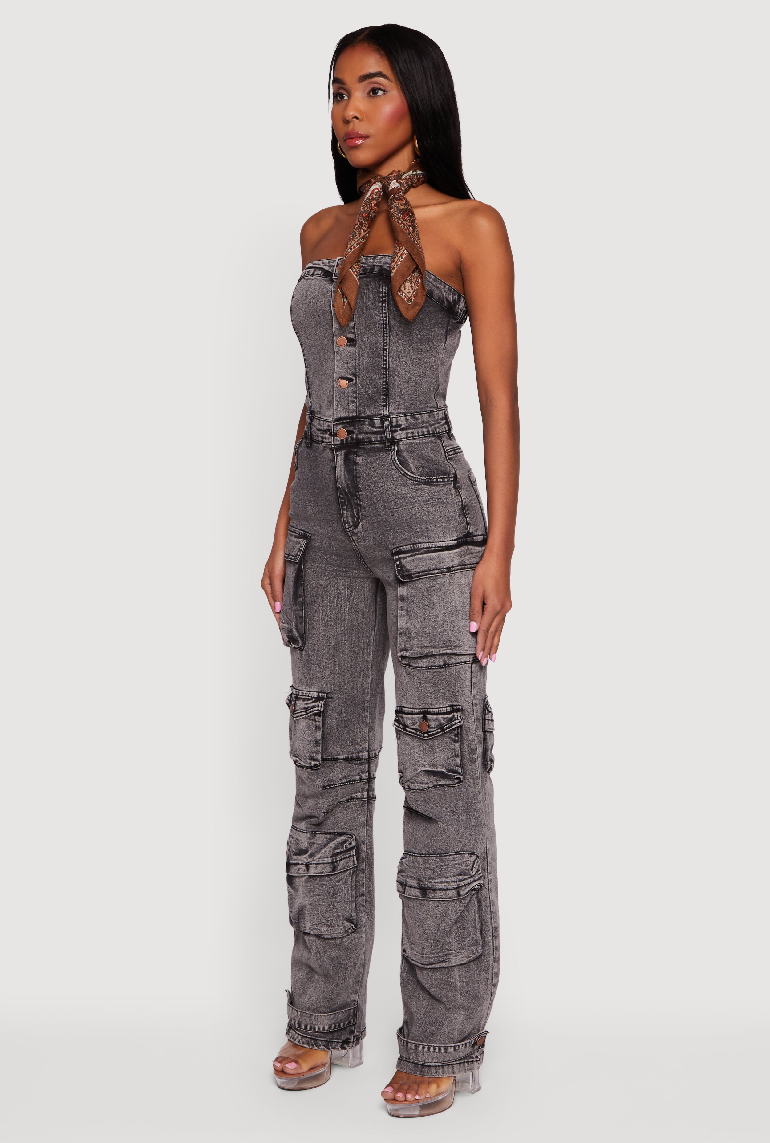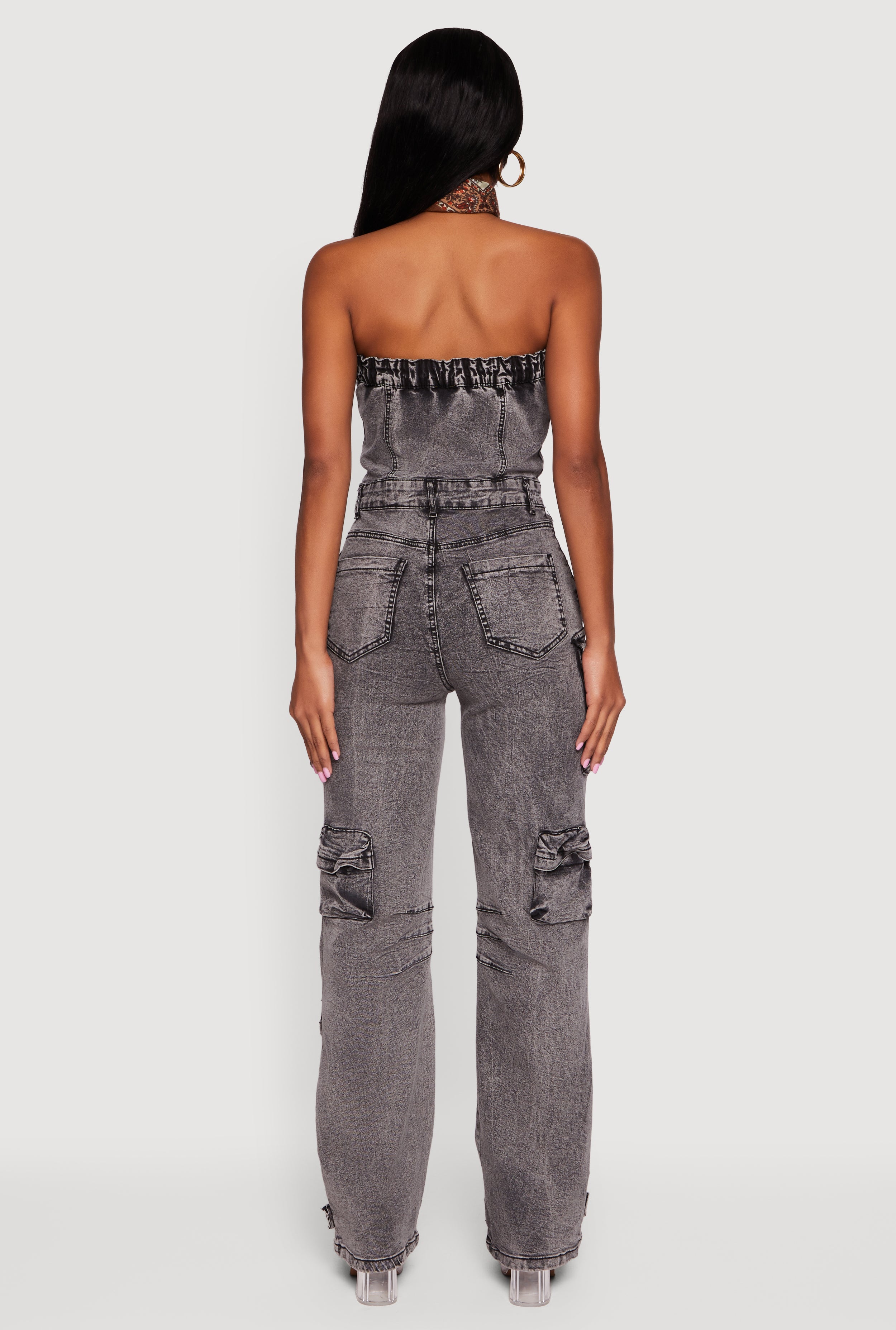Turn heads wherever you go with this Acid Wash Strapless Button Front Utility Jumpsuit. Designed for effortless cool, it features a trendy strapless neckline and a button front that adds a touch of utility-inspired style. The straight leg denim silhouette offers a flattering fit while the open back keeps things flirty and fresh. Perfect for festivals, nights out, or parties, this jumpsuit combines comfort and edge in one statement-making piece.
