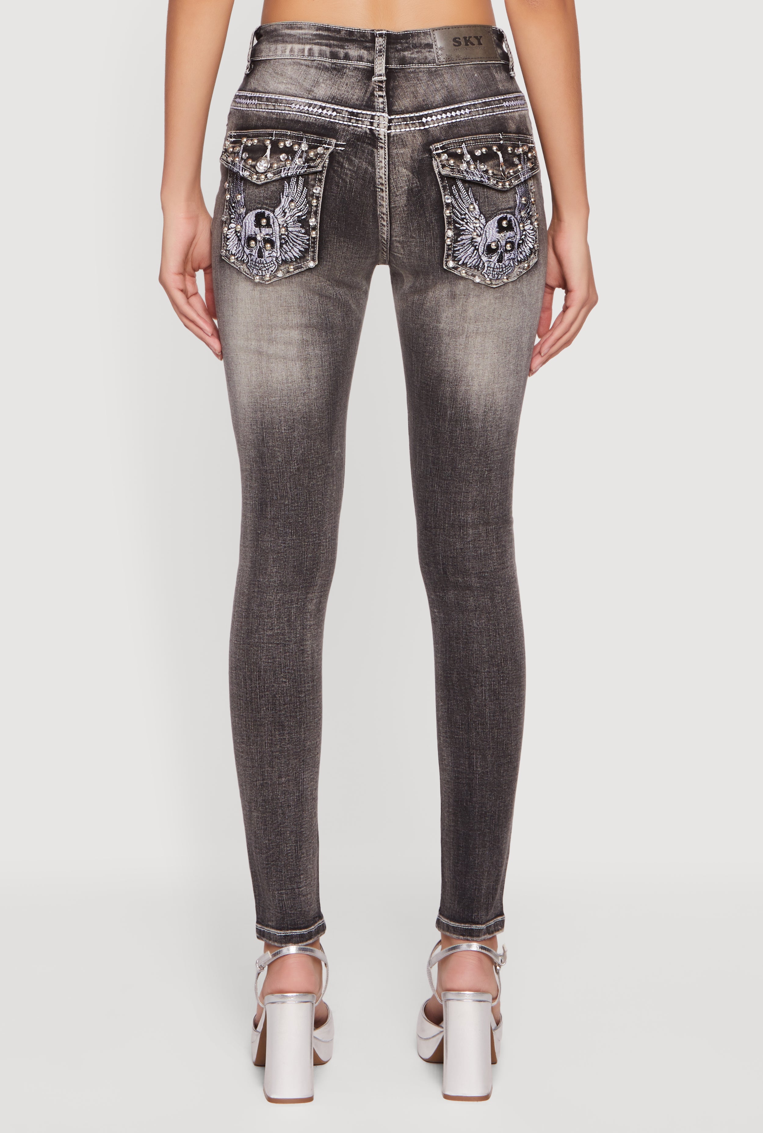 Step up your denim game with these Whiskered Skull Pocket Design Skinny Jeans. Featuring edgy skull pocket graphics and a flattering mid rise, these ankle-length skinny jeans blend casual cool with a touch of rebellious style. Made from comfy denim with whiskered detailing, they are perfect for your everyday adventures or a night out with friends.