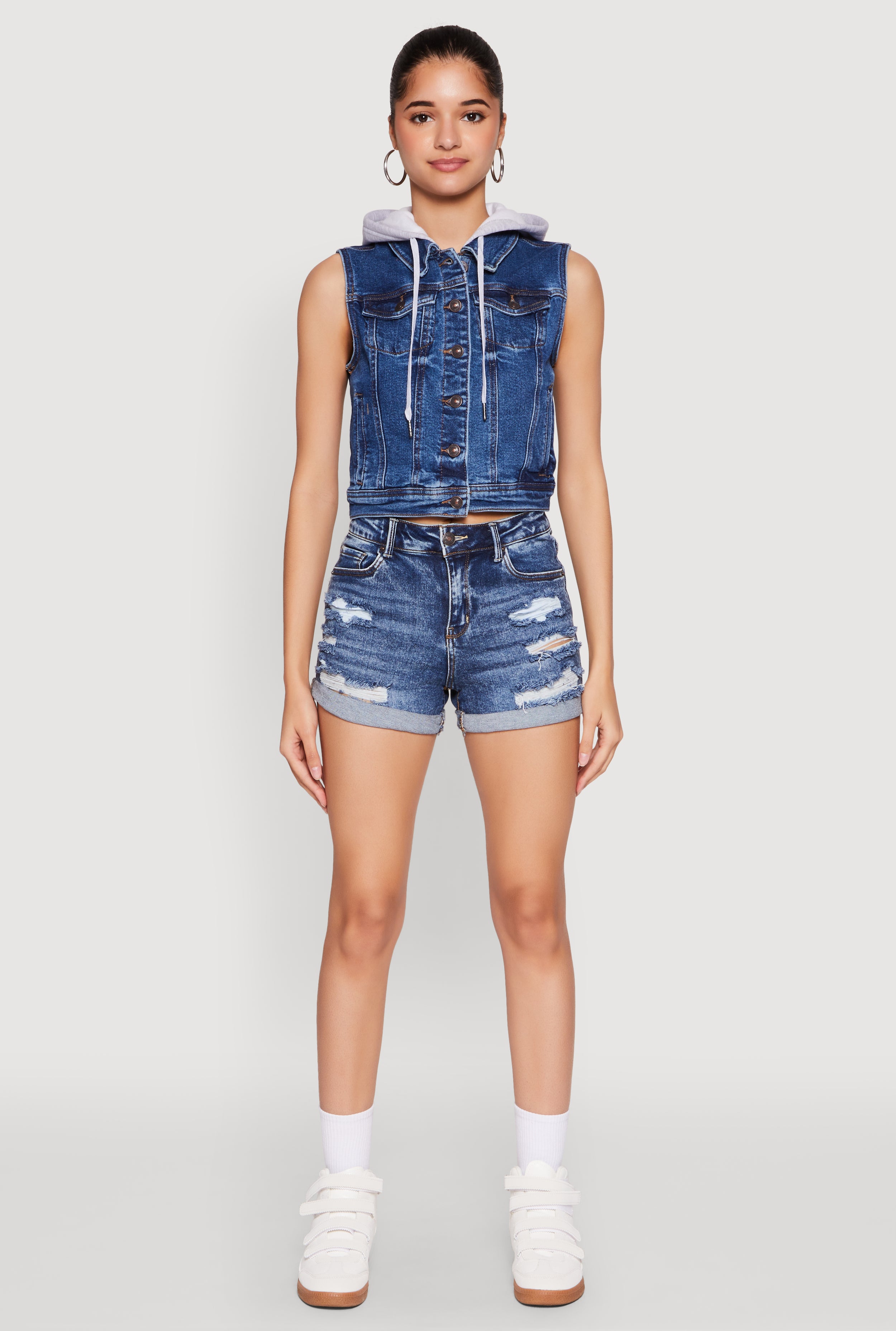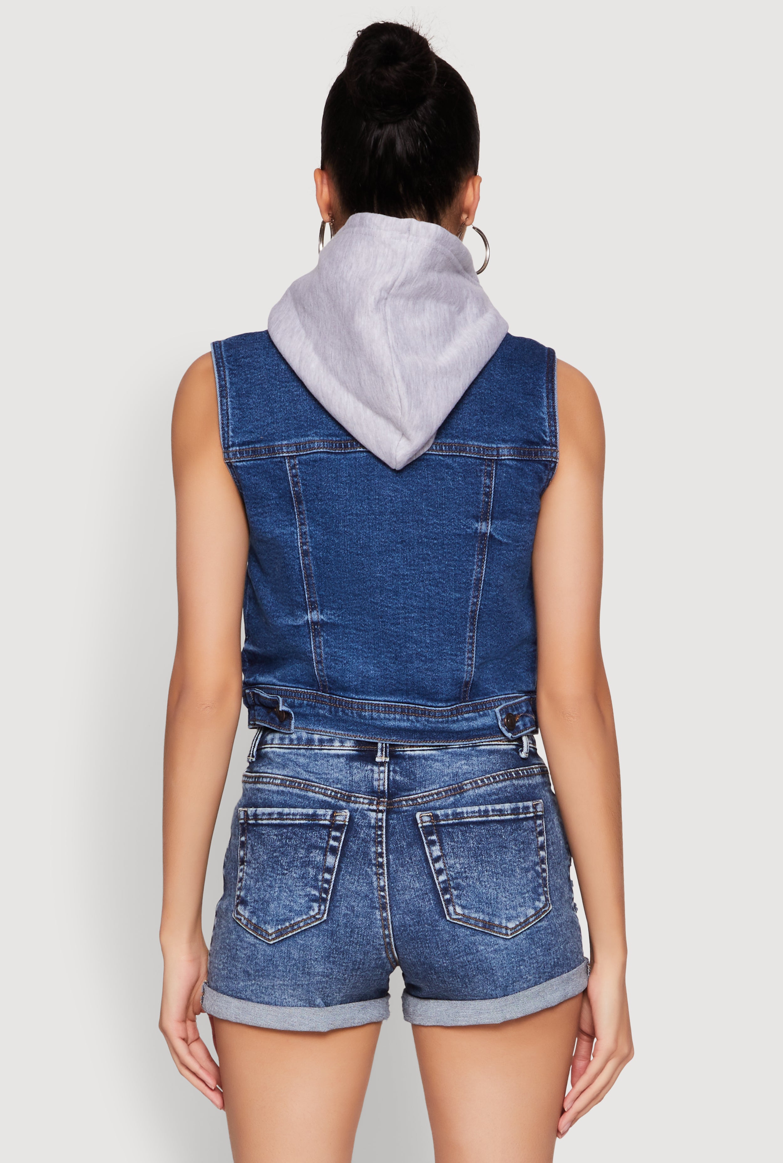 Upgrade your casual look with the WAX Hooded Denim Vest from WAX Jeans. Perfect for layering or making a statement on its own, this sleeveless vest features a trendy cropped hem and a cozy fleece lining that keeps you warm without sacrificing style. Its versatile denim material pairs effortlessly with anything in your wardrobe, making it a must-have for fashion-forward women who love to stand out. Whether you're heading out with friends or just want to add a cool edge to your everyday outfit, this vest is your new go-to piece.