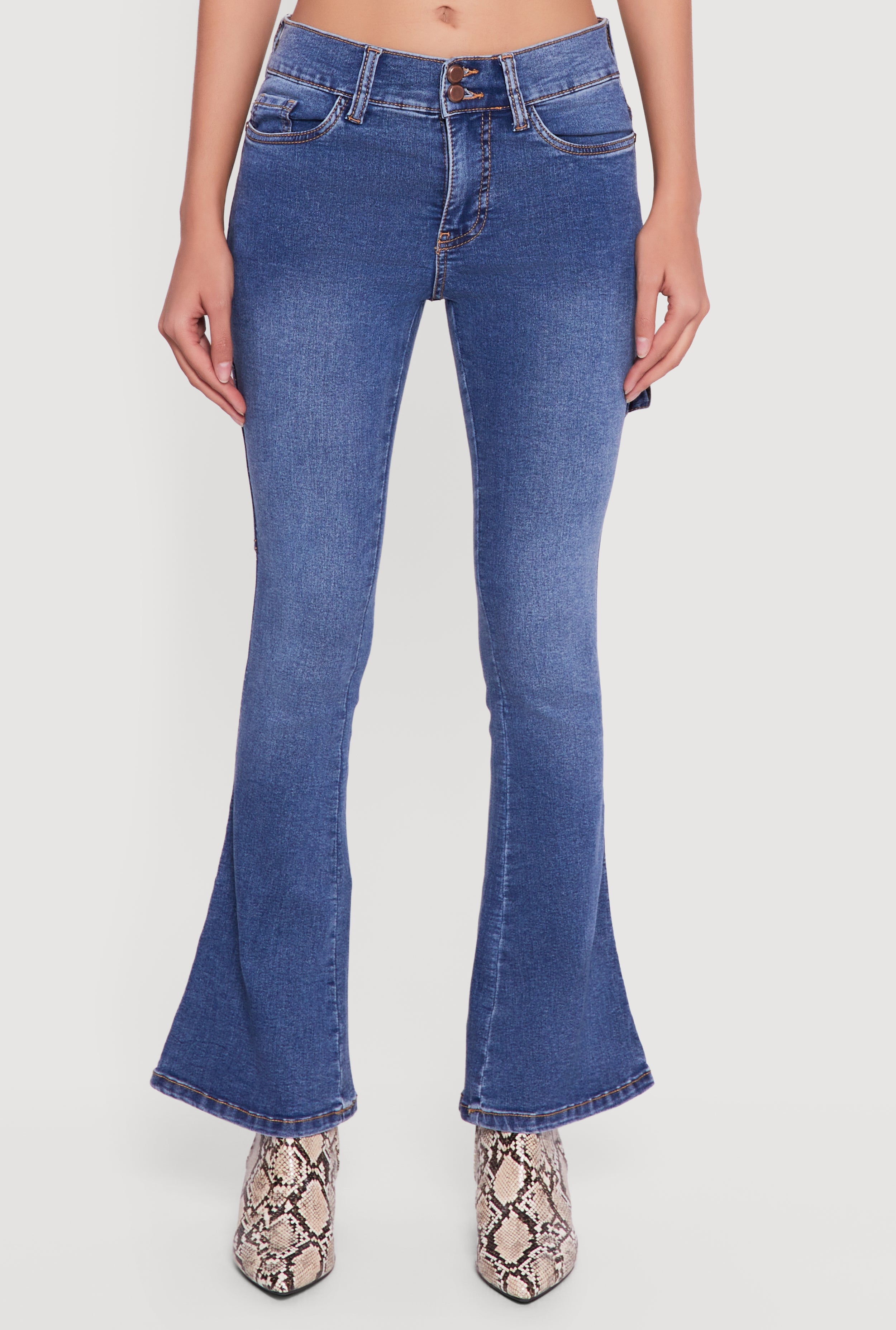 Step up your denim game with these Cell Phone Pocket Mid Rise Stretchy Flare Leg Jeans. Designed for the modern woman who loves style and comfort, these jeans feature a flattering mid rise and a trendy flare leg silhouette that moves with you. Crafted from stretchy denim, they offer all-day comfort while the handy cell phone pocket keeps your essentials close without the bulk. Perfect for casual days when you want to look effortlessly cool and feel confident.