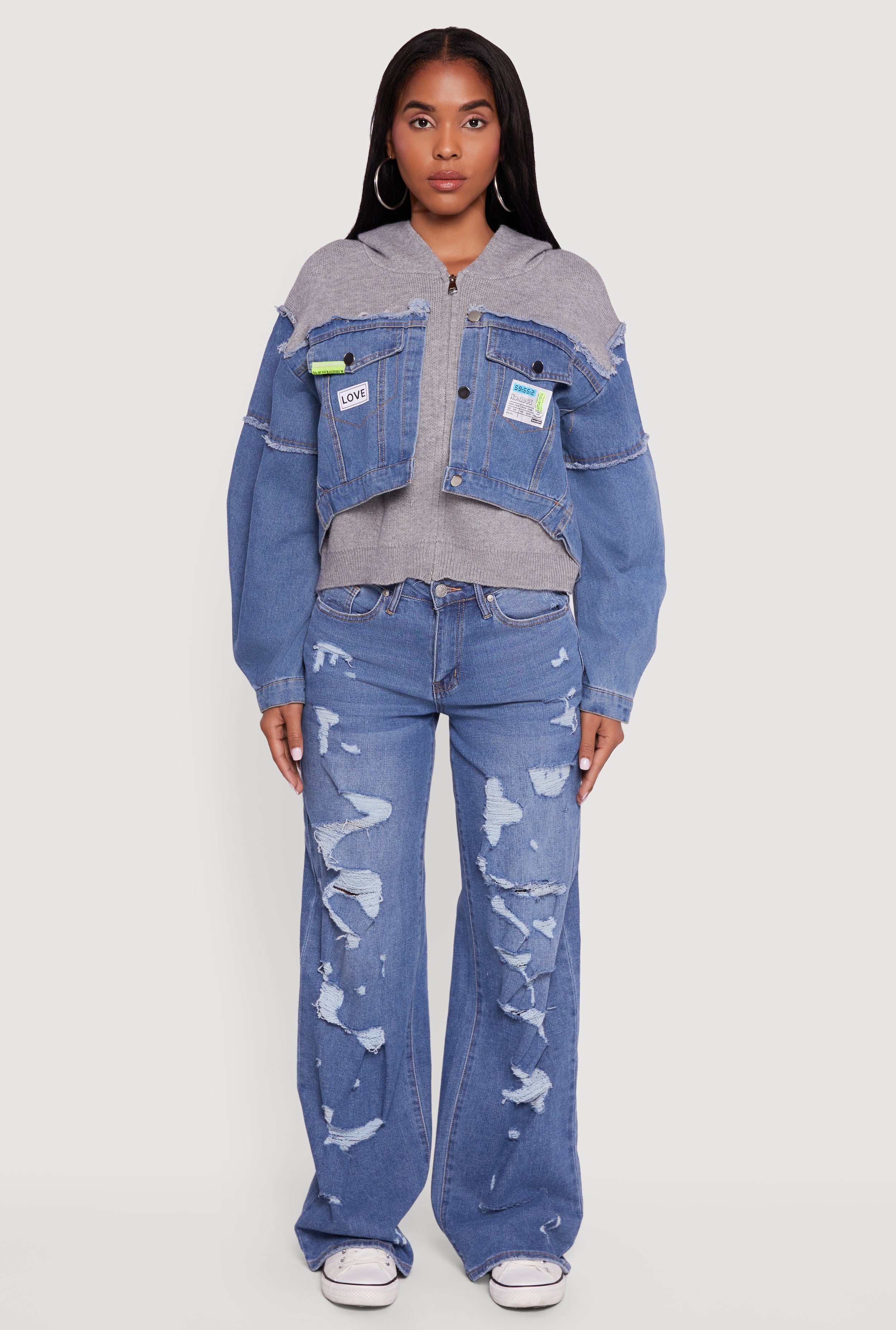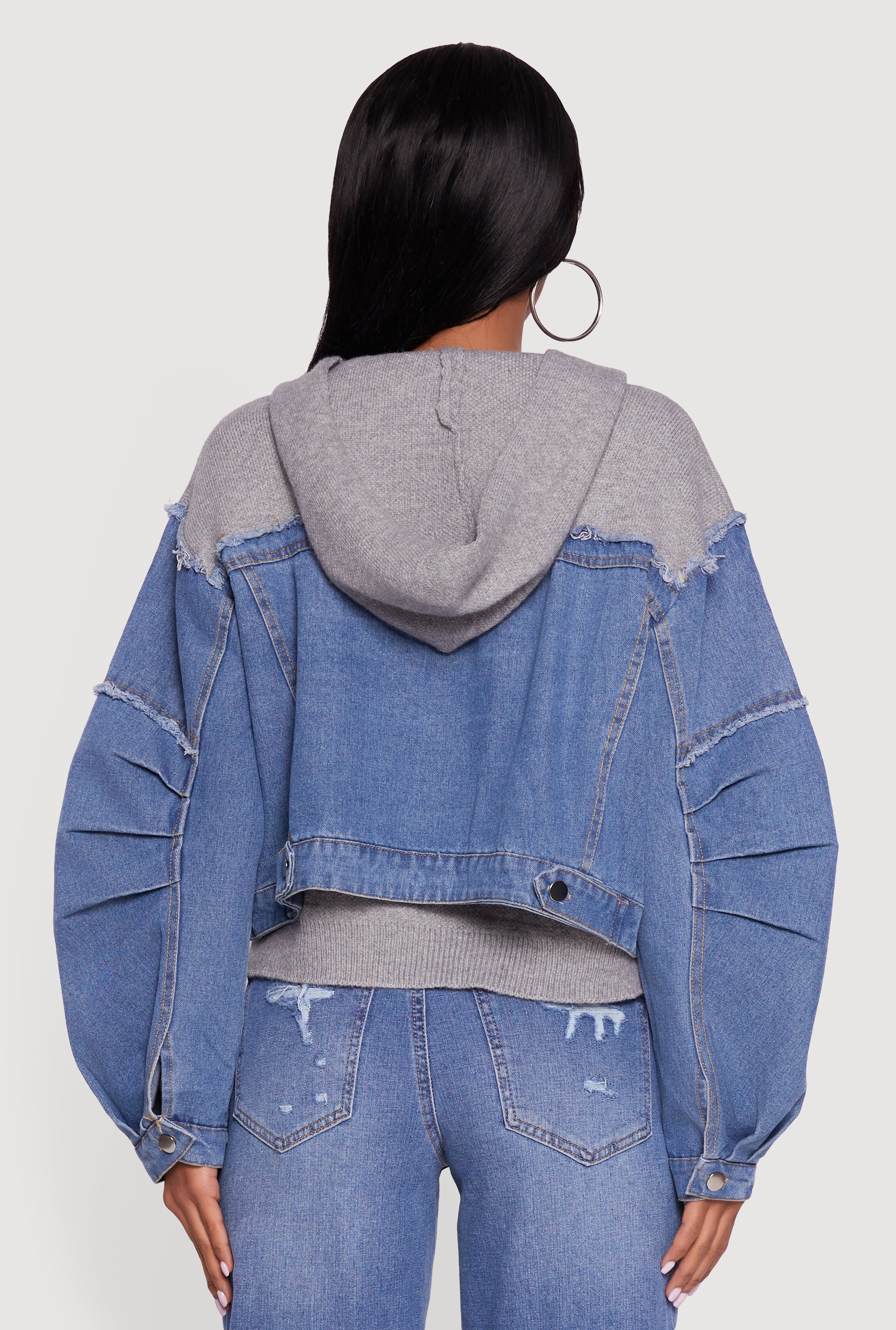 Upgrade your casual wardrobe with this Hooded Sweater Insert Layered Look Denim Jacket. Designed to give you that effortlessly cool, layered vibe without the bulk, it features a cozy hood and trendy barrel sleeves for a fresh twist on classic denim. The color-blocked design with decorative patches and frayed details adds personality and edge, while the zipper closure keeps it easy to wear. Perfect for chill days when you want to stay comfy and stylish all at once.