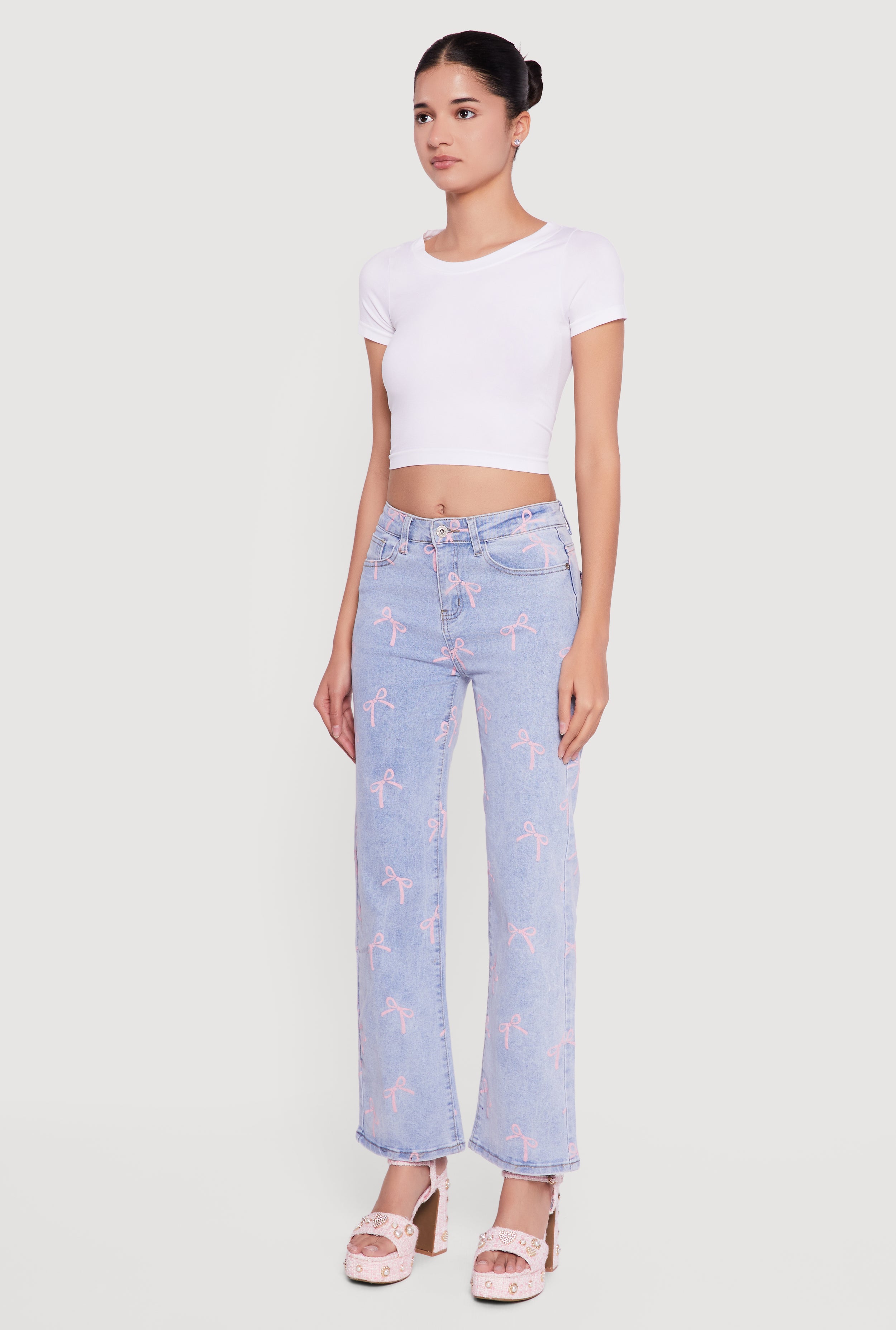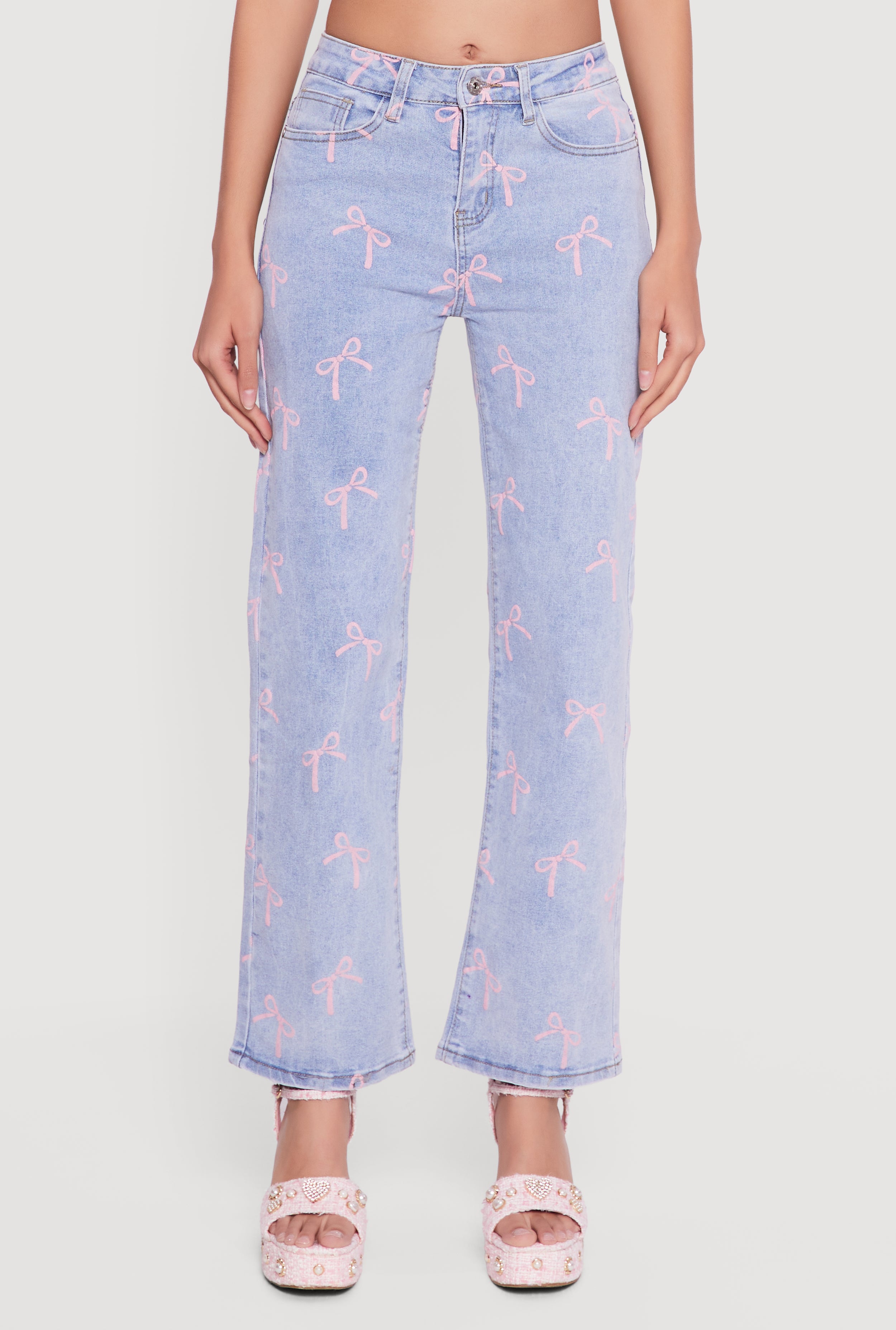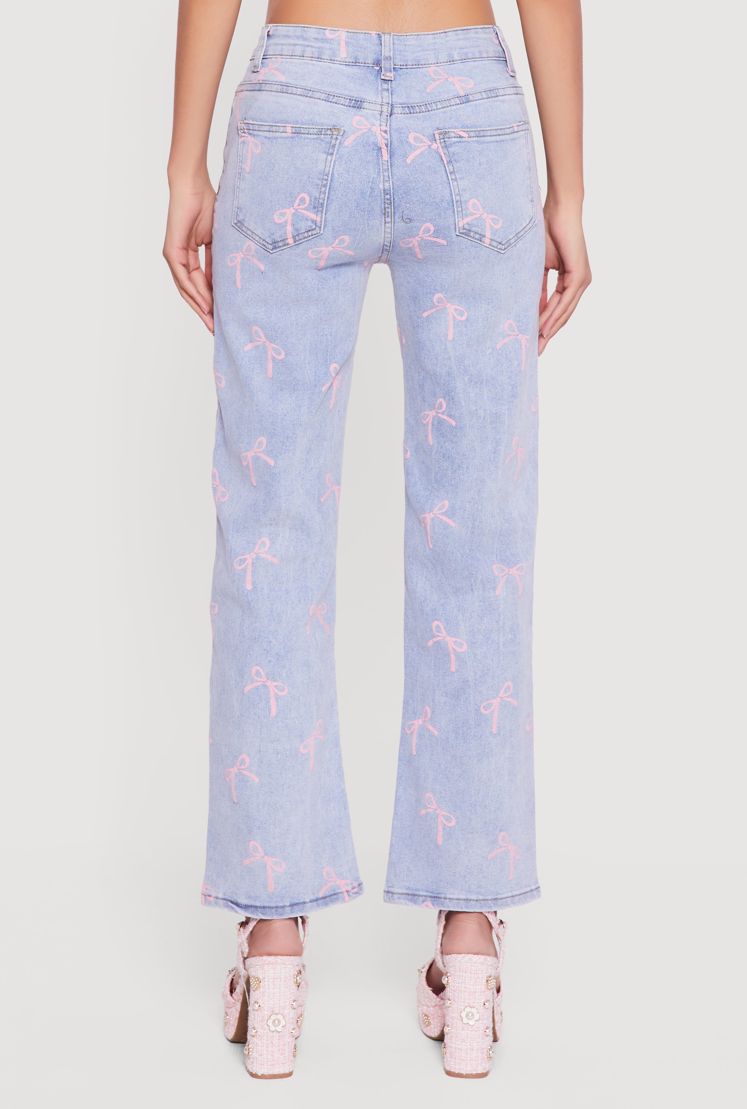 Step up your denim game with these Mid Rise Straight Leg Bow Print Jeans. Crafted from classic denim, they feature a relaxed fit that feels as good as it looks. The playful bow print adds a flirty twist to your everyday casual style, making them perfect for brunch dates, weekend hangouts, or just vibing in style. With a flattering mid rise and full-length straight legs, these jeans blend comfort and trend effortlessly.
