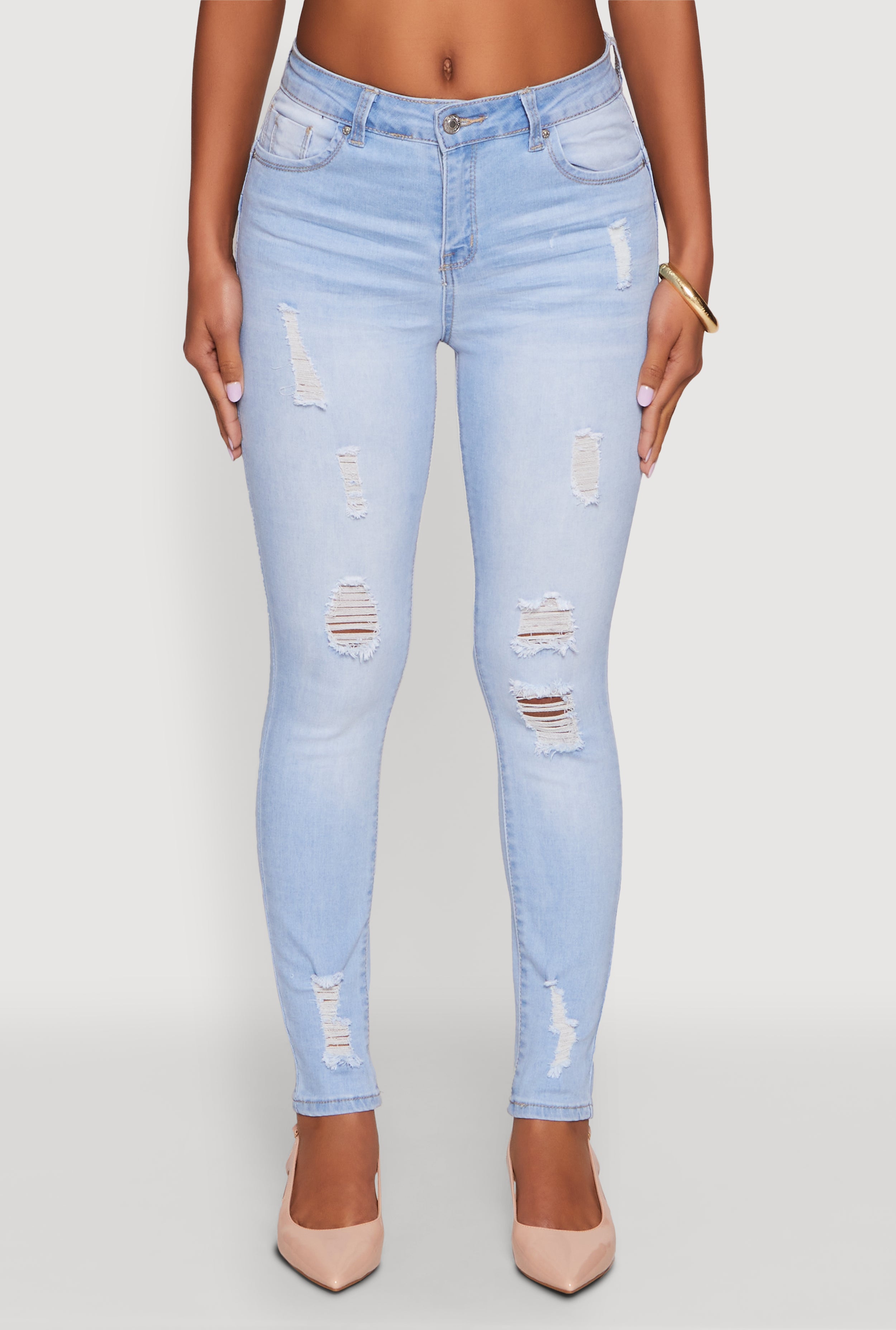 • Distressed and frayed details for a trendy, edgy vibe