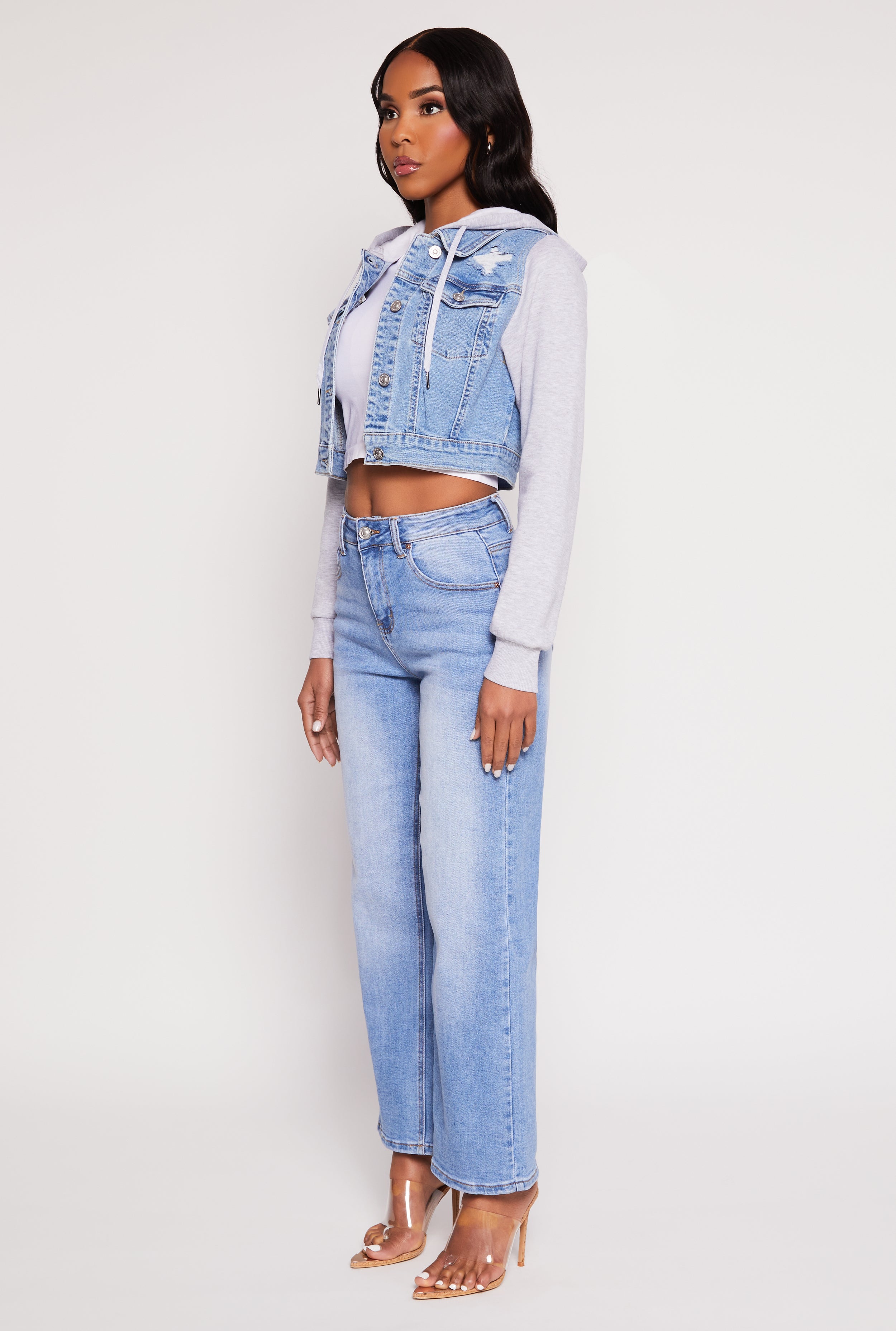 Upgrade your casual wardrobe with the WAX Distressed Hooded Jean Jacket, the perfect blend of edgy style and cozy comfort. Crafted from durable denim lined with soft fleece, this jacket is your go-to for effortless coolness. The cropped hem adds a trendy touch, while the distressed details give it that perfectly worn-in vibe. Whether you're layering it over your favorite tee or pairing it with your go-to jeans, this jacket keeps you looking stylish and feeling comfy all day long.