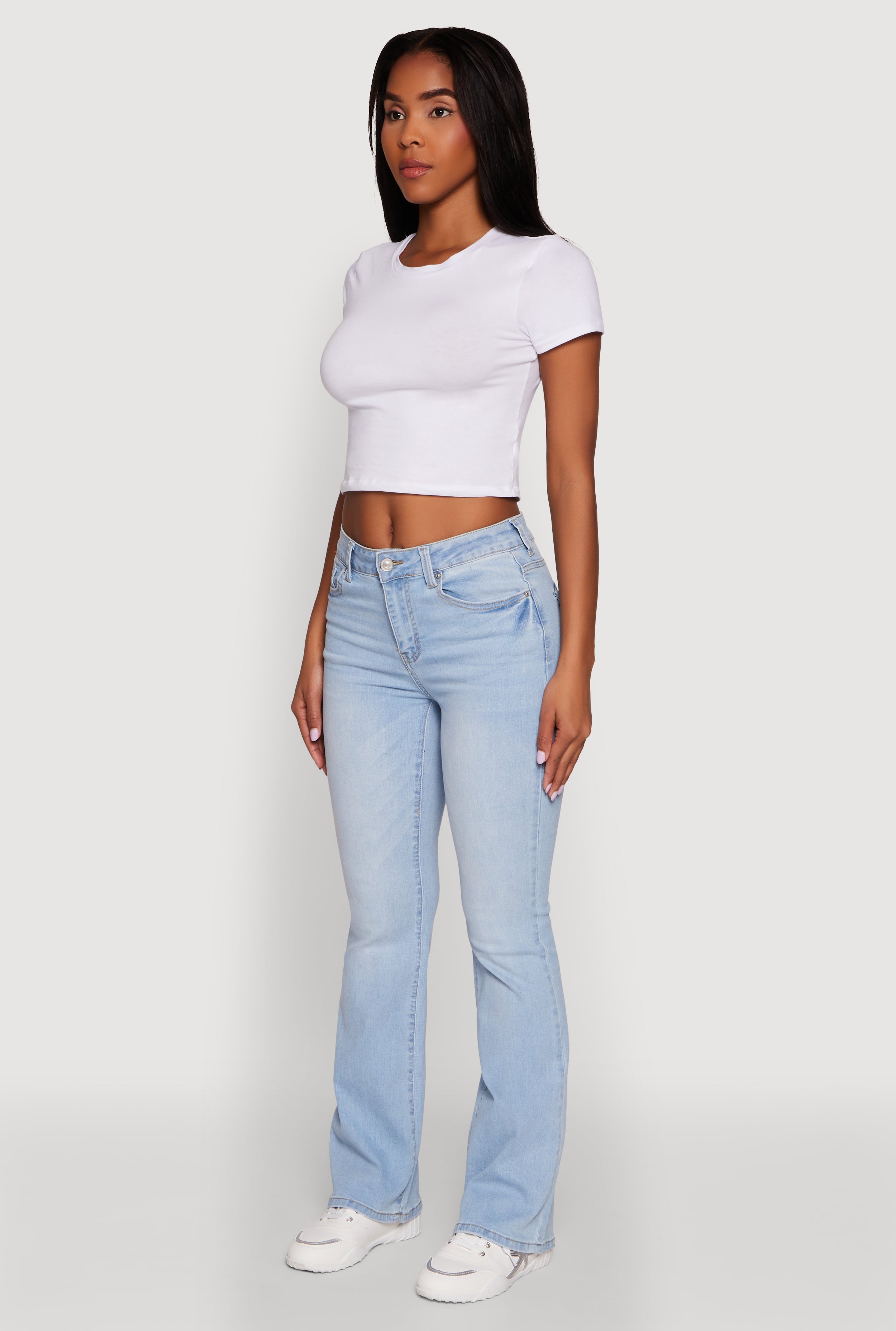 - Mid rise waist for a flattering, easy fit