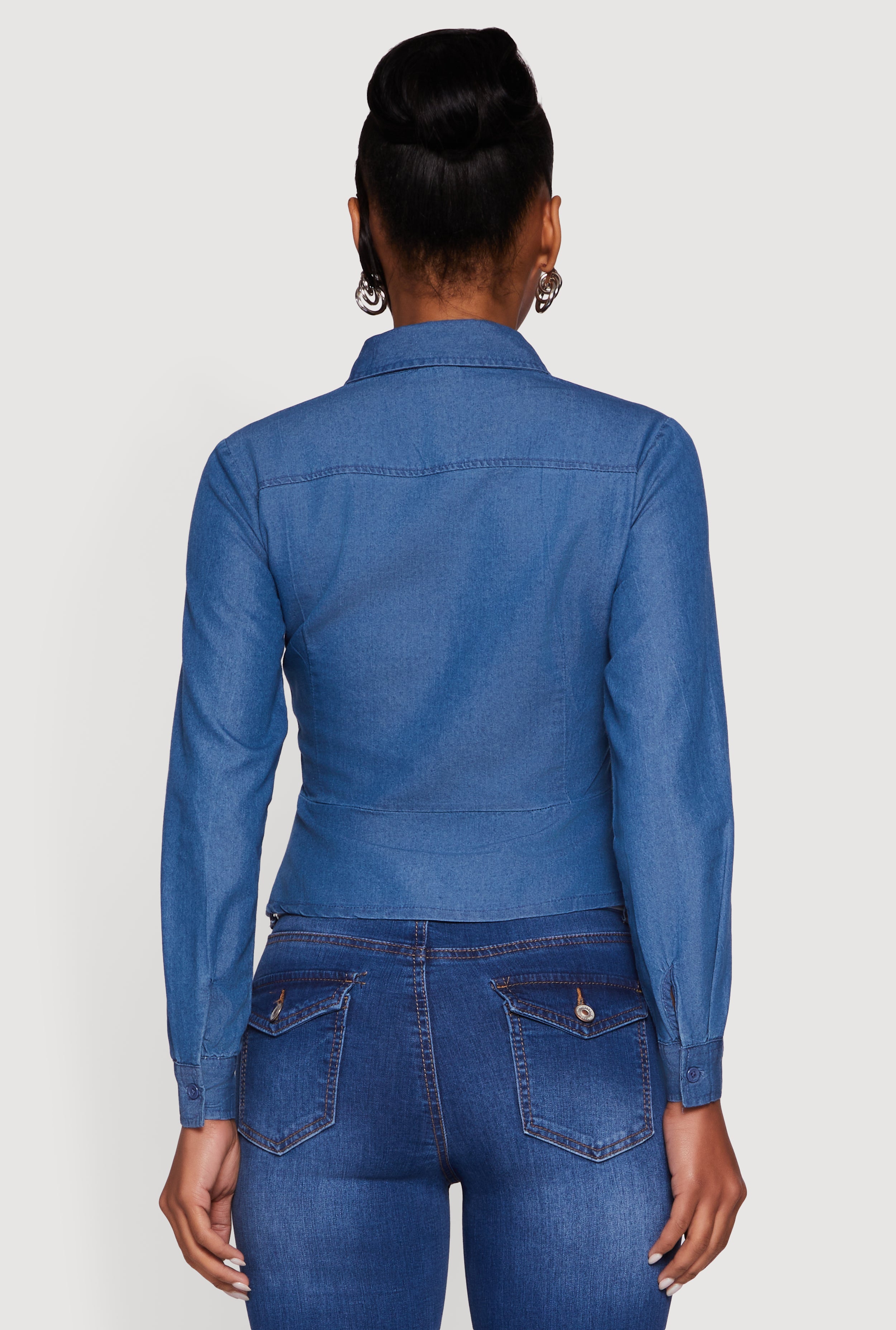 Step up your casual and officewear game with the Chambray Peplum Button Front Shirt. This classic fit shirt combines timeless style with a flattering peplum silhouette that adds a playful twist to your everyday look. Made from soft chambray fabric, it feels as good as it looks and keeps you comfortable all day long. The button front and collar give it a polished finish, perfect for those who want to keep it chill but still put together. Whether you're heading to work or meeting friends, this shirt is your new go-to for effortless style.