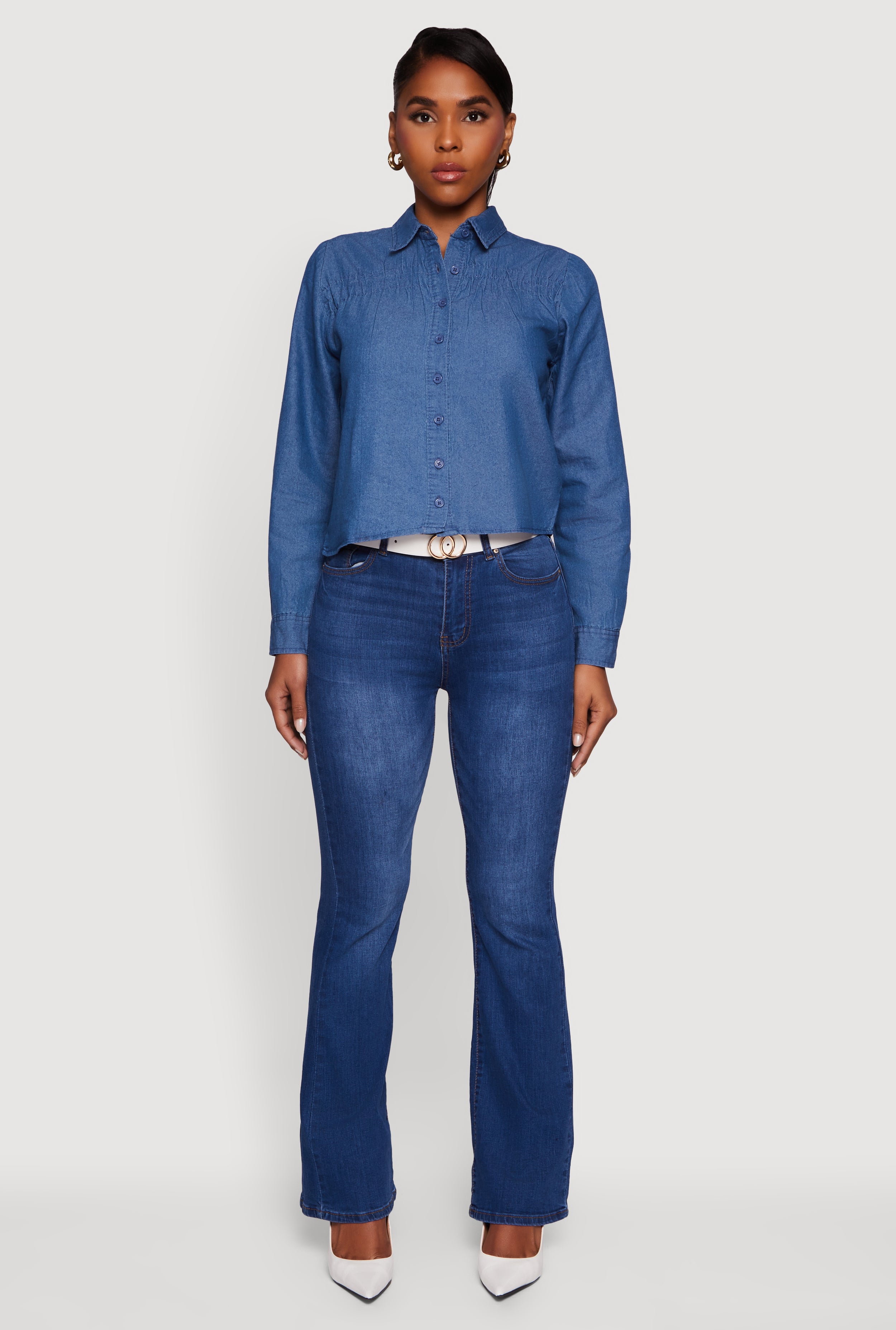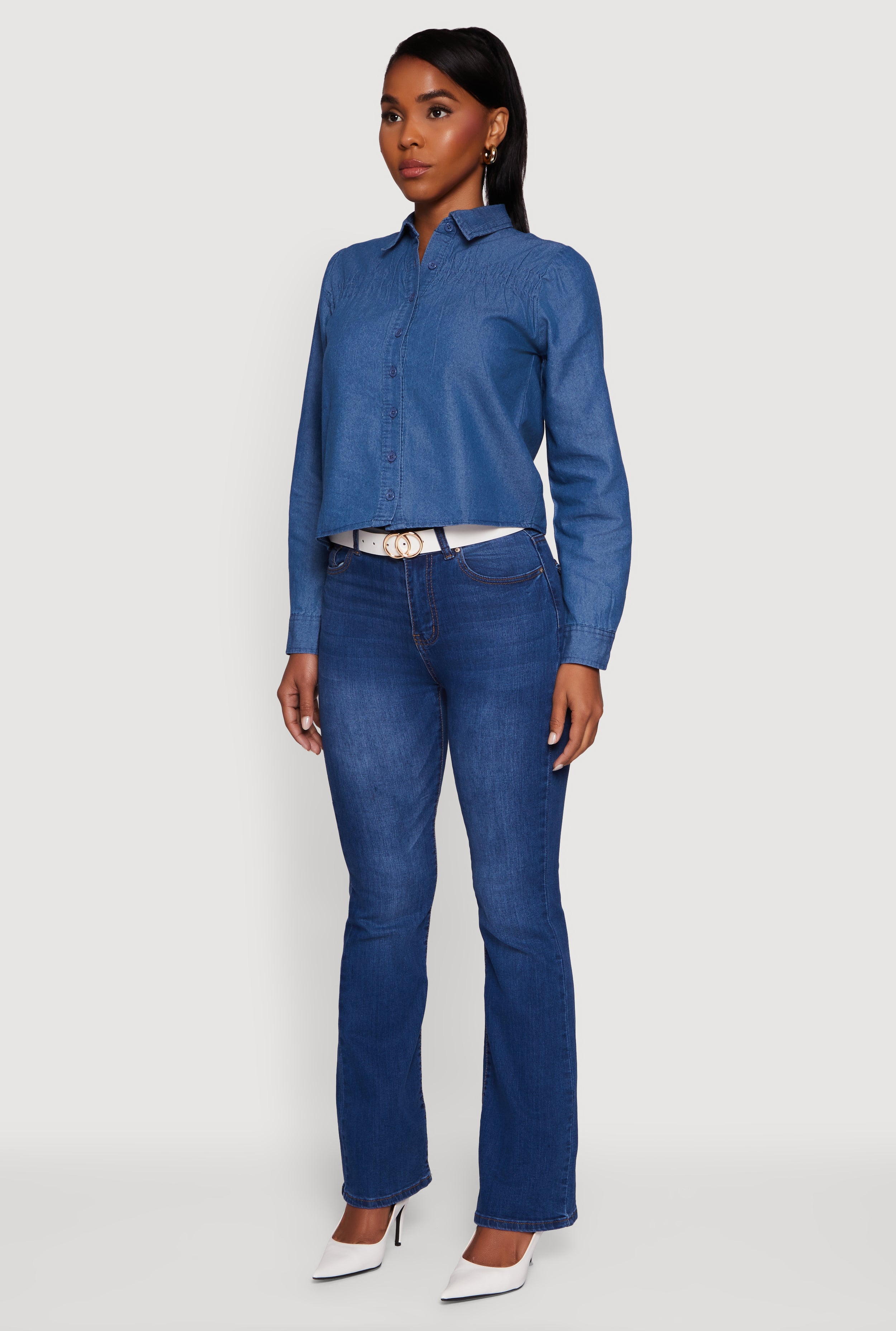 Elevate your everyday look with this Denim Ruched Long Sleeve Button Front Shirt. Designed with a classic fit and timeless shirt collar, it brings effortless style to your casual wardrobe. The subtle ruching adds a trendy twist to a solid denim staple, making it perfect for those who love a little flair without trying too hard. Whether you're out with friends or running errands, this long sleeve shirt keeps you looking cool and comfortable all day long.