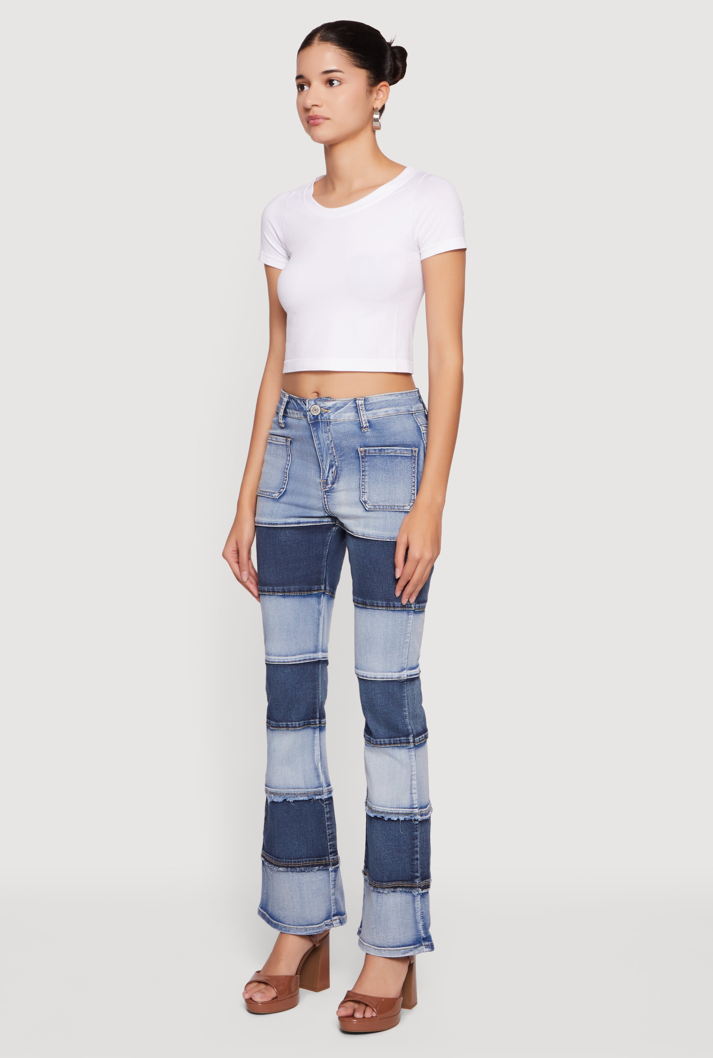 Step up your denim game with these VIP Two Tone Patchwork Flare Jeans. Featuring a trendy color blocked design and a flattering mid rise, these jeans bring a fresh twist to your casual streetwear look. The tiered flare leg adds movement and a cool vintage vibe, while the modern fit ensures comfort and style all day long. Perfect for those who love a little edge with their everyday outfit.