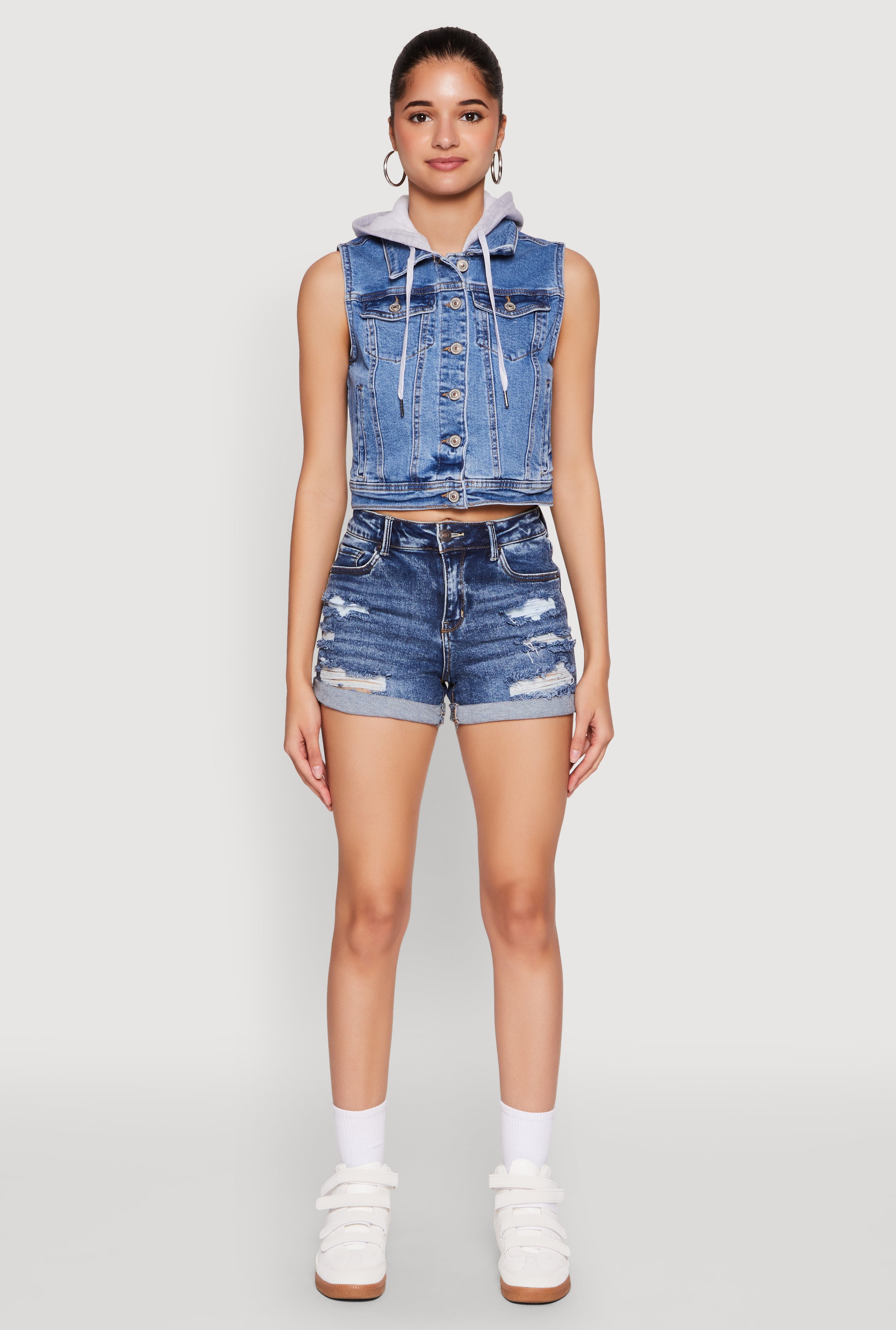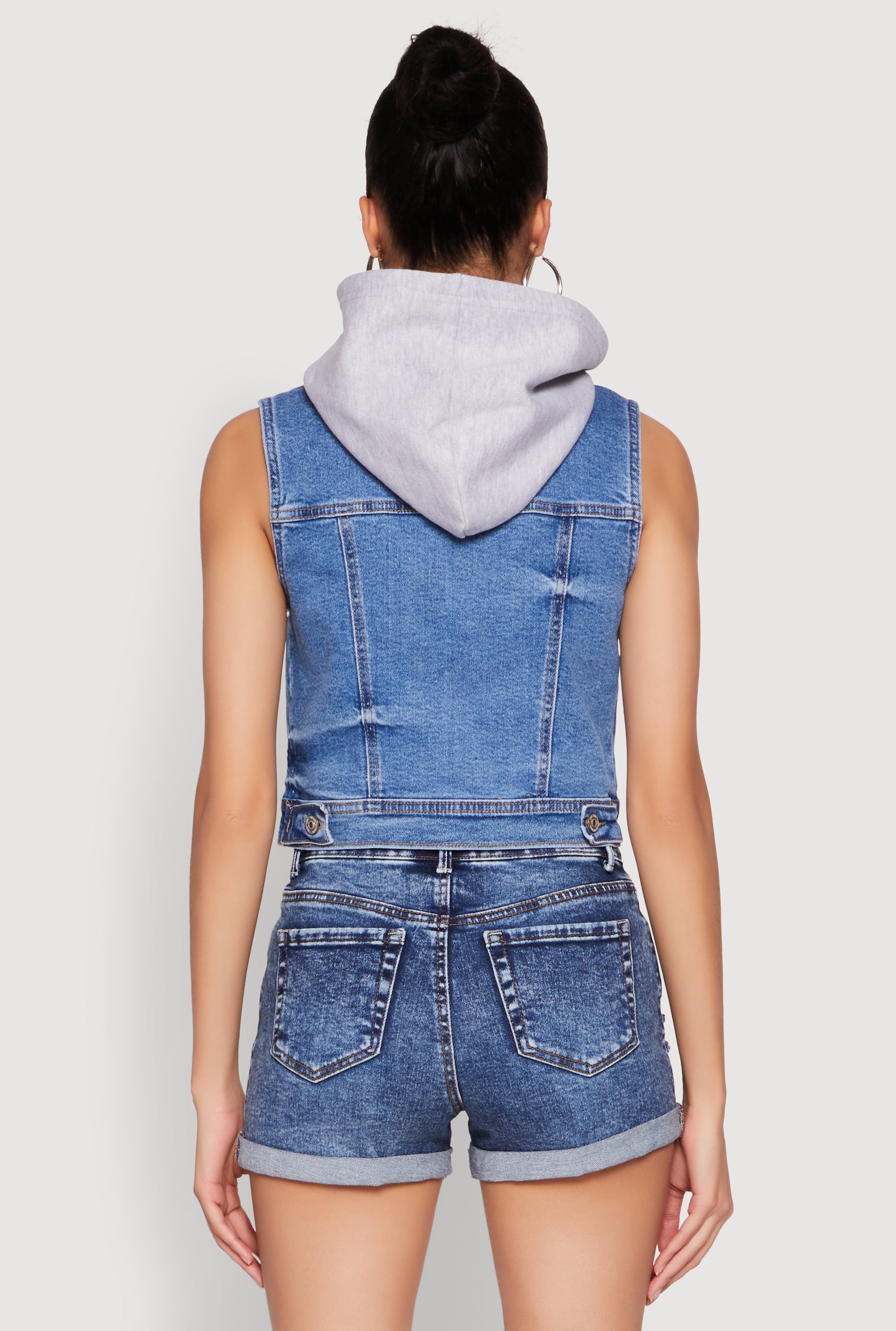 Upgrade your casual look with the WAX Hooded Denim Vest from WAX Jeans. Perfect for layering or making a statement on its own, this sleeveless vest features a trendy cropped hem and a cozy fleece lining that keeps you warm without sacrificing style. Its versatile denim material pairs effortlessly with anything in your wardrobe, making it a must-have for fashion-forward women who love to stand out. Whether you're heading out with friends or just want to add a cool edge to your everyday outfit, this vest is your new go-to piece.
