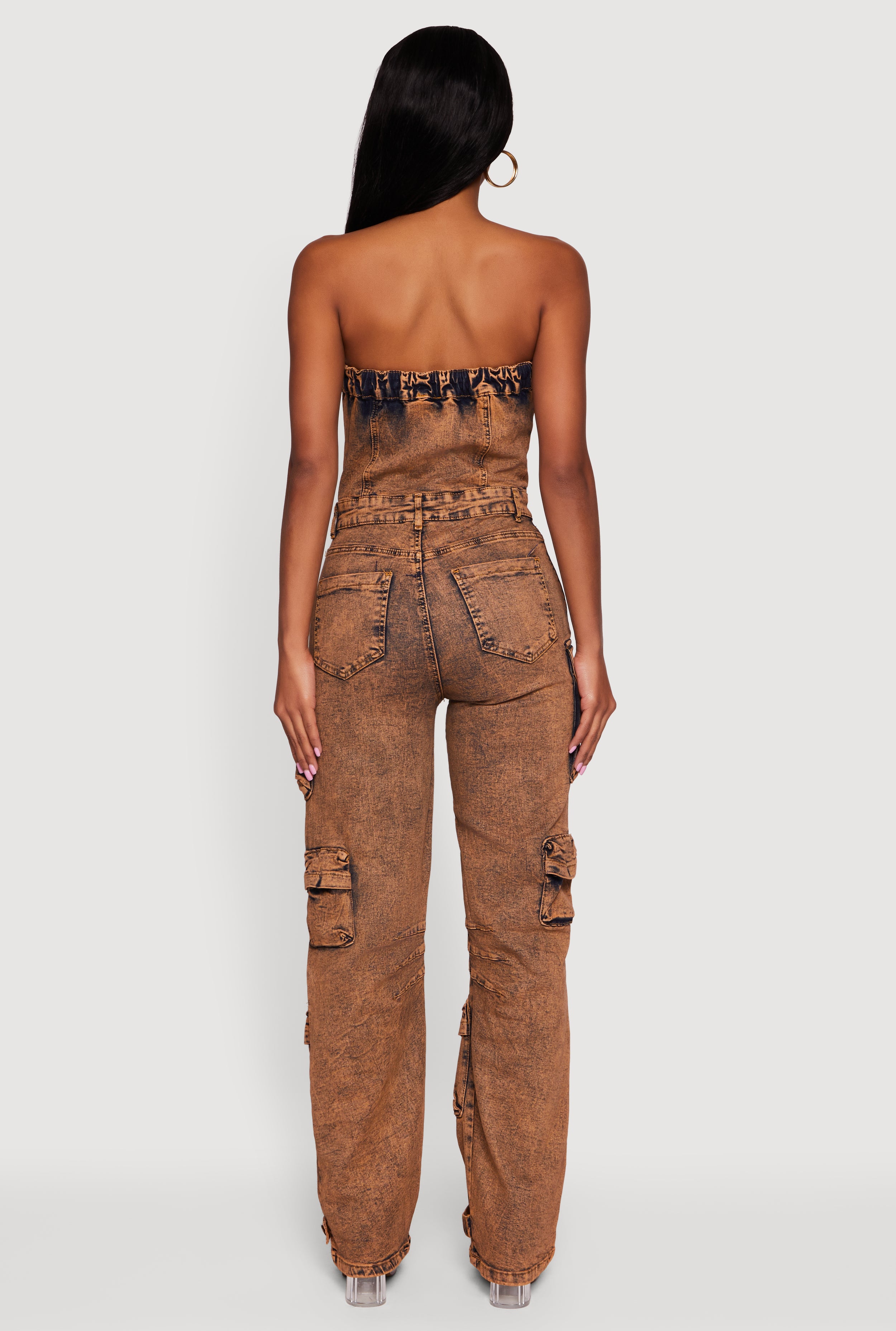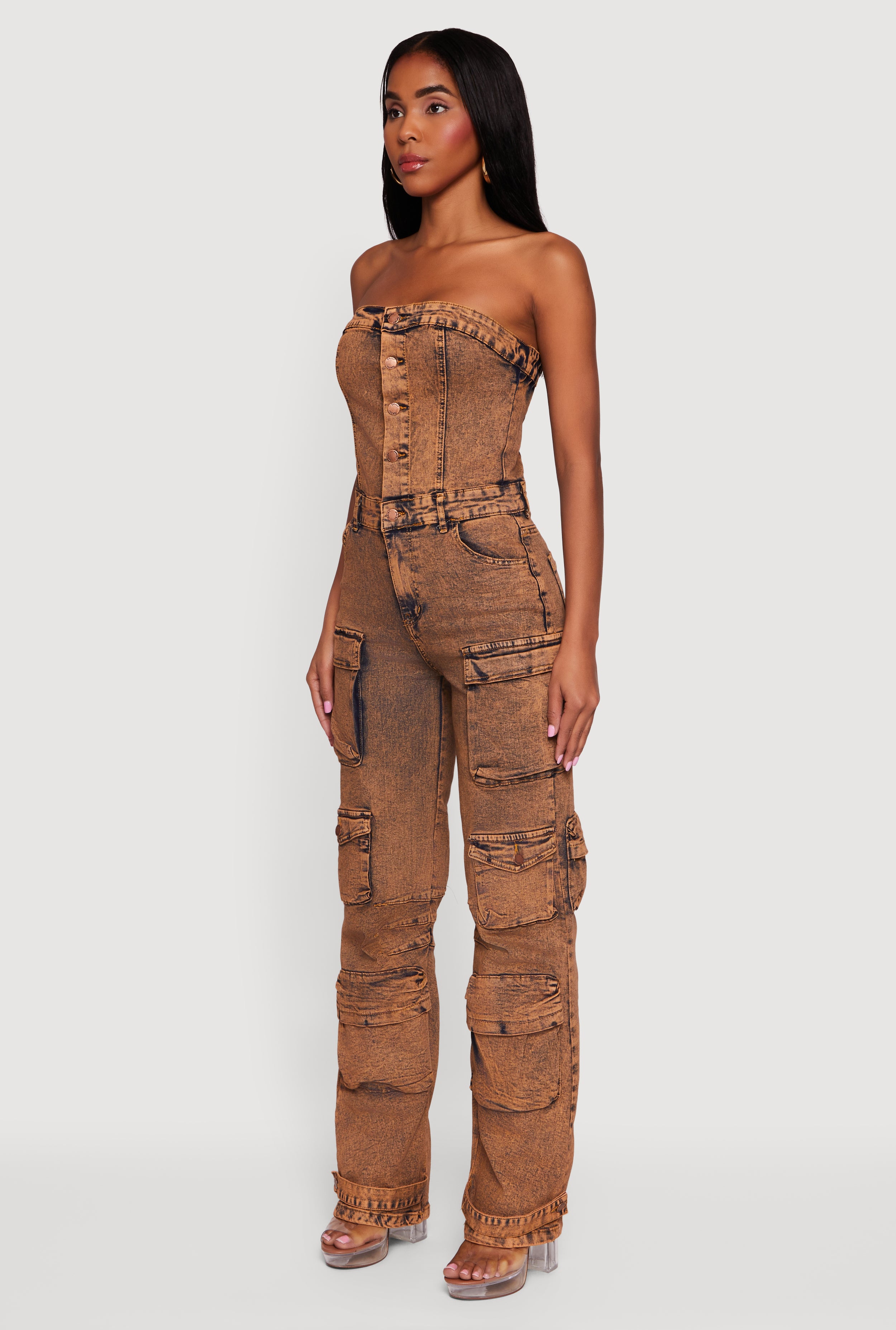 Turn heads wherever you go with this Acid Wash Strapless Button Front Utility Jumpsuit. Designed for effortless cool, it features a trendy strapless neckline and a button front that adds a touch of utility-inspired style. The straight leg denim silhouette offers a flattering fit while the open back keeps things flirty and fresh. Perfect for festivals, nights out, or parties, this jumpsuit combines comfort and edge in one statement-making piece.