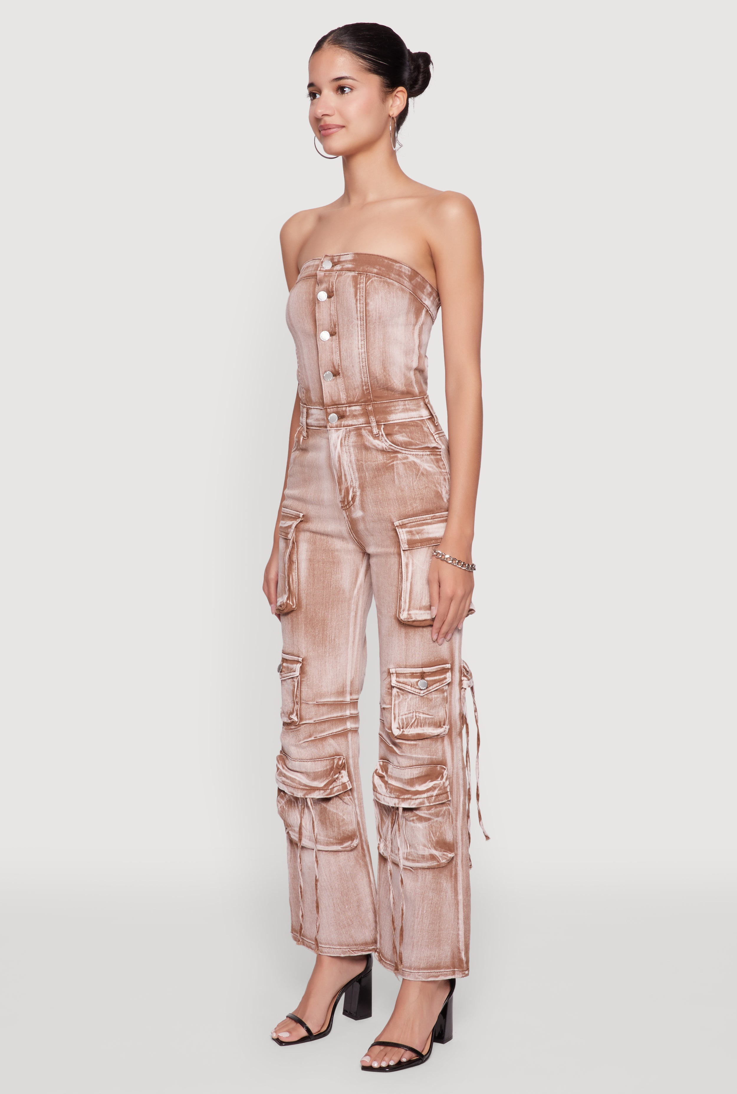 Get ready to turn heads with the Daisy Denim Strapless Flare Jumpsuit. Perfect for those who want to look effortlessly chic and stay comfy all day long, this jumpsuit is a must-have in your wardrobe. Its trendy flare leg and strapless design make it ideal for sunny days and nights out. Plus, the cargo pockets add a fun, practical touch that keeps your essentials close without sacrificing style. Whether you're dressing up or down, this denim jumpsuit is your new go-to for a cool, casual vibe that feels as good as it looks.