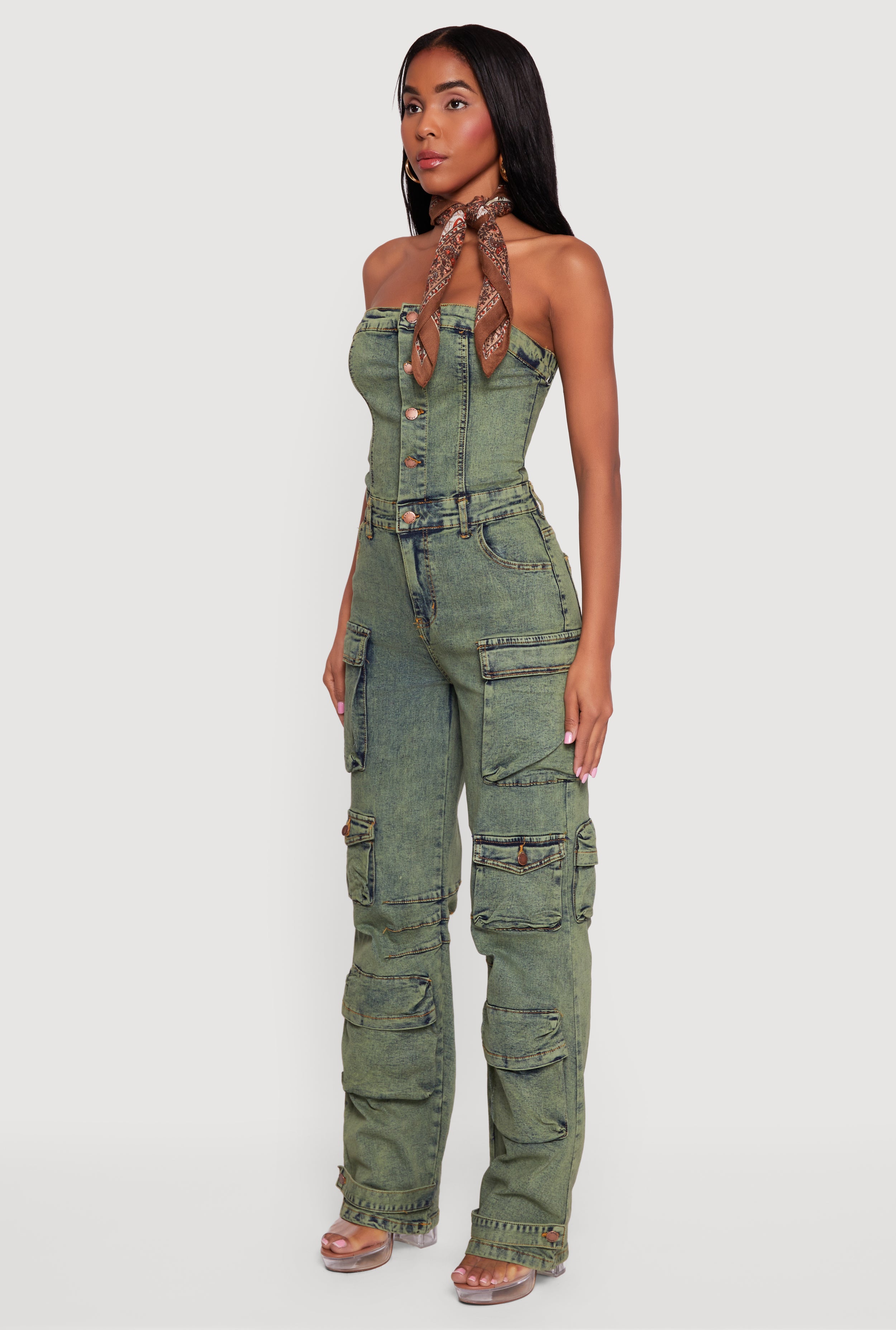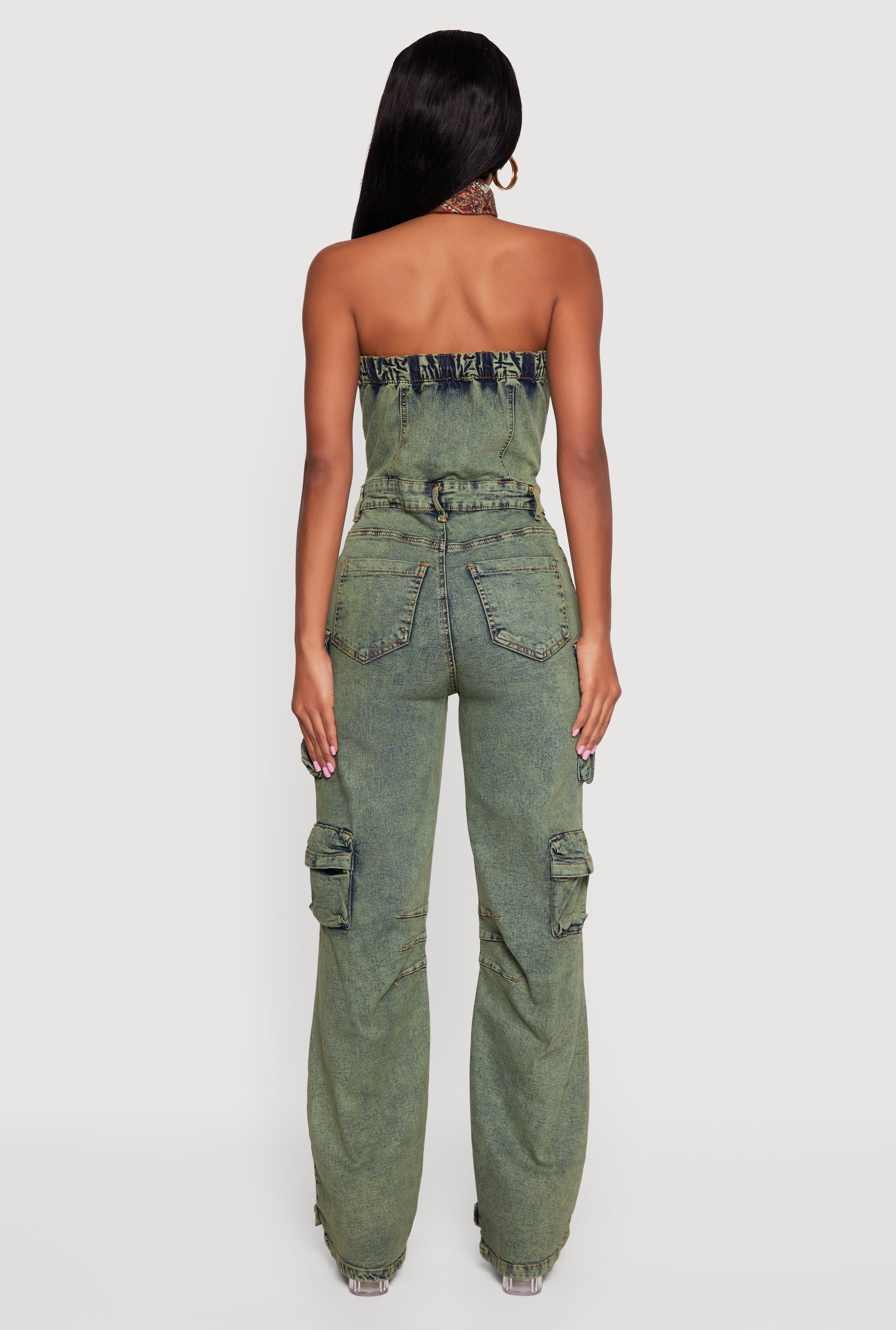 Acid Wash Strapless Button Front Utility Jumpsuit