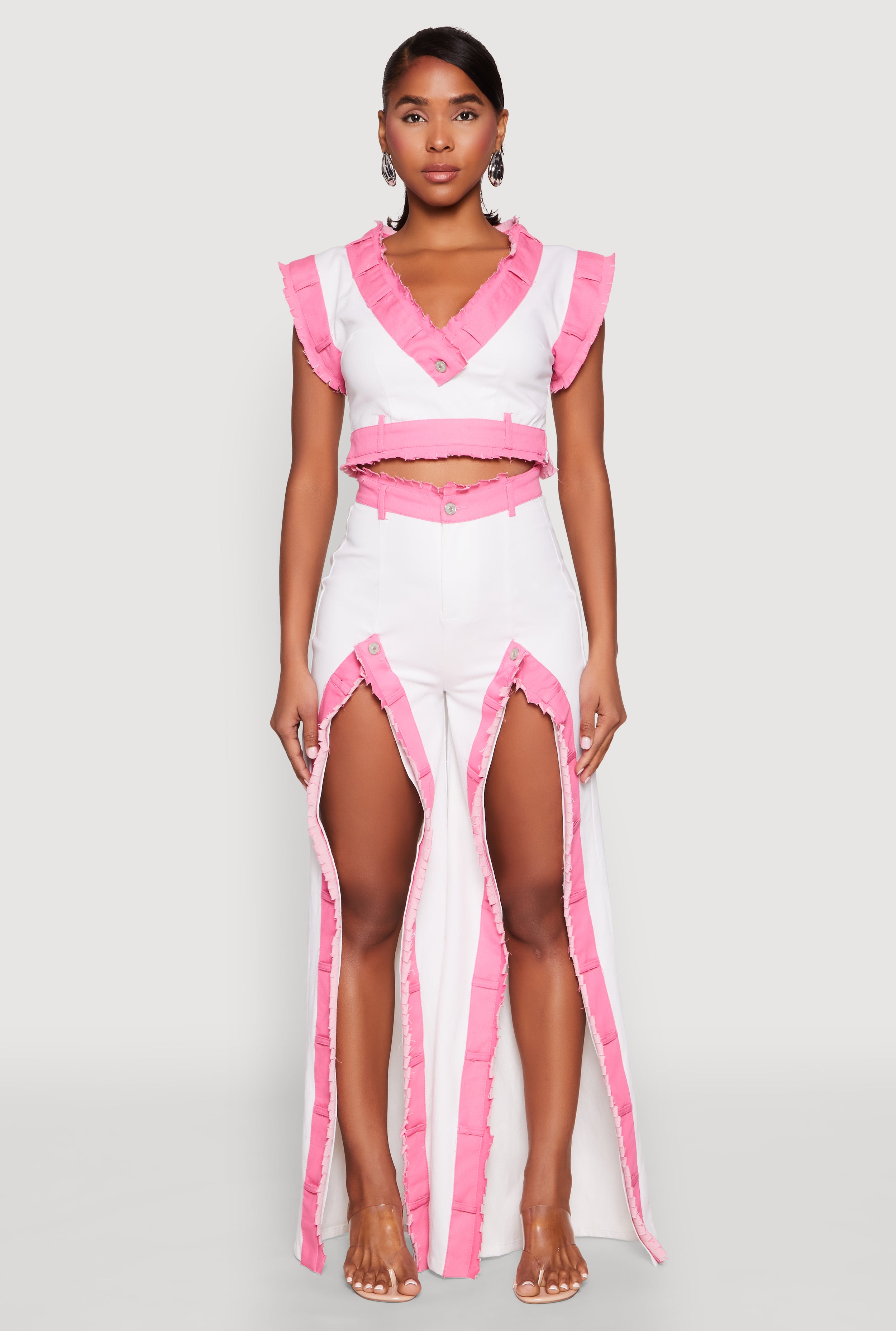 • Includes stylish frayed accents and zipper details for an edgy touch