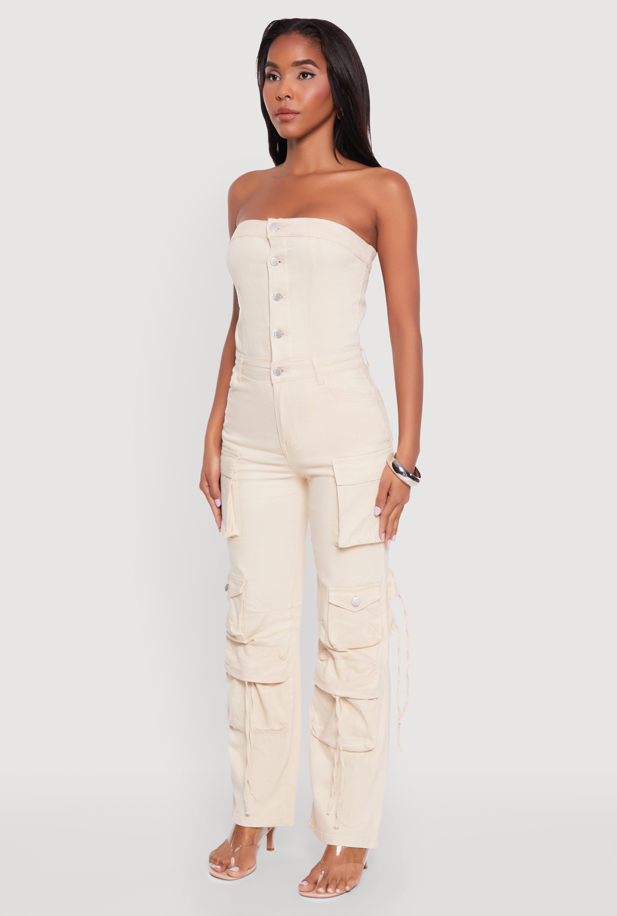 Get ready to turn heads with the Daisy Denim Strapless Flare Jumpsuit. Perfect for those who want to look effortlessly chic and stay comfy all day long, this jumpsuit is a must-have in your wardrobe. Its trendy flare leg and strapless design make it ideal for sunny days and nights out. Plus, the cargo pockets add a fun, practical touch that keeps your essentials close without sacrificing style. Whether you're dressing up or down, this denim jumpsuit is your new go-to for a cool, casual vibe that feels as good as it looks.