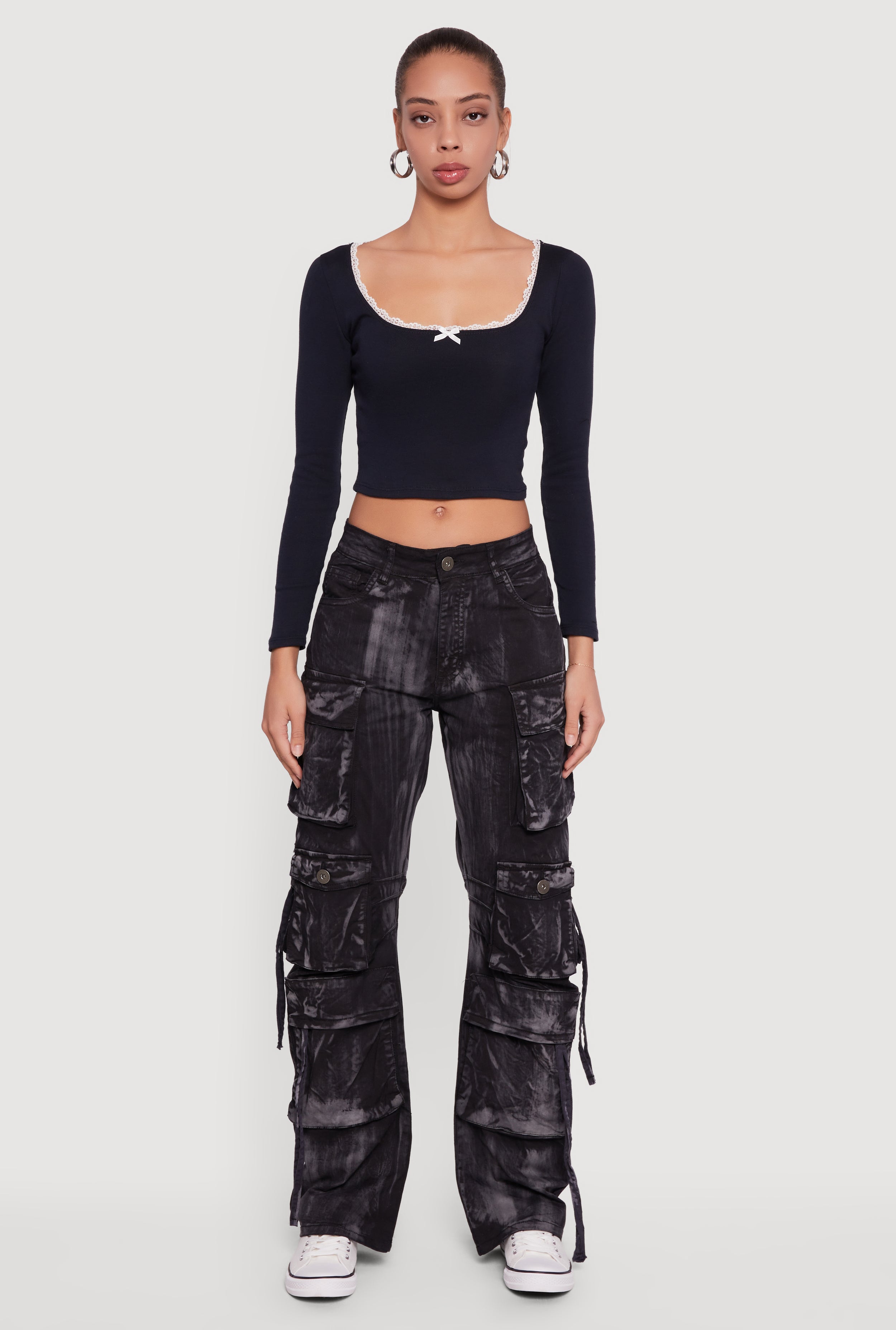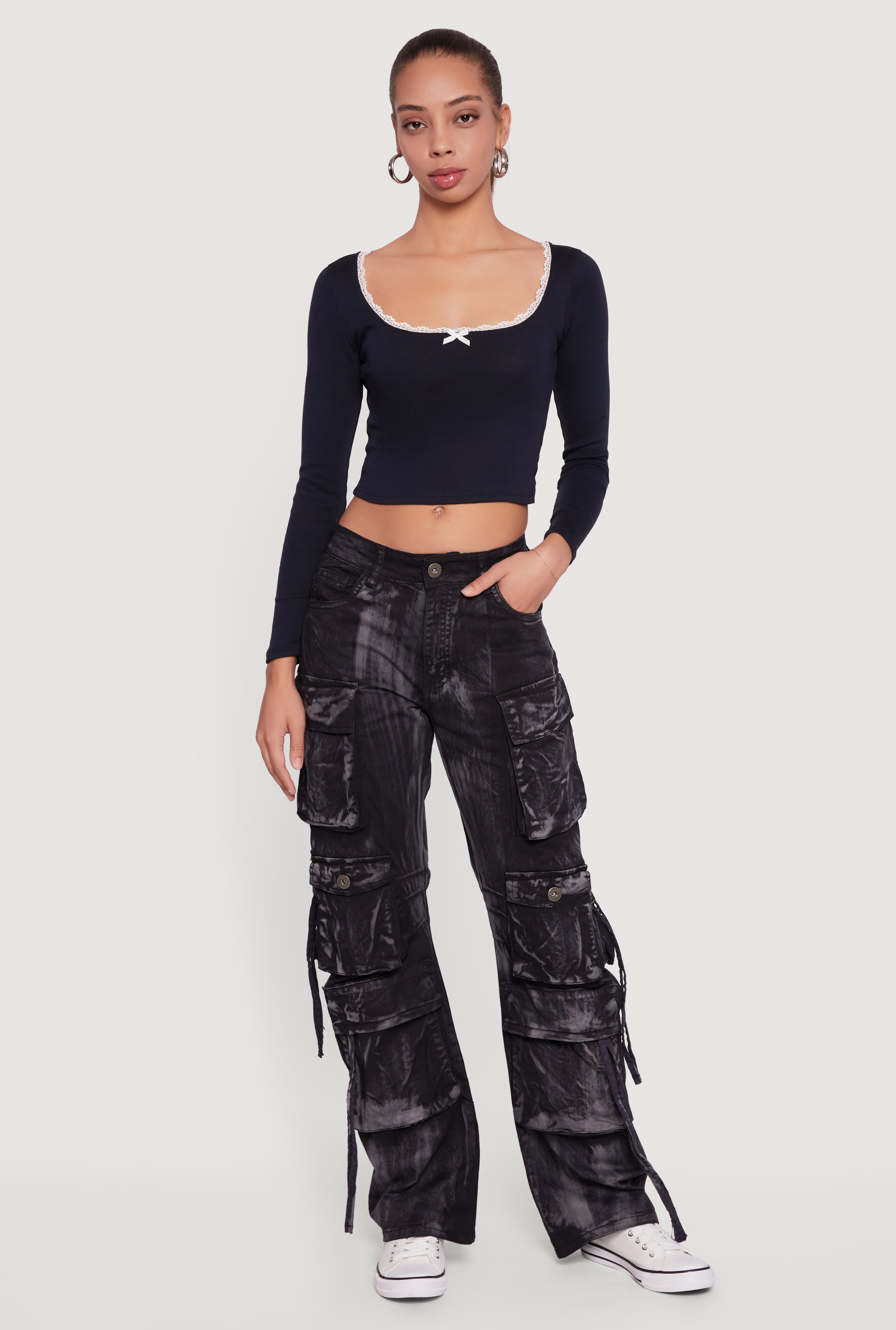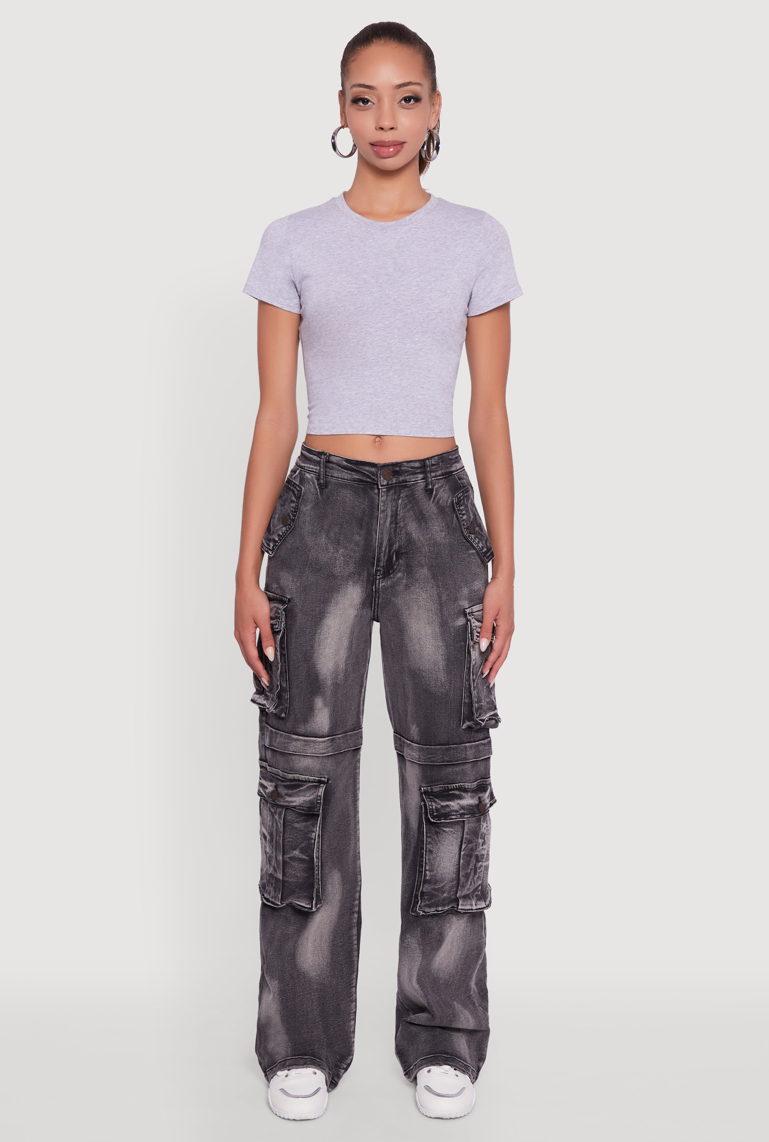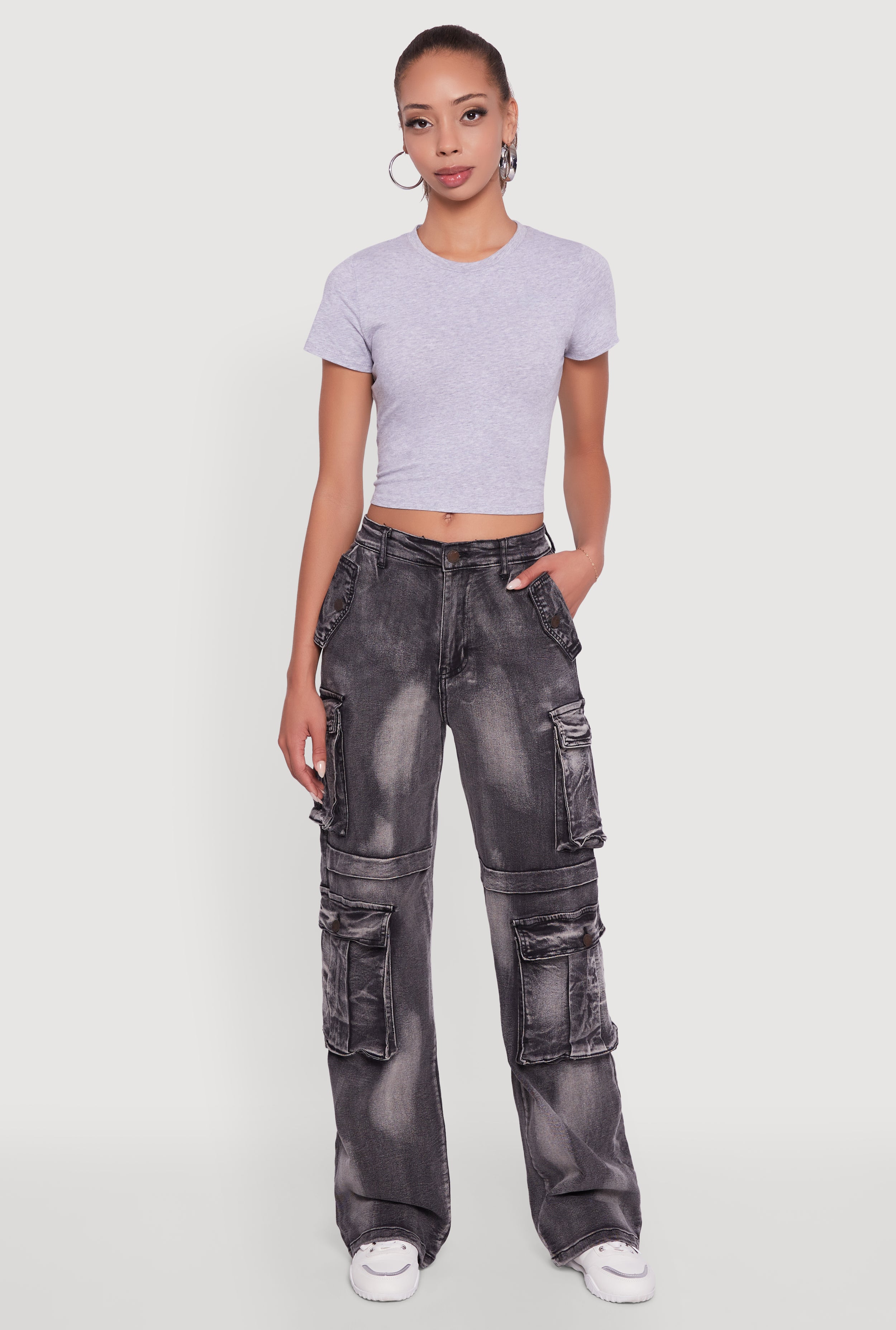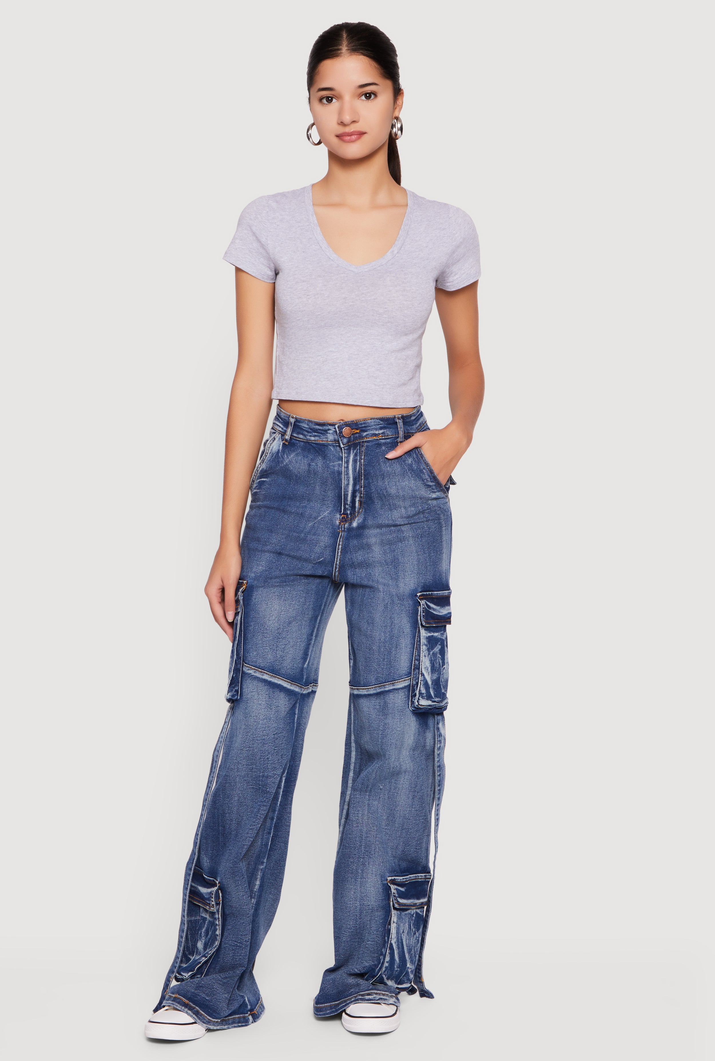 Whiskered Acid Wash Wide Leg Cargo Jeans