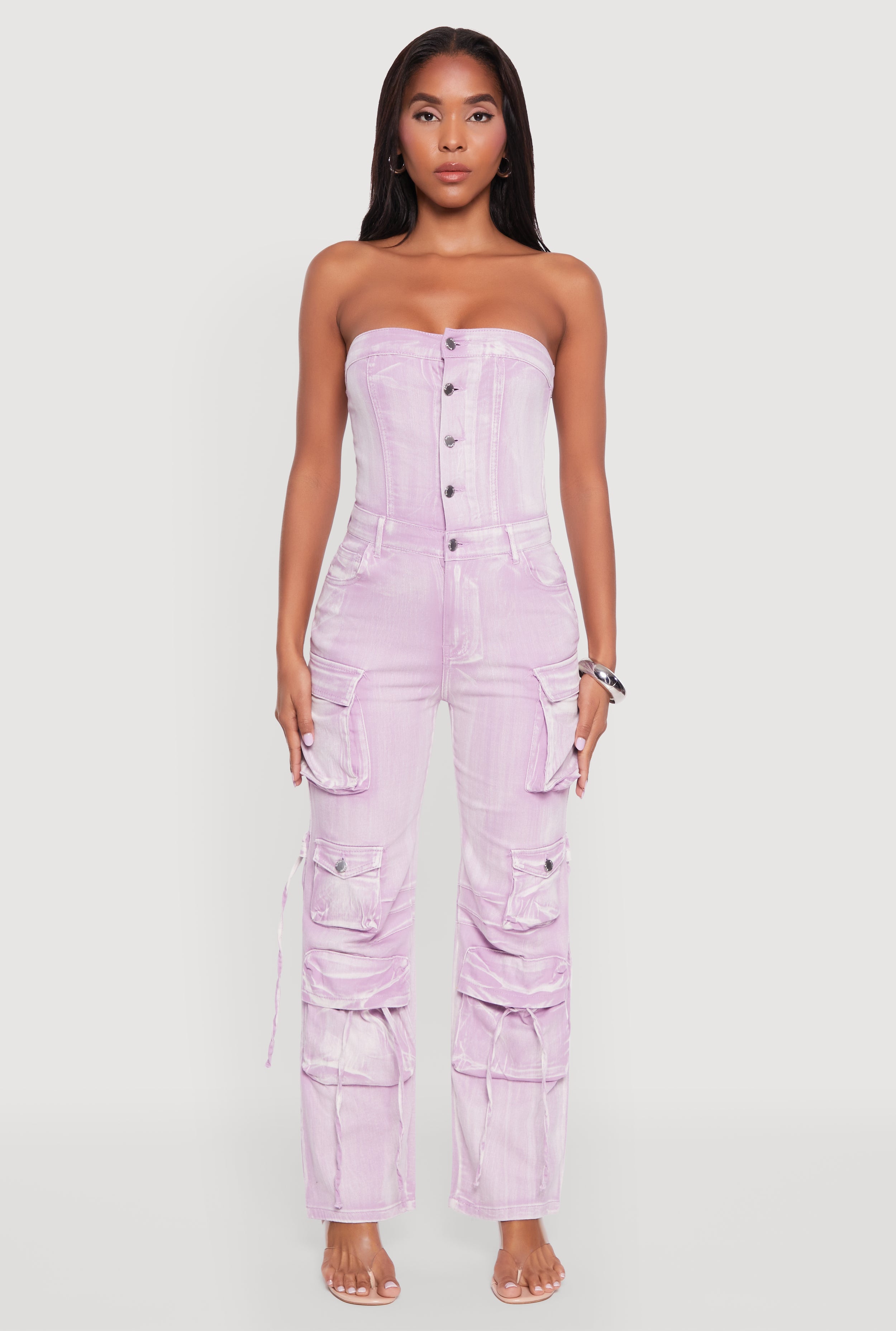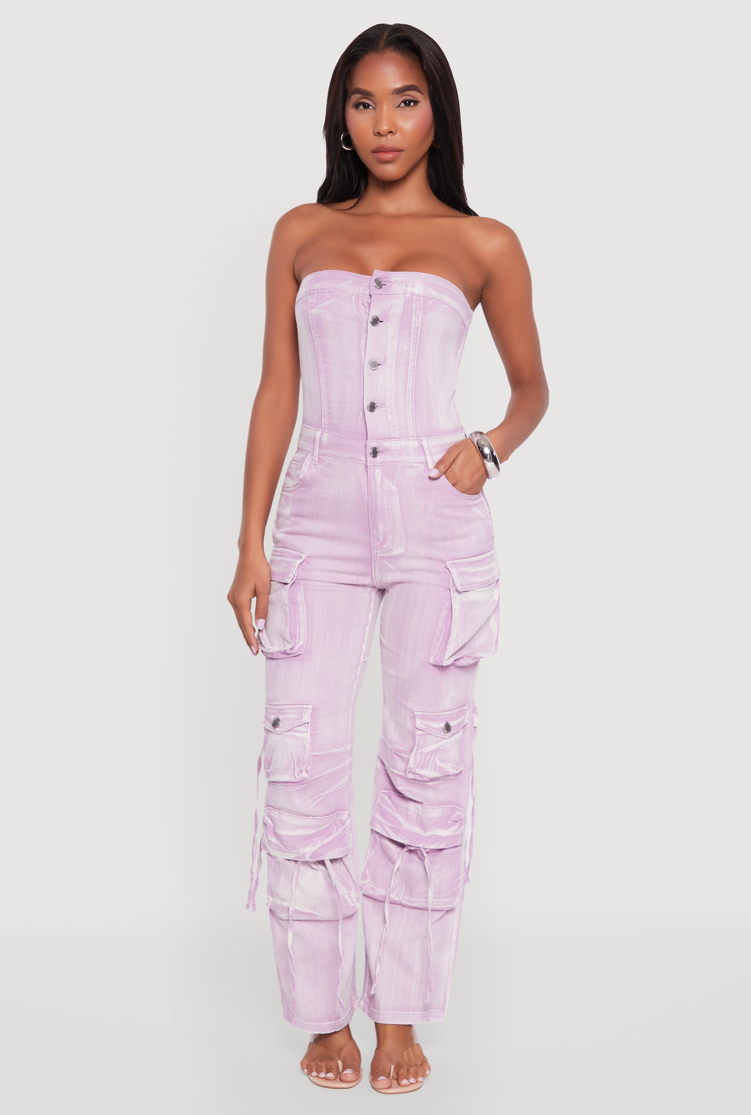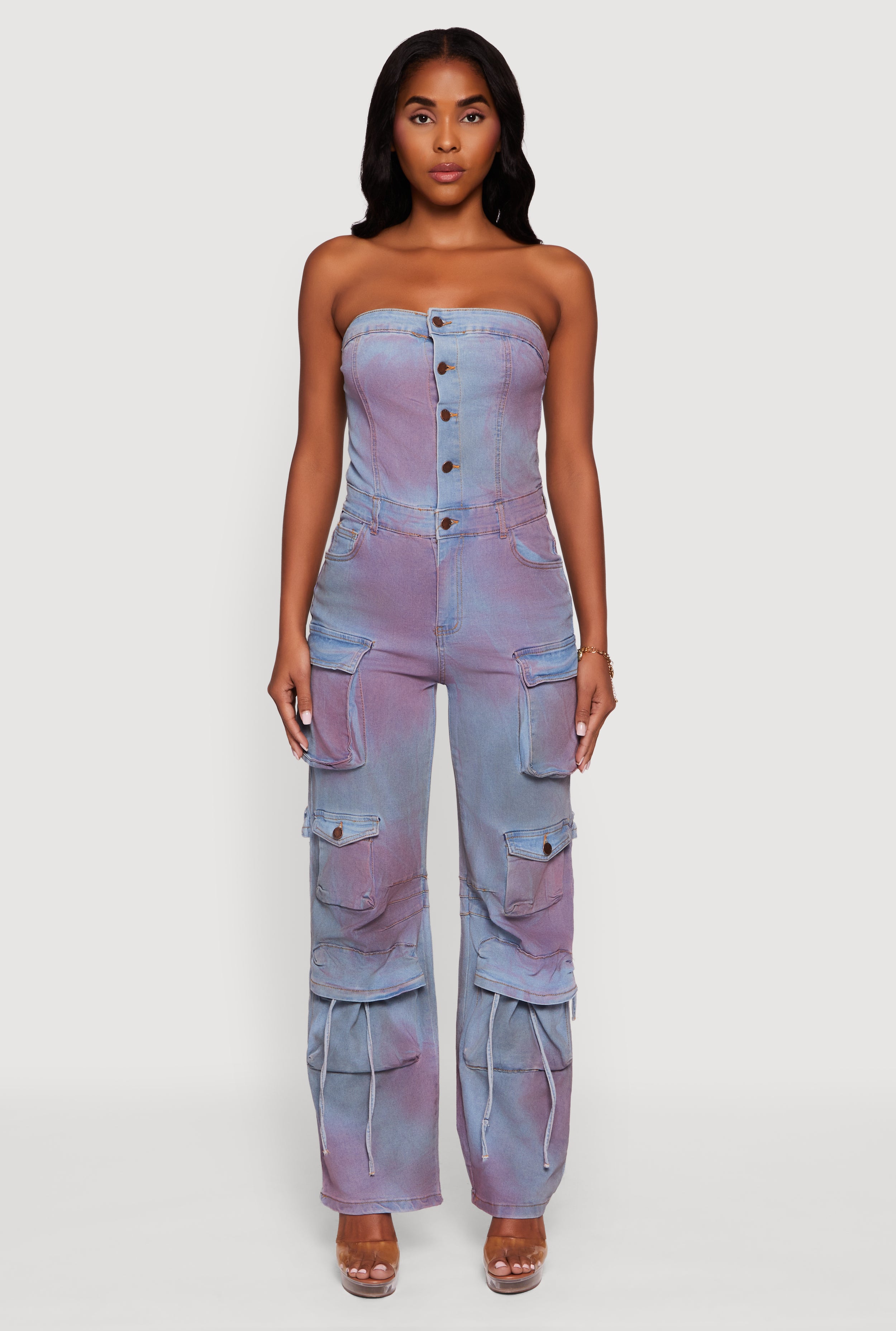 Daisy Denim Strapless Flare Jumpsuit with Cargo Pockets