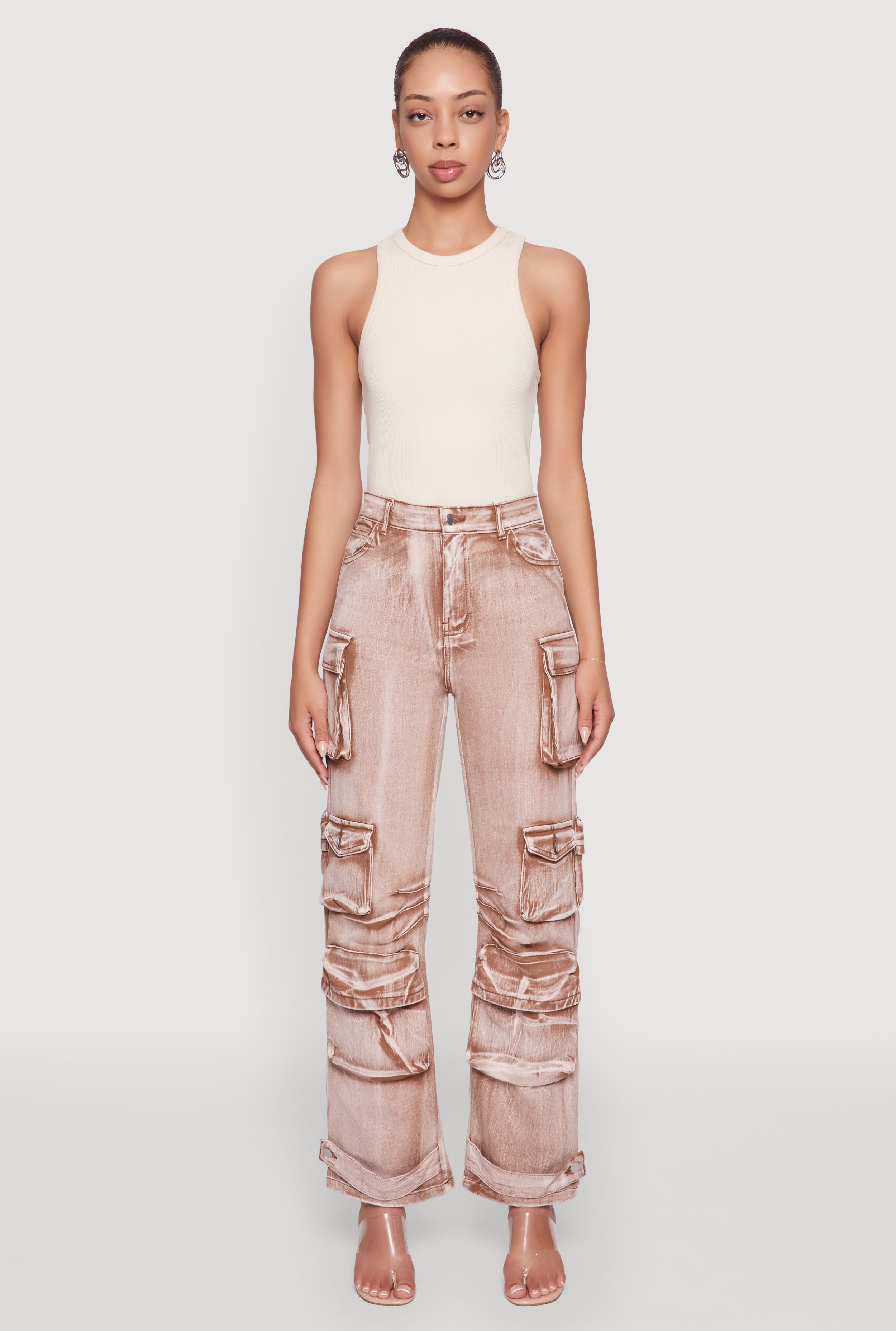 Acid Wash Pintuck Slim Leg Utility Jeans