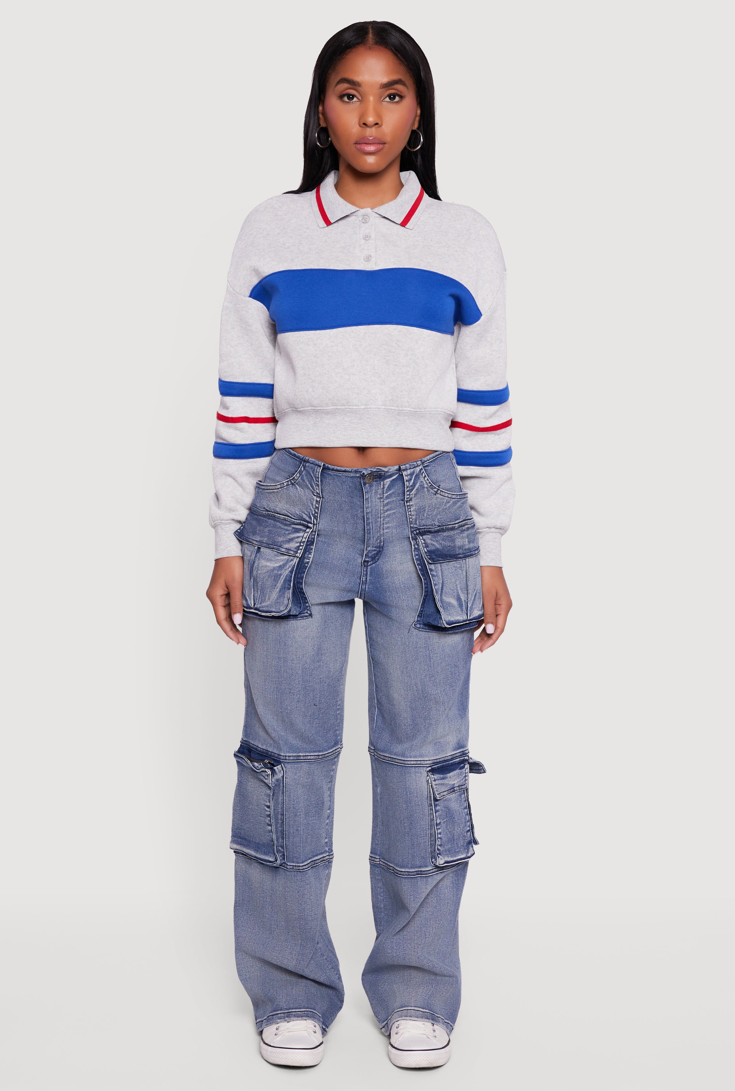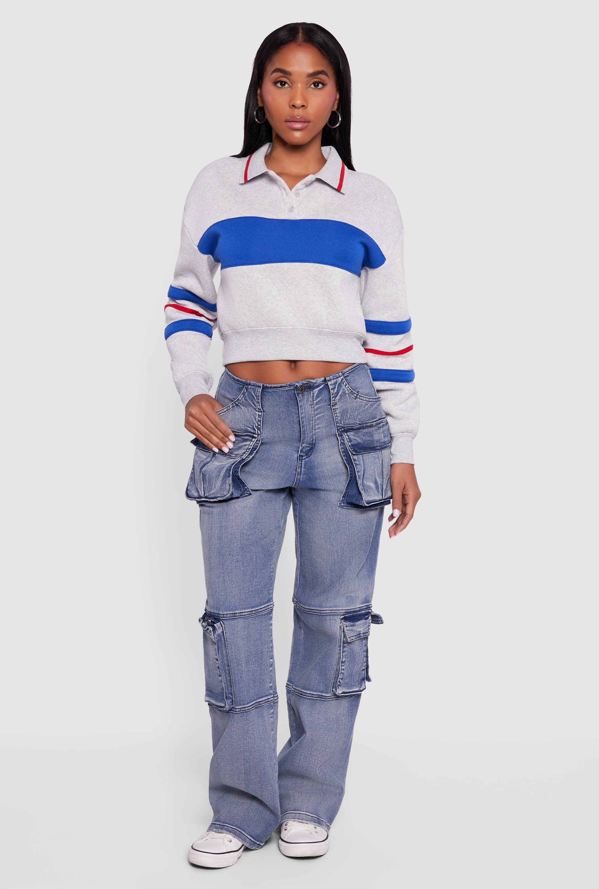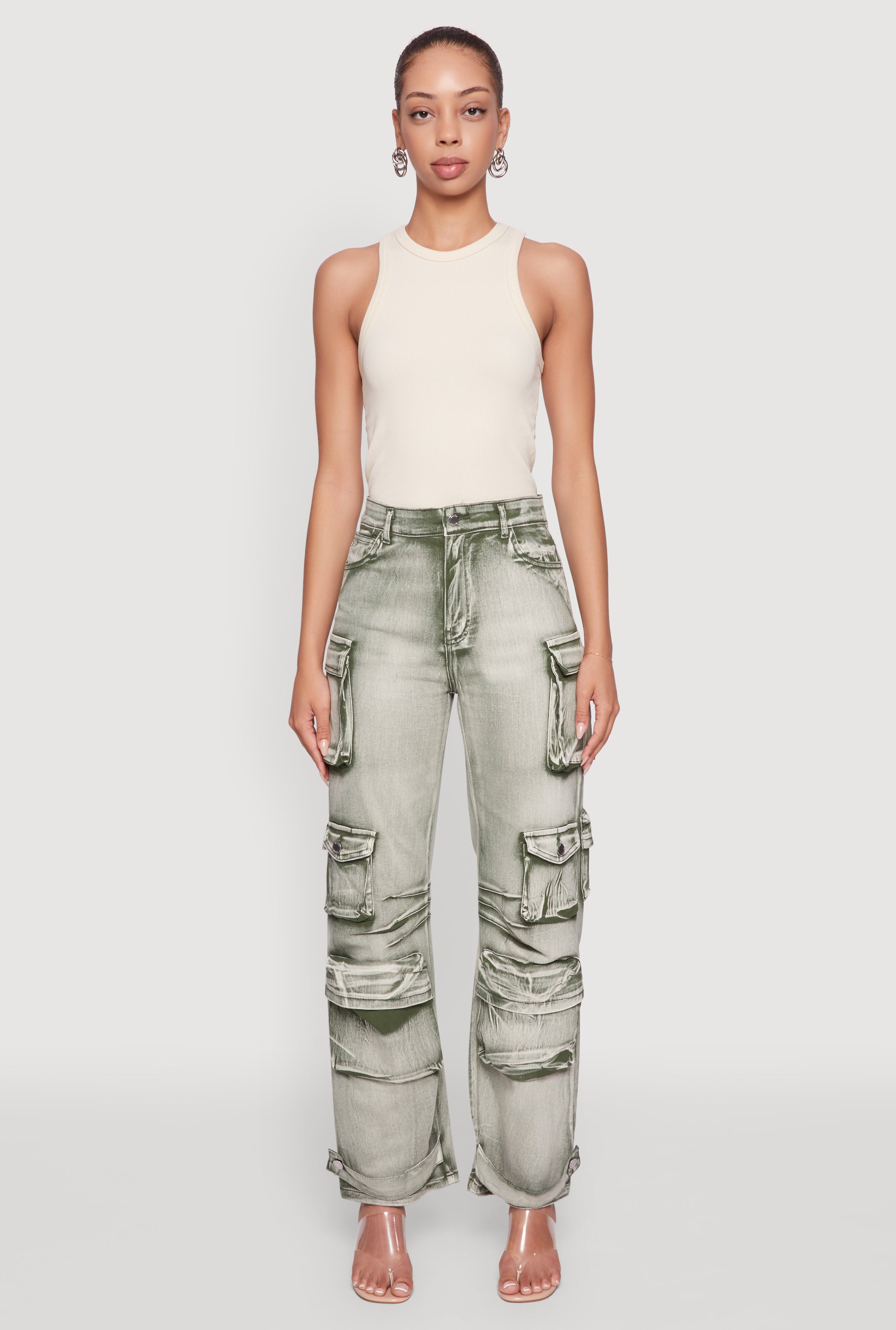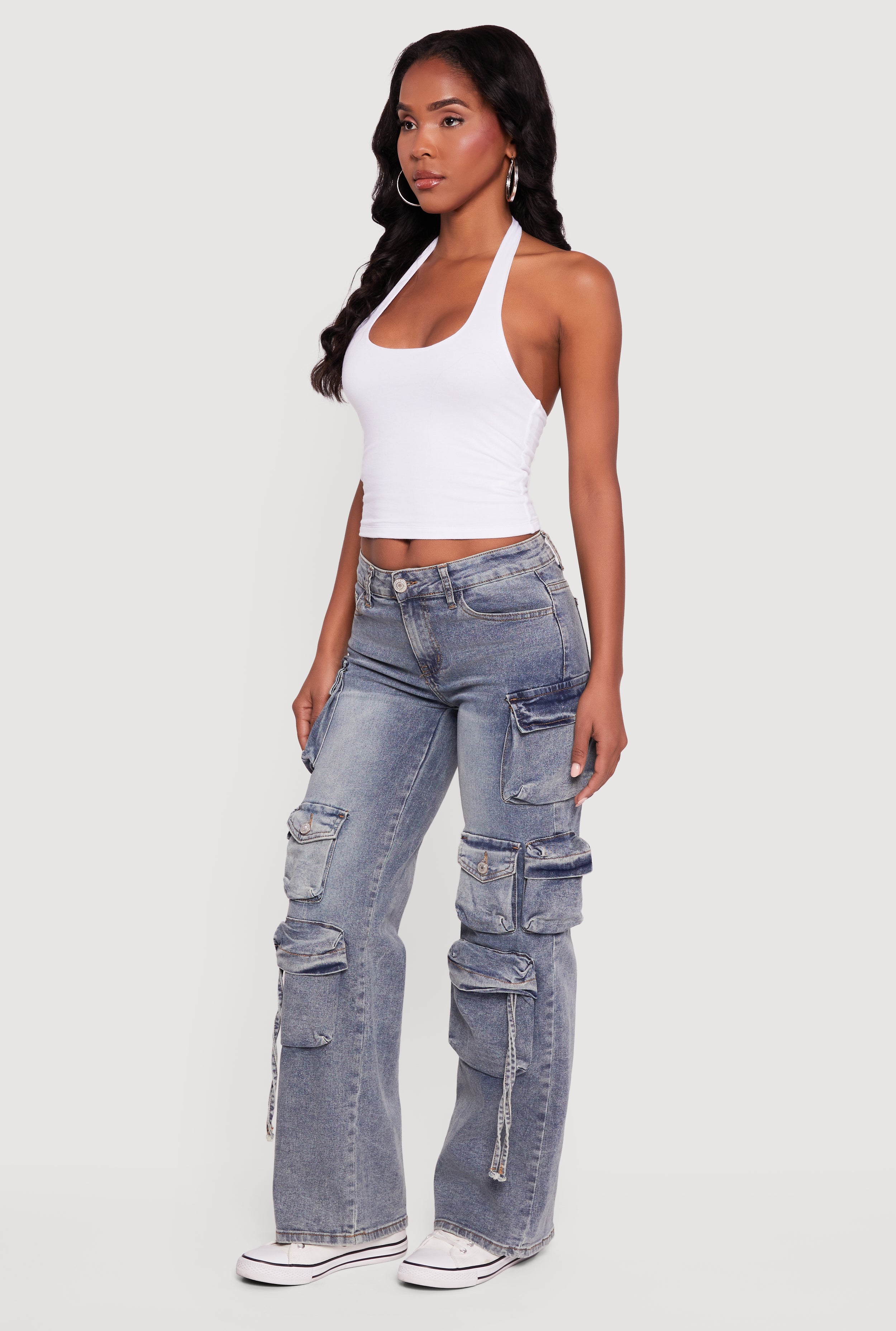 High Waisted Decorative Stitch Cargo Pocket Jeans