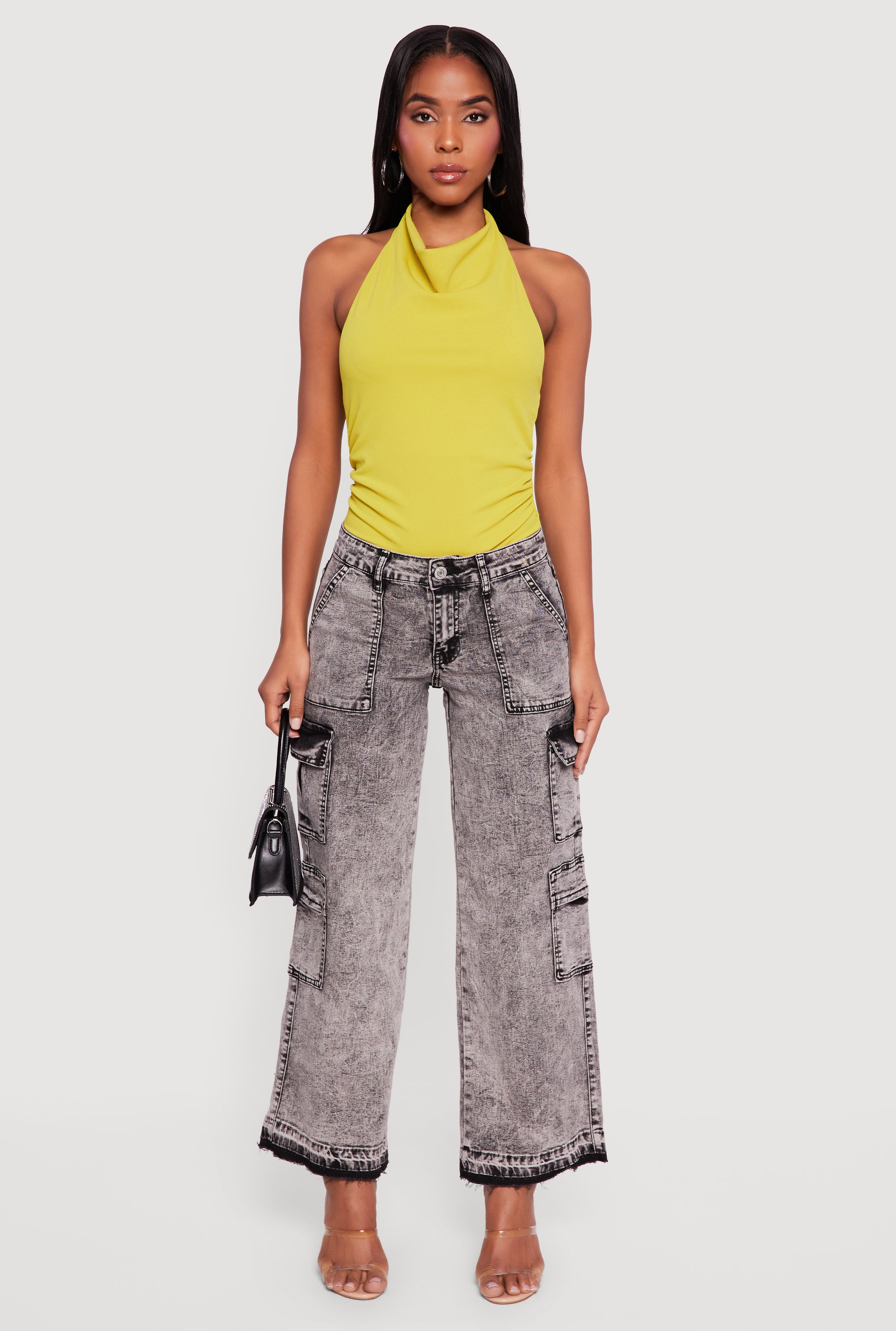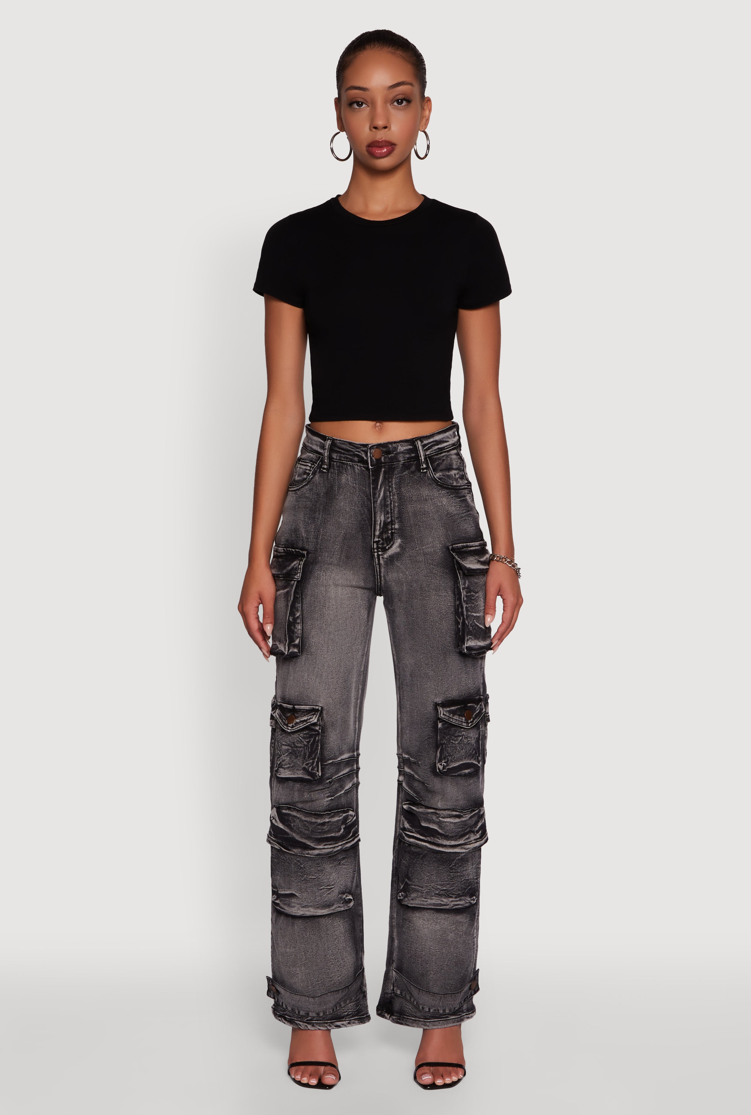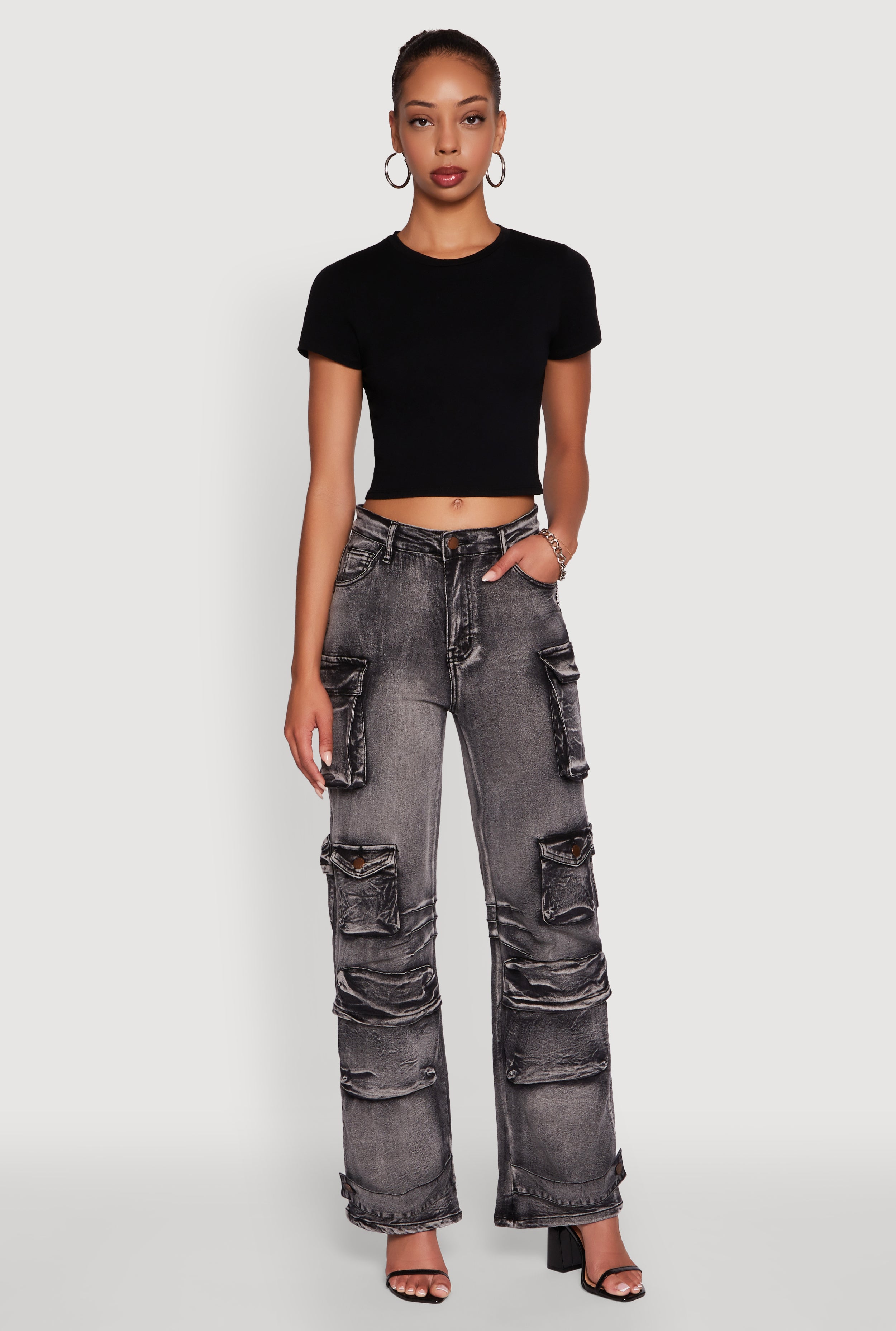 High Waisted Cargo Pocket Acid Wash Jeans