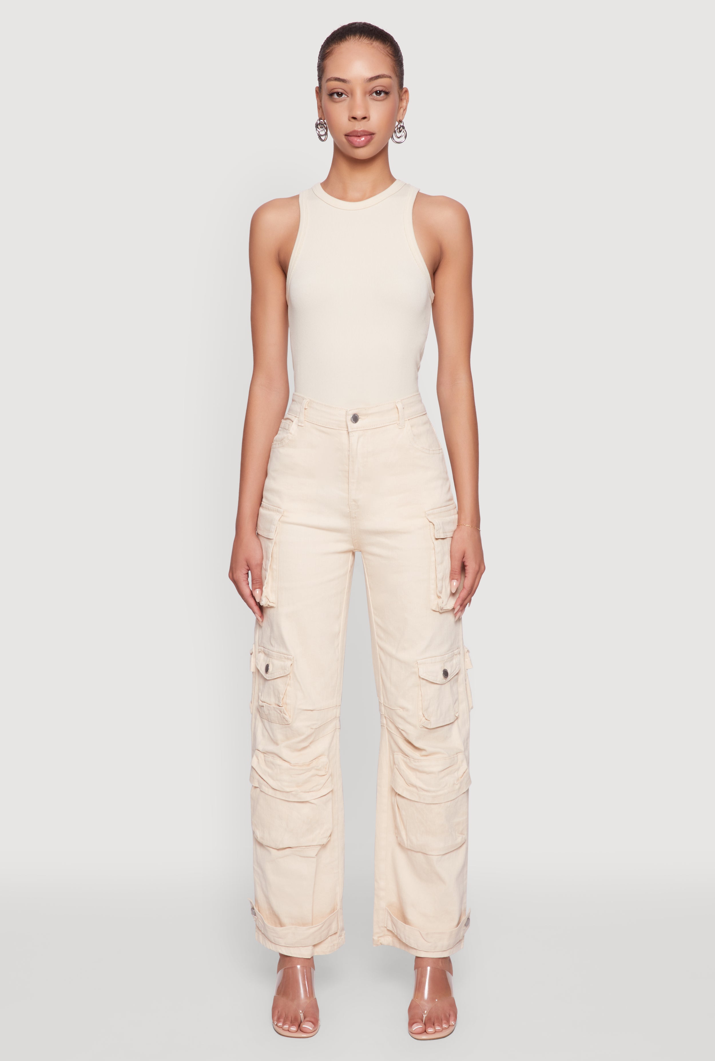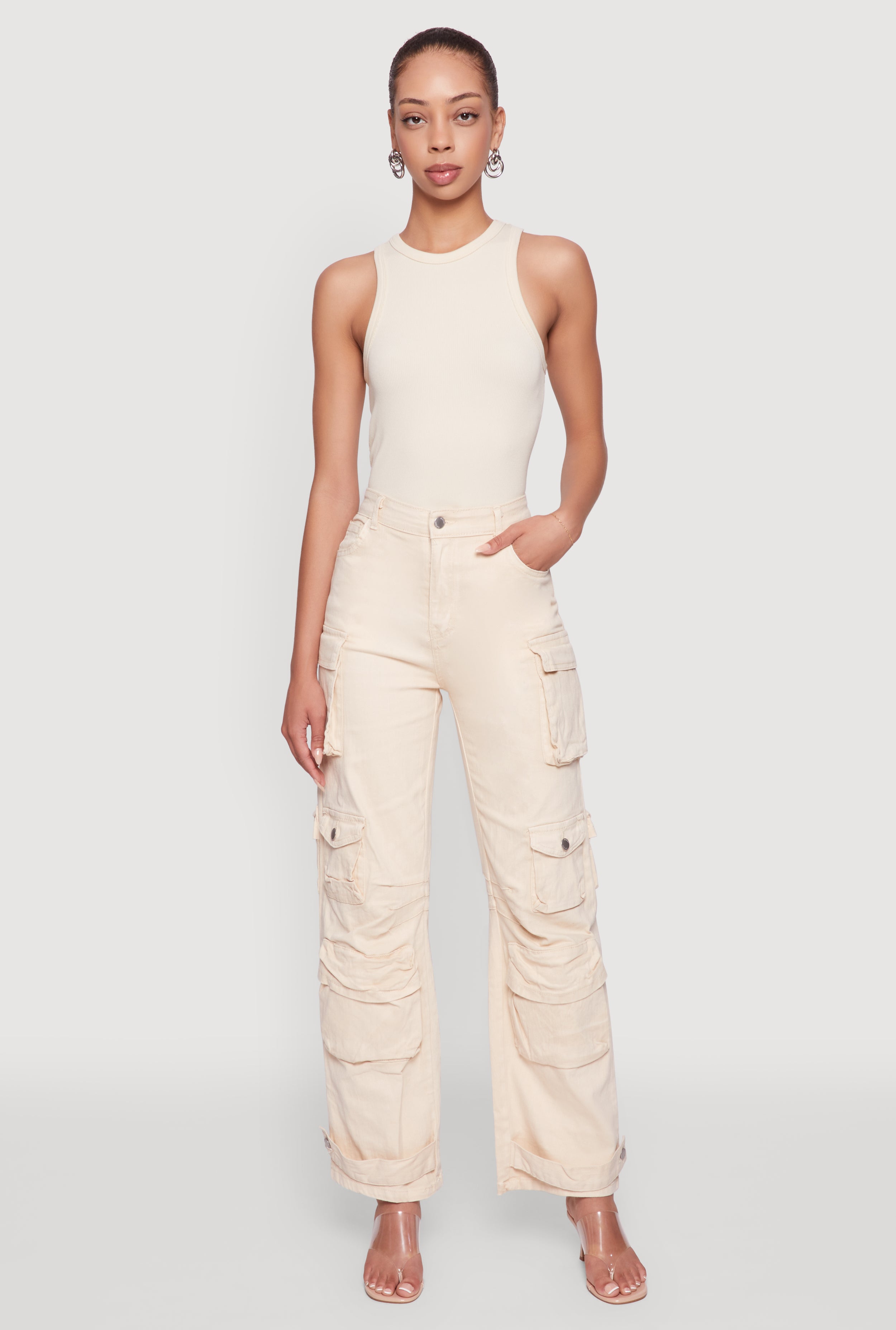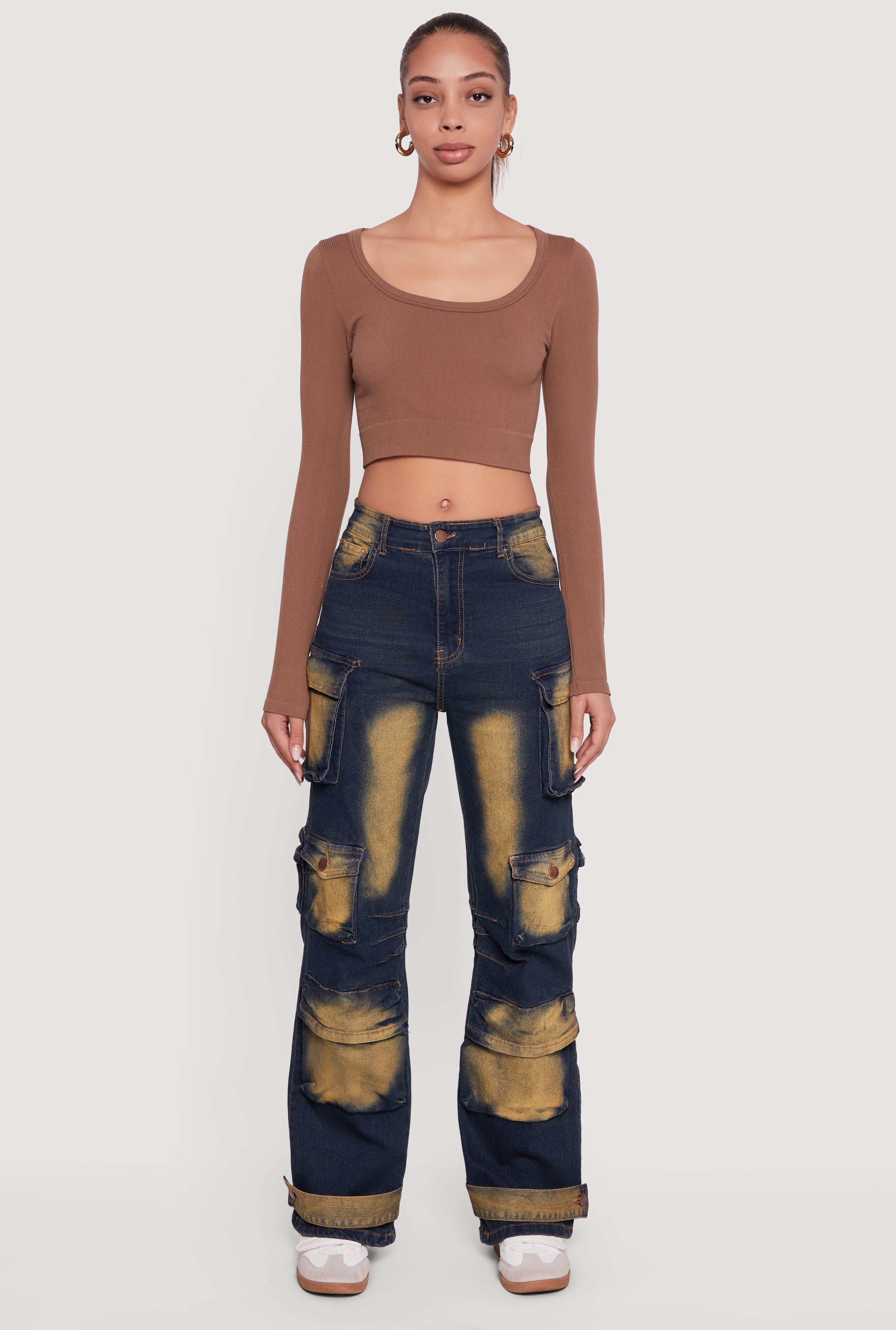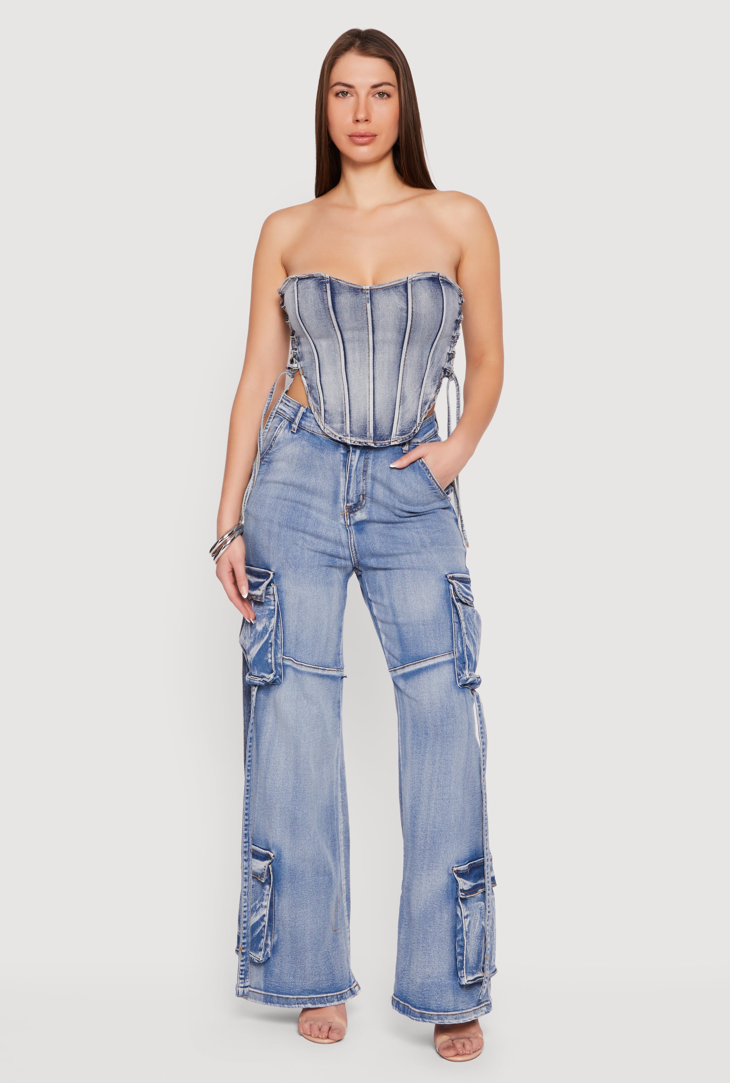 High Waisted Cargo Pocket Acid Wash Jeans