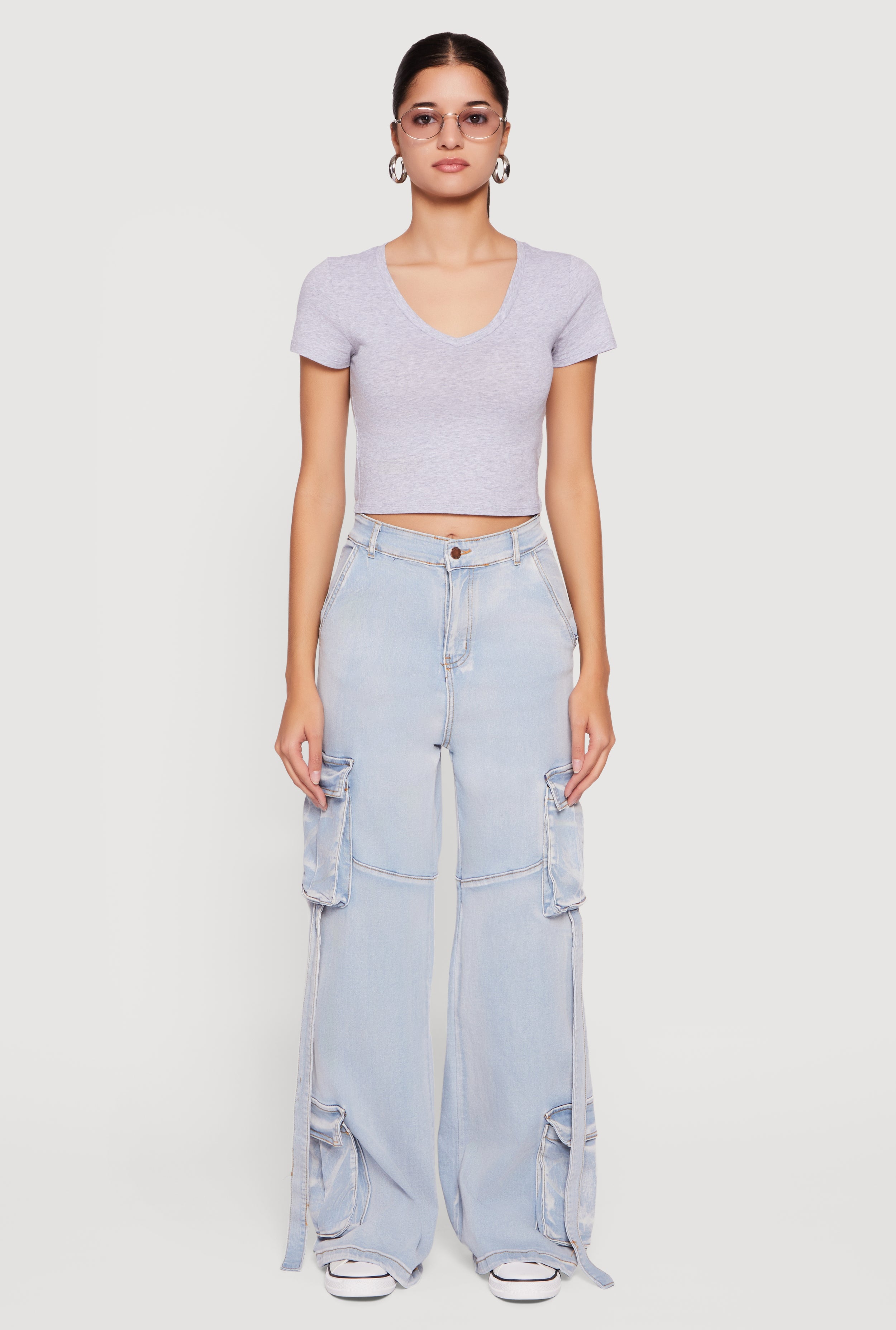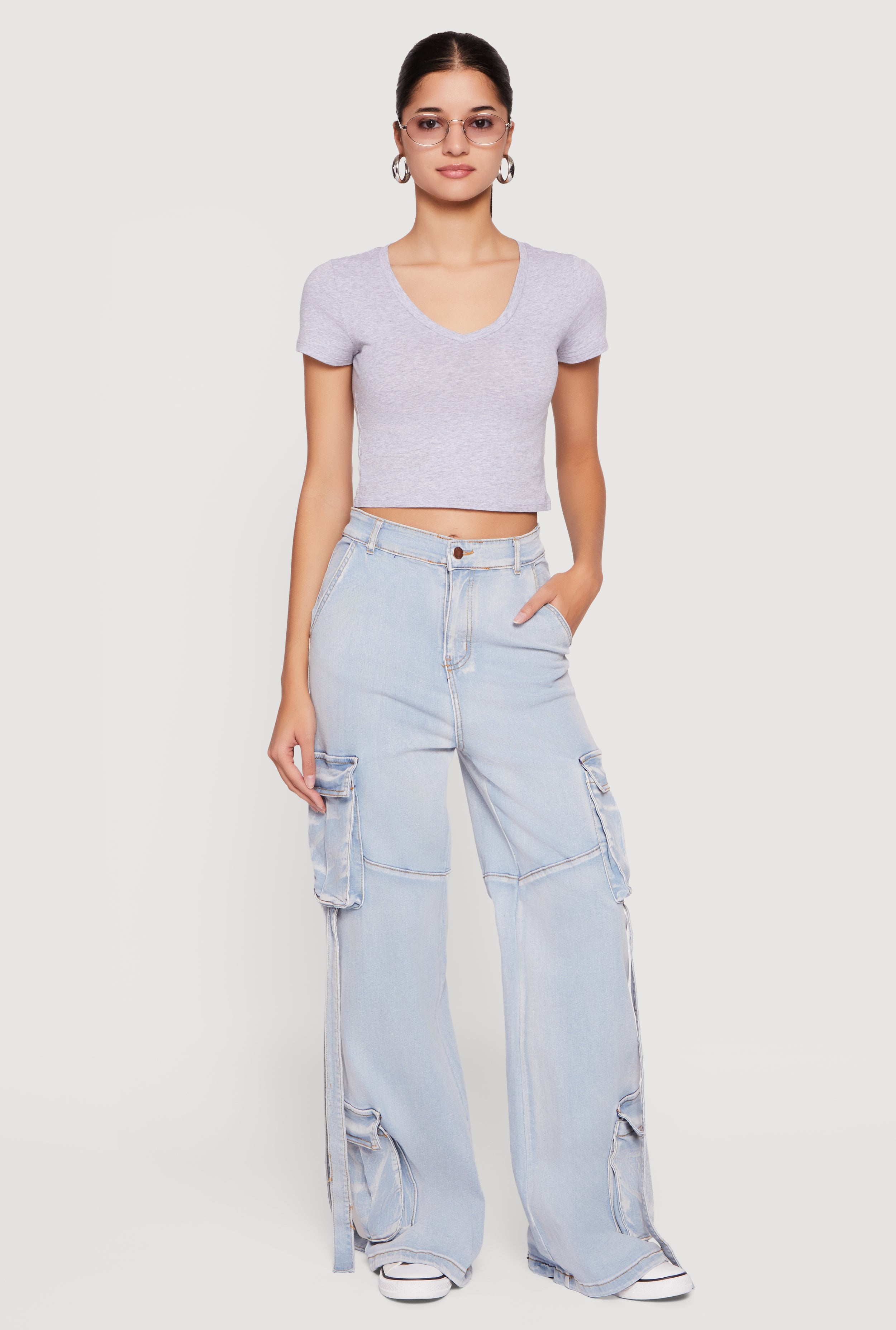Bleached Detail Mid Rise Wide Leg Cargo Pocket Jeans