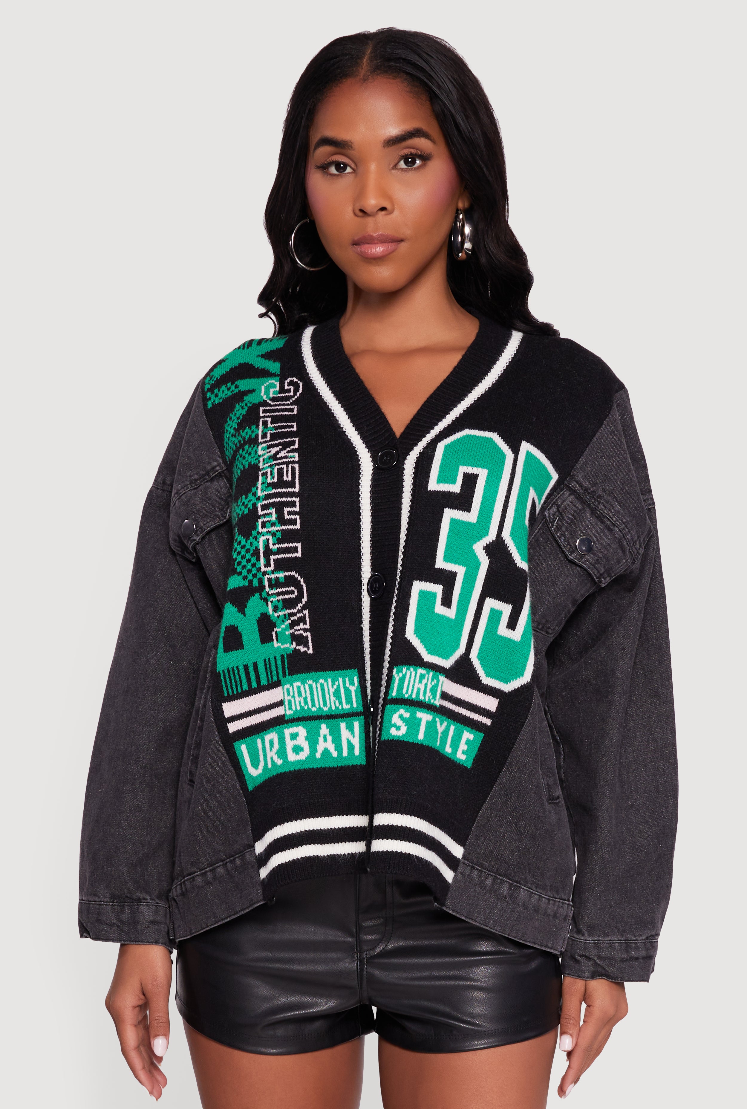 Oversized Color Blocked Streetwear Graphic Knit Denim Jacket