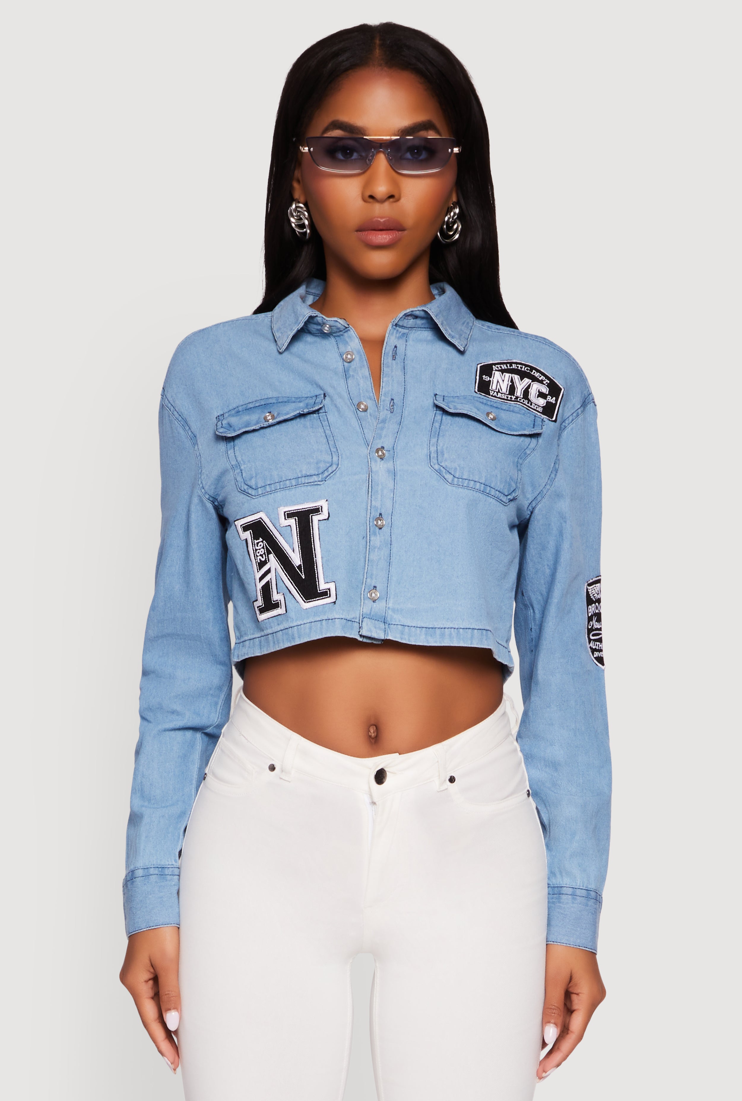 Chambray 1982 NYC Embroidered Patch Graphic Cropped Shirt