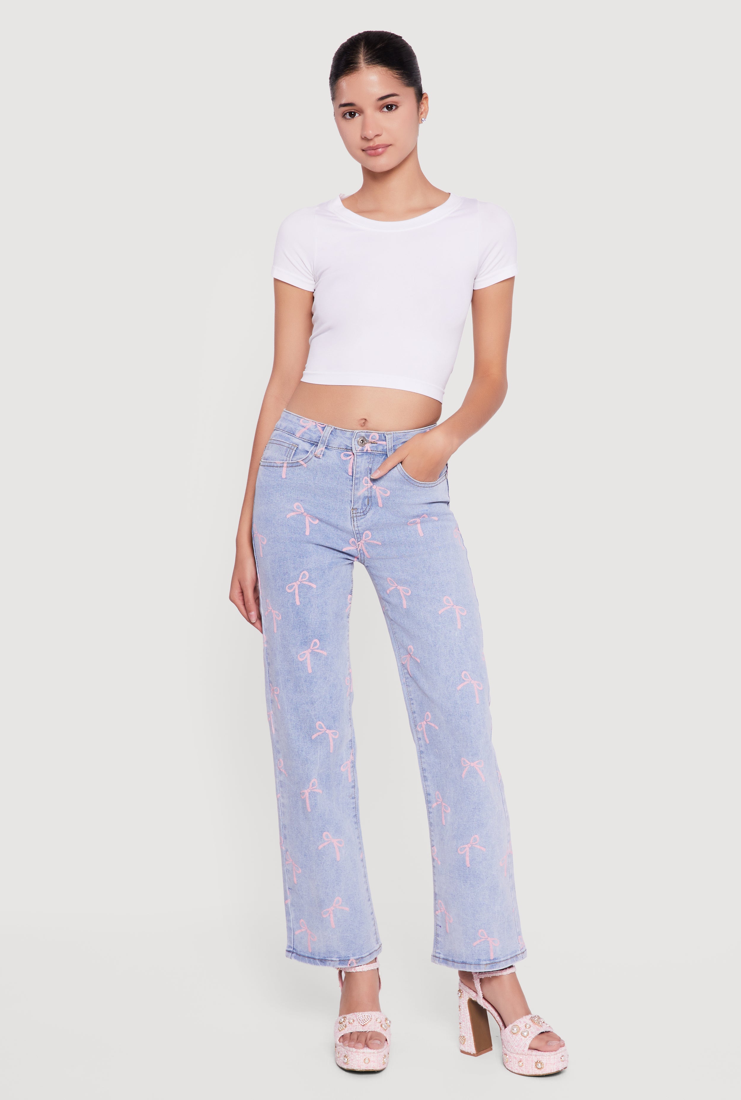Mid Rise Straight Leg Bow Print Jeans