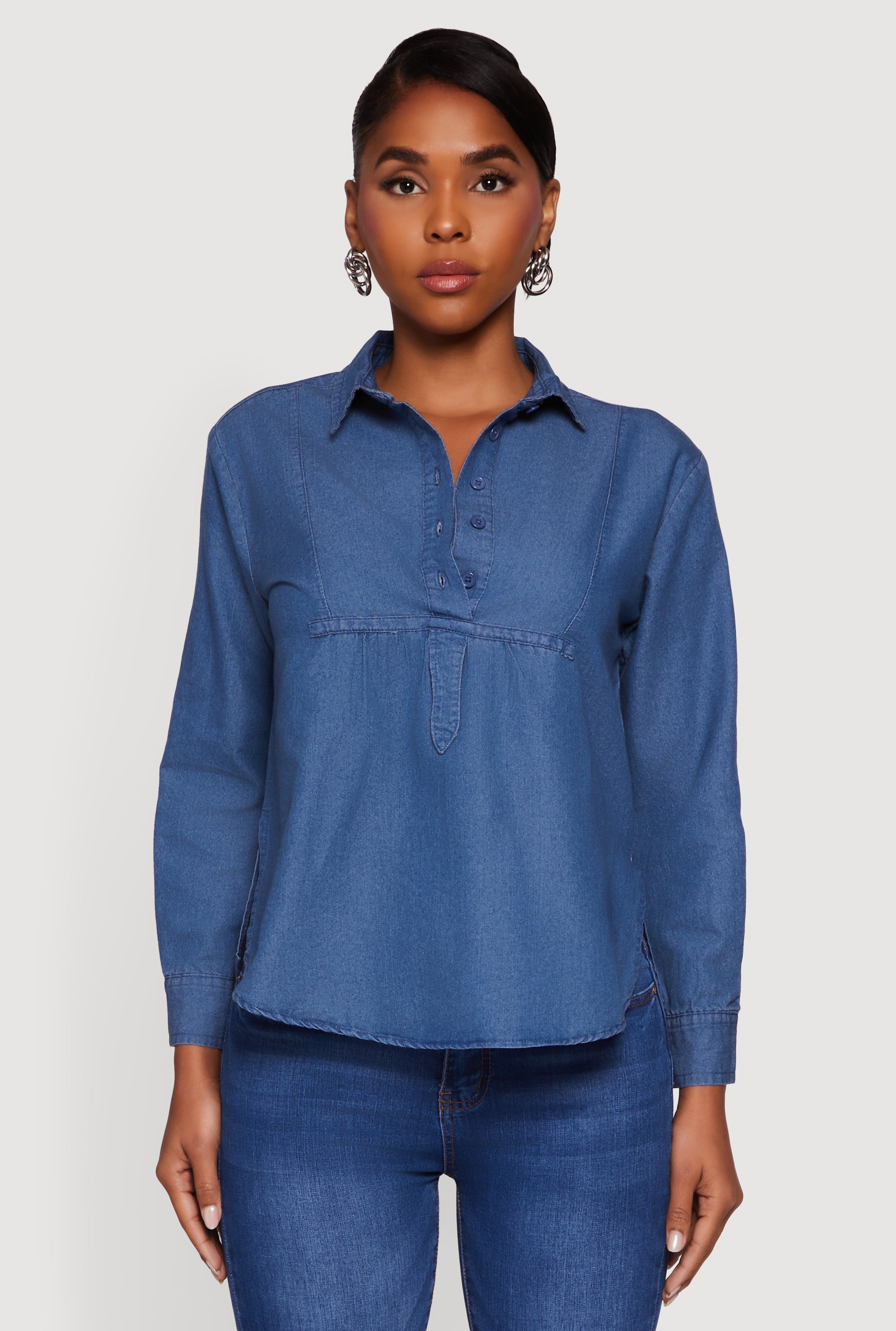 Denim Long Sleeve Half Button Front Blouse