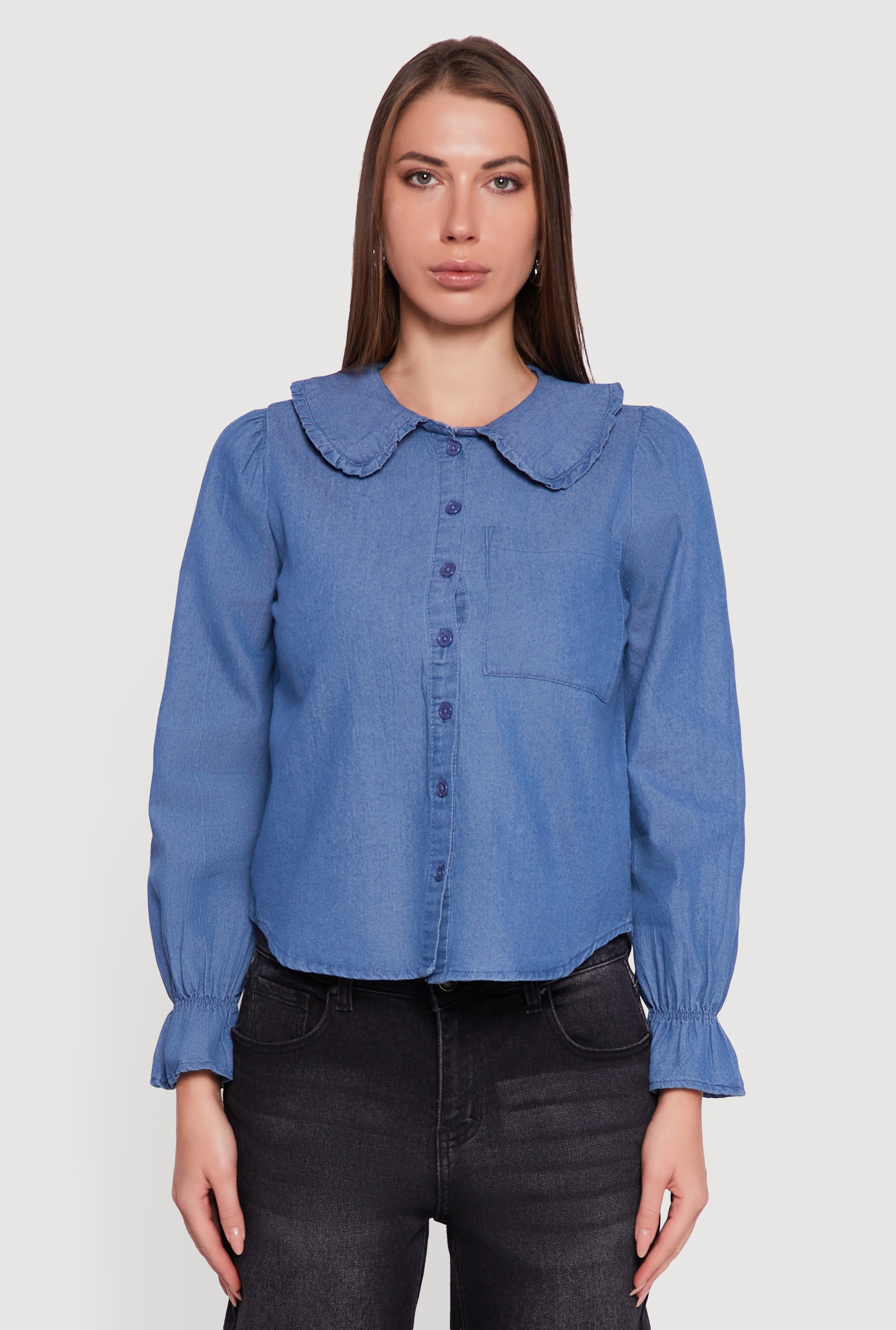 Chambray Button Front Peter Pan Collar Shirt