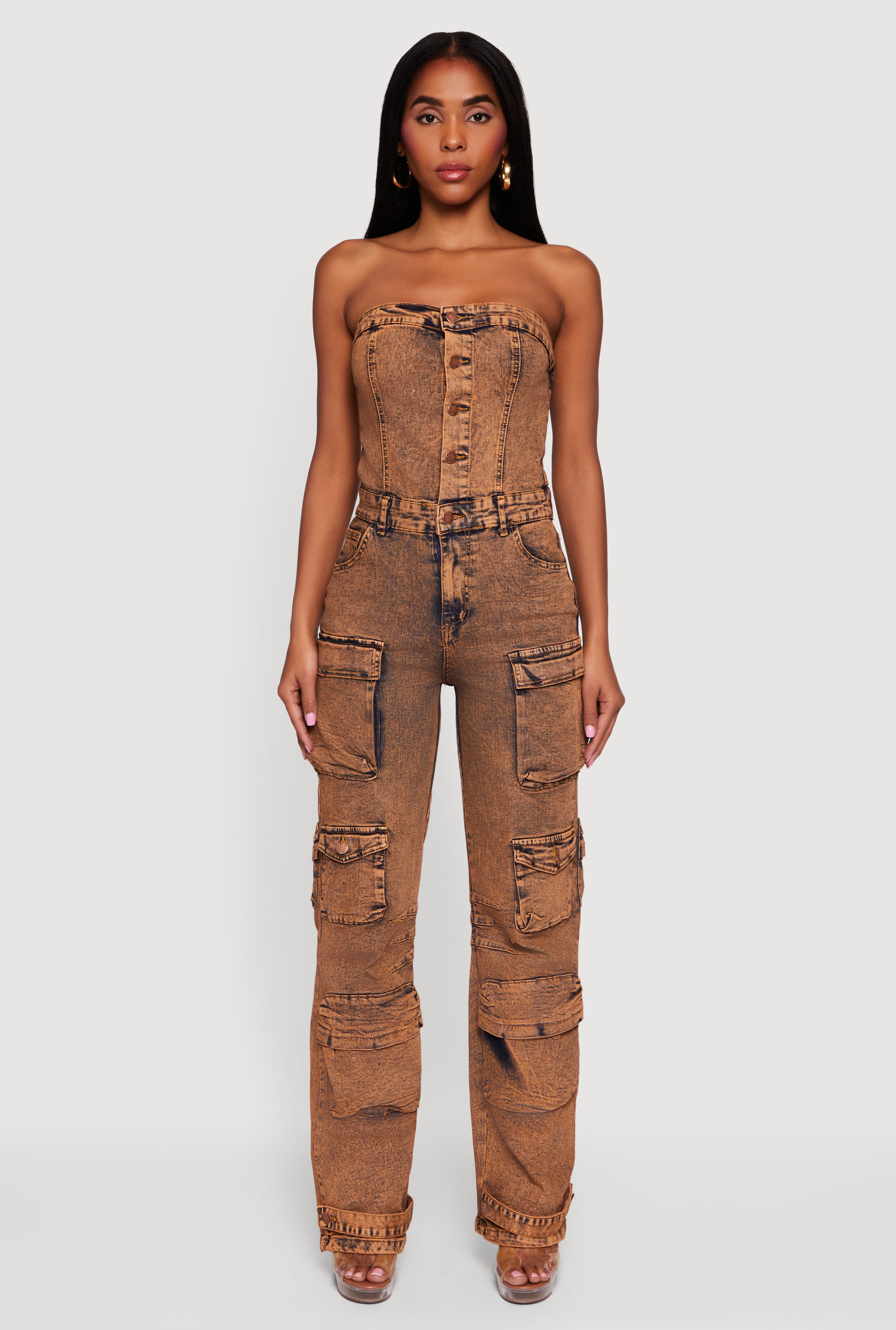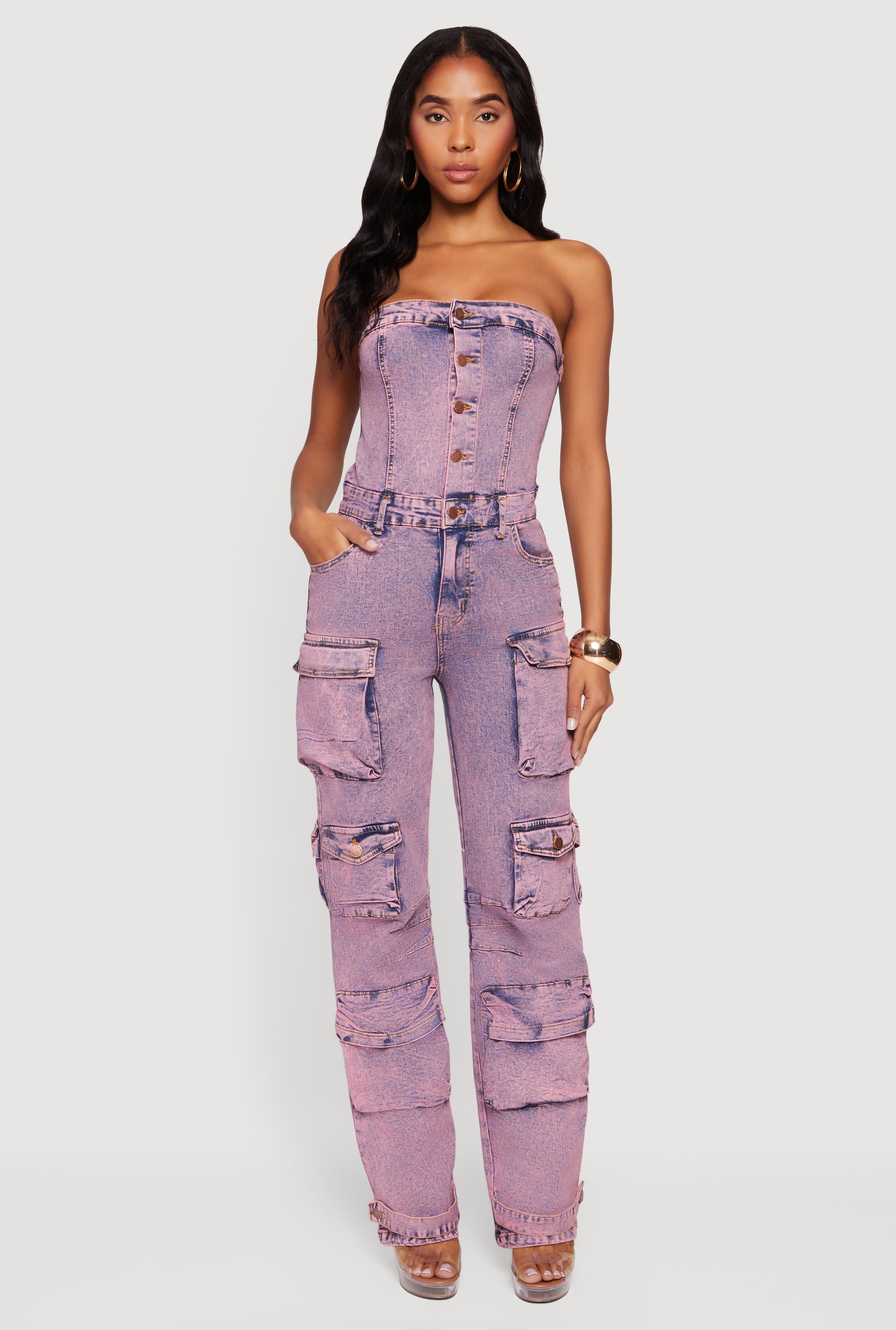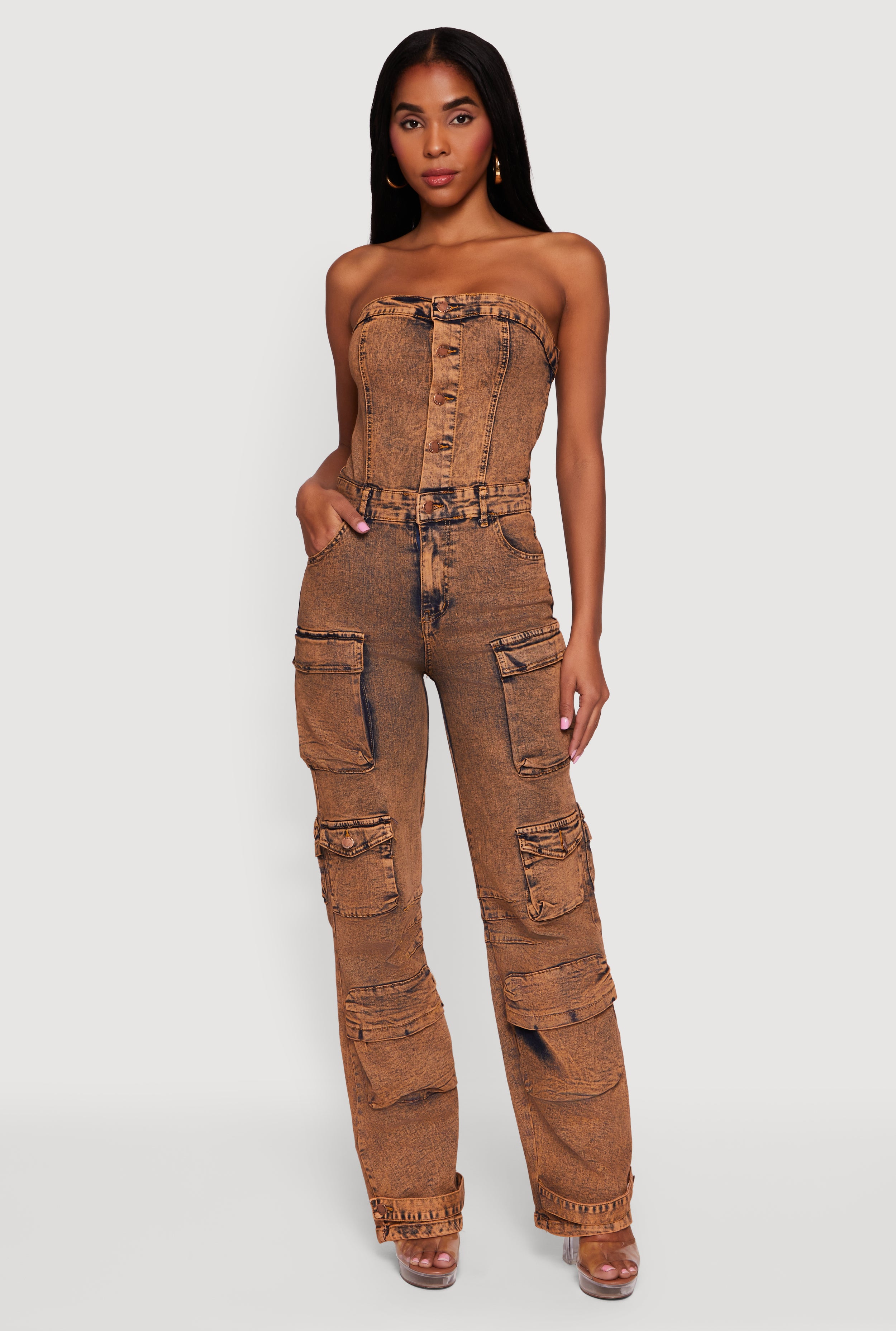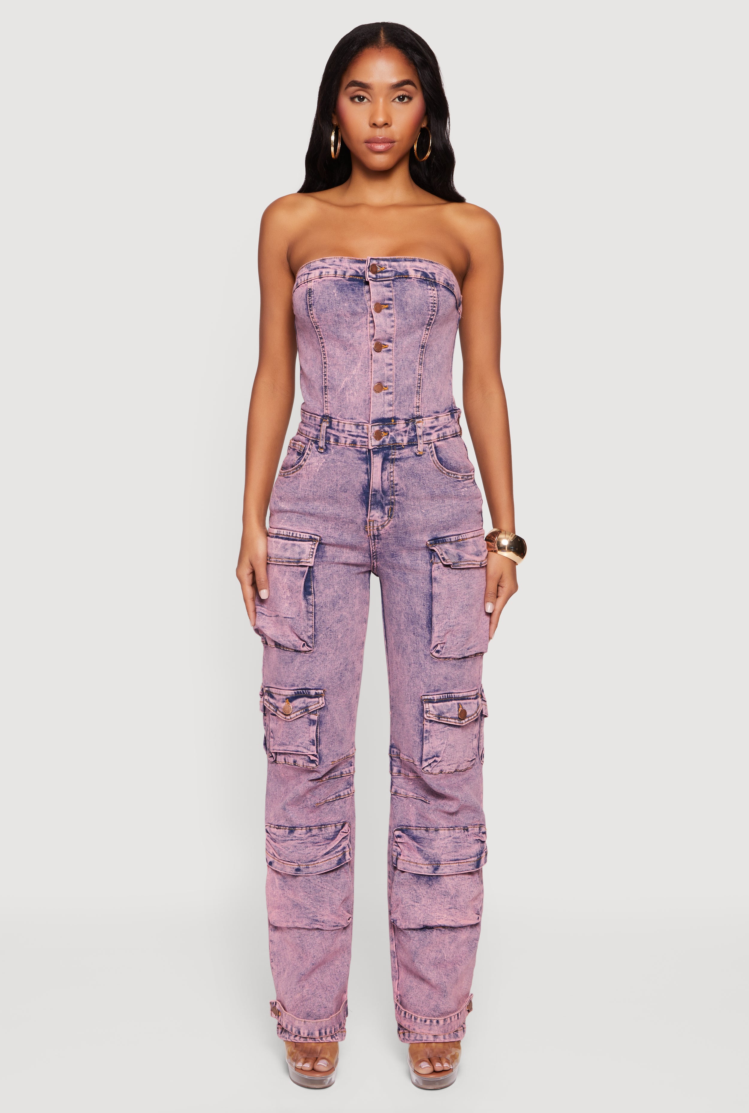 Acid Wash Strapless Button Front Utility Jumpsuit