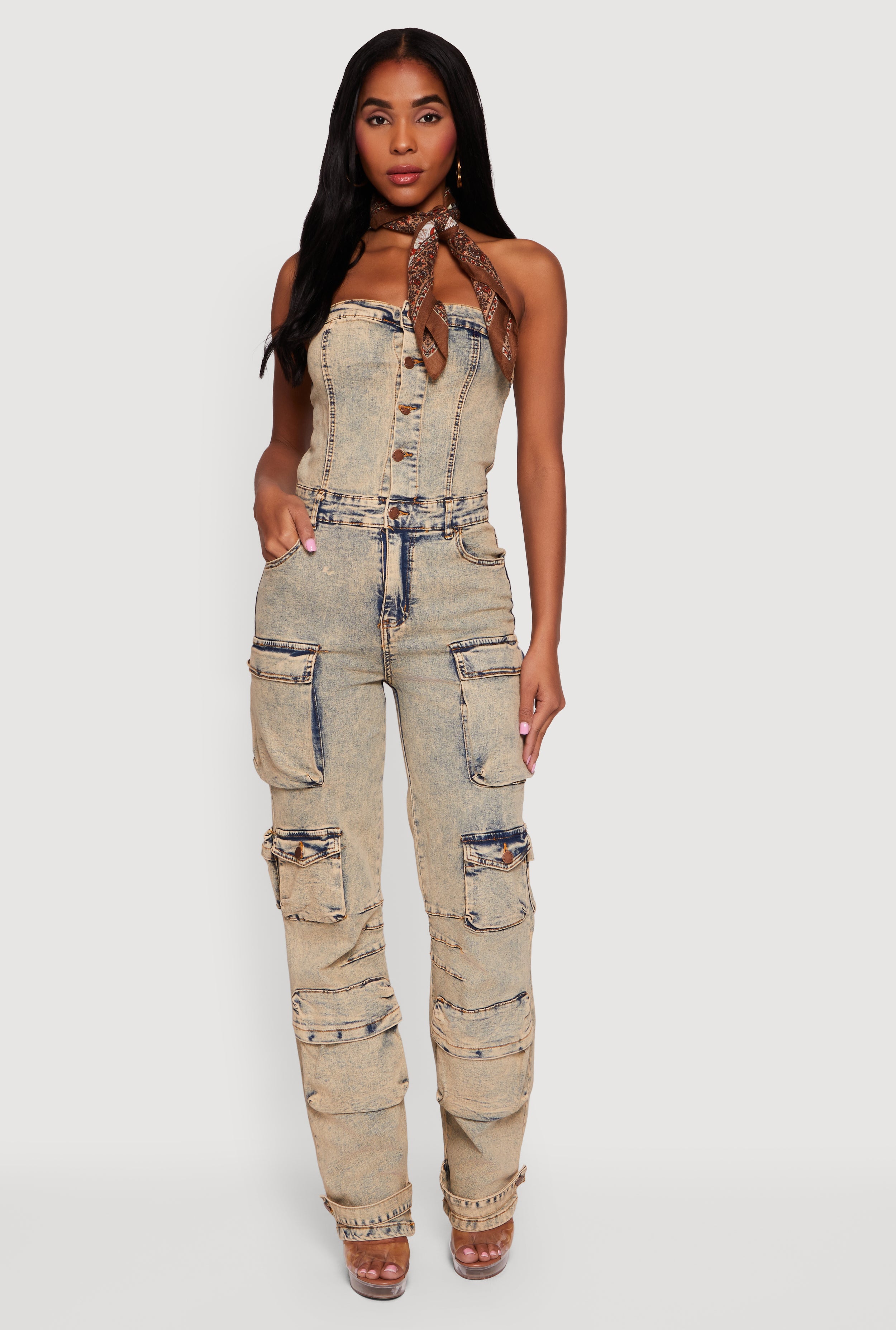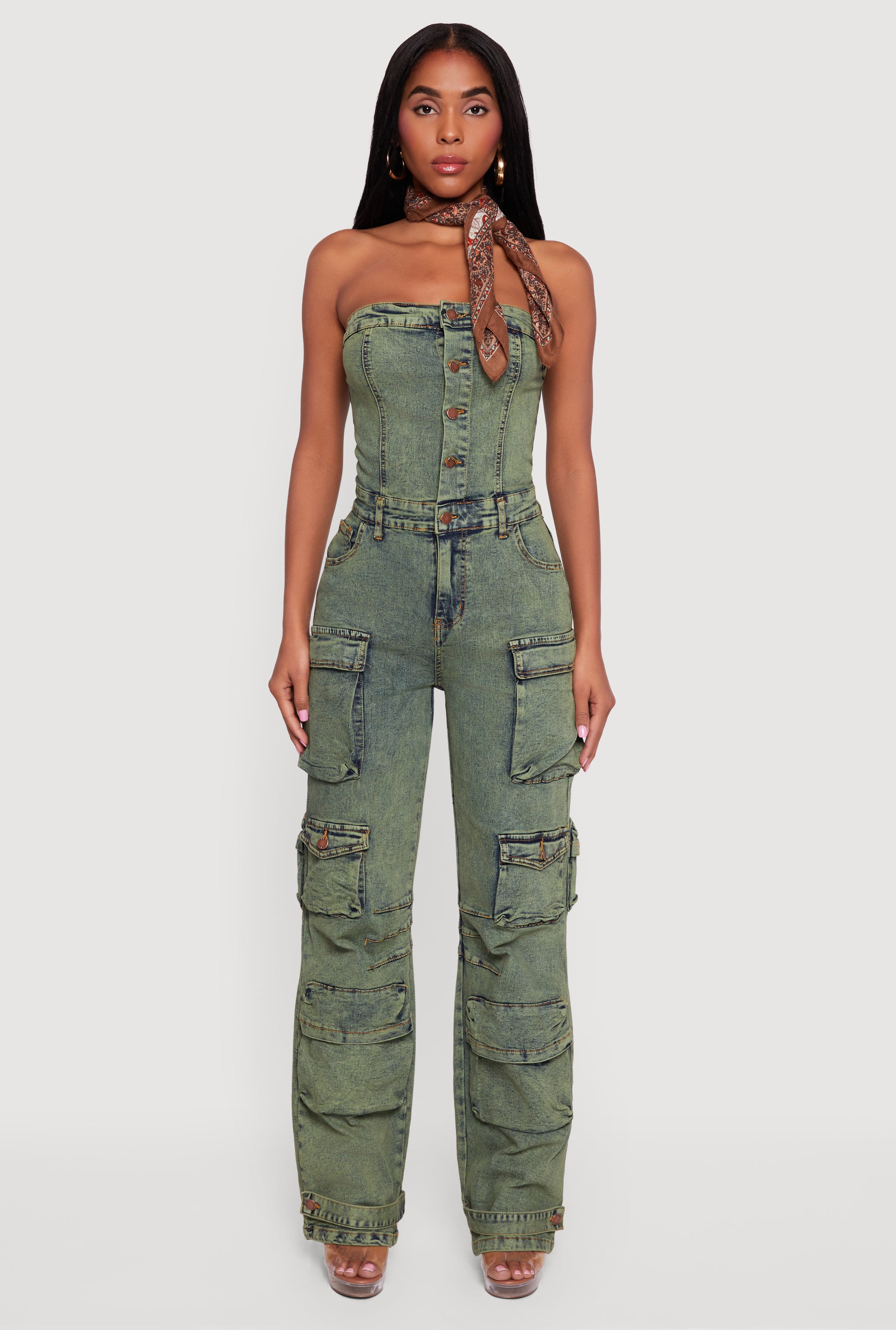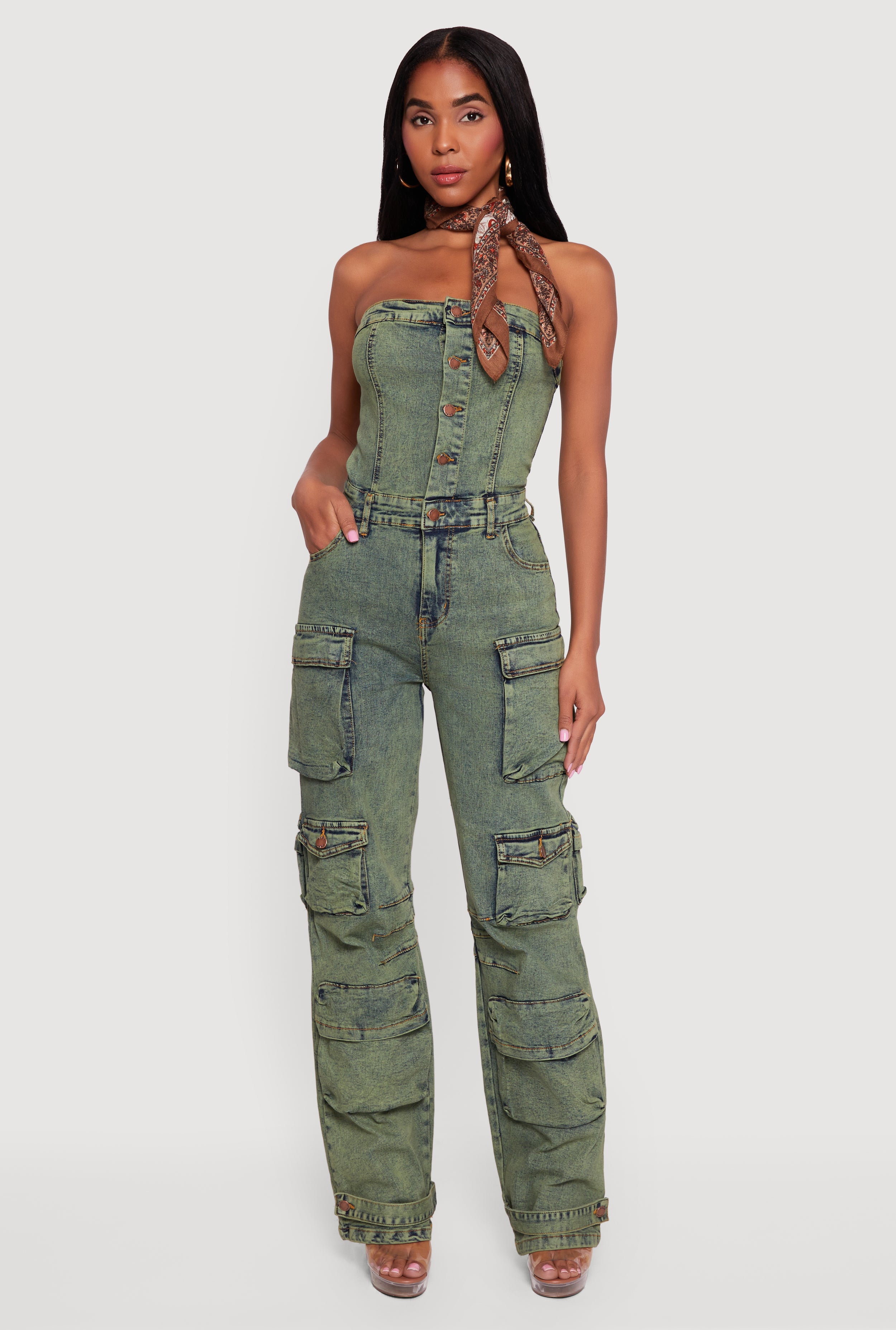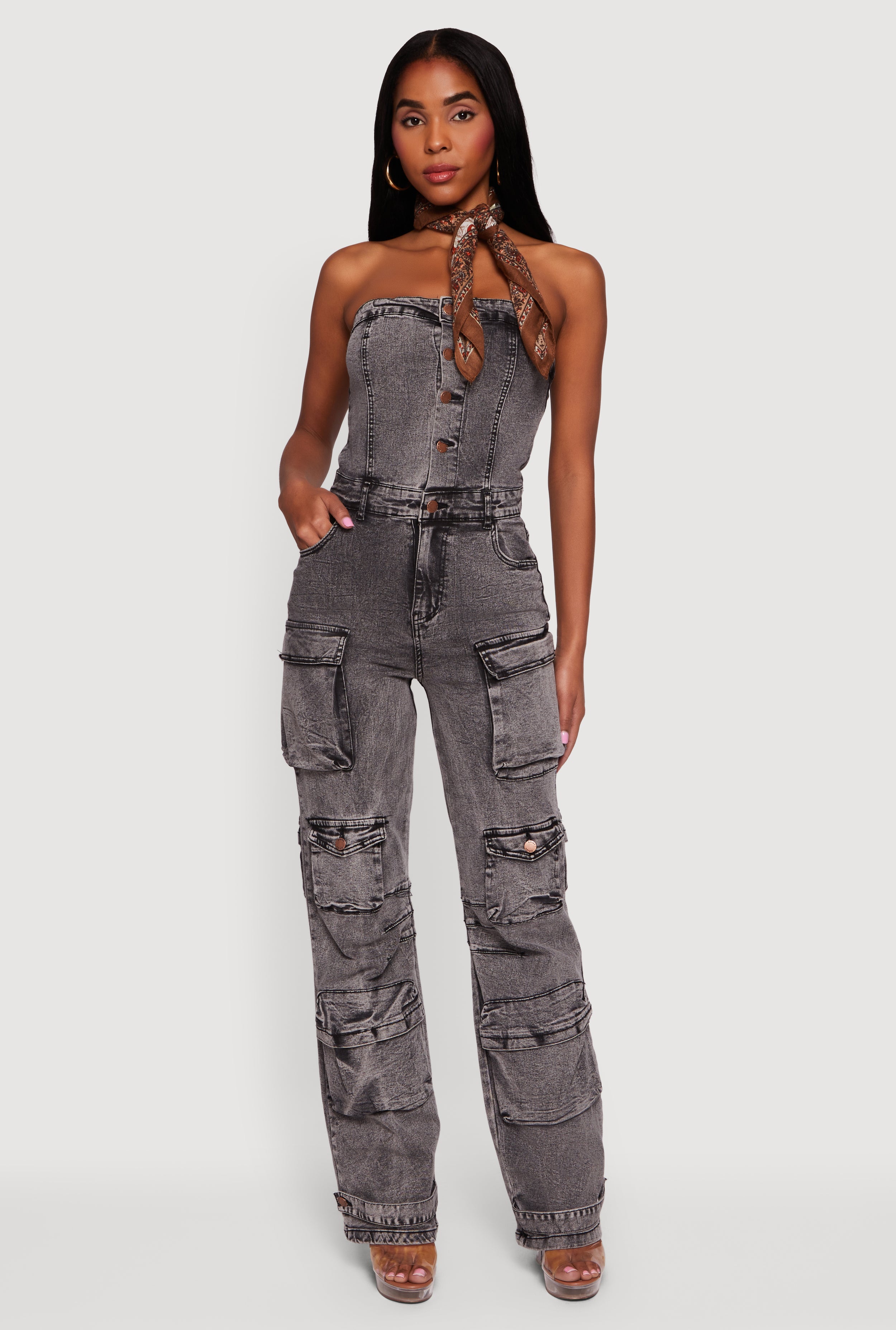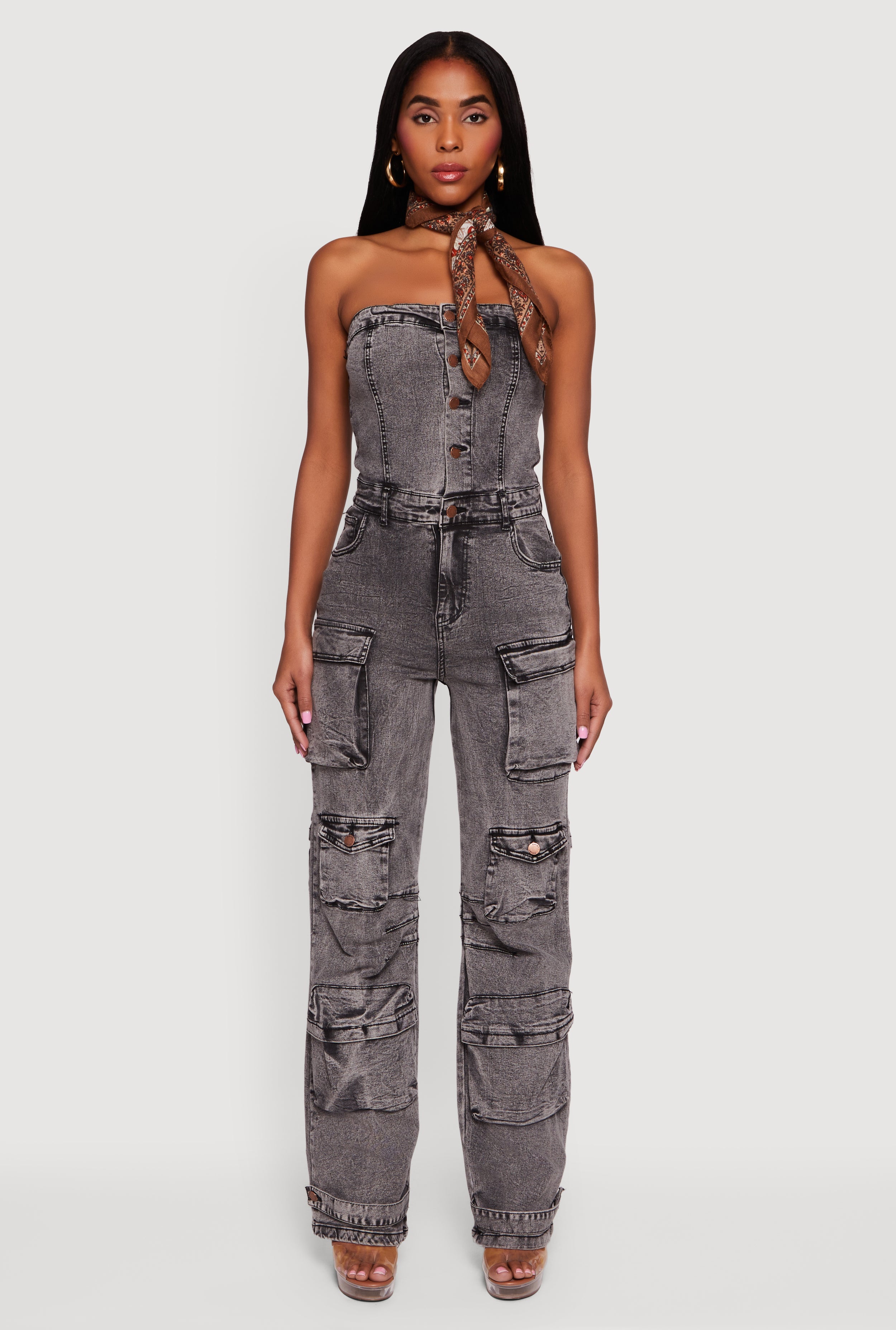 Acid Wash Strapless Button Front Utility Jumpsuit