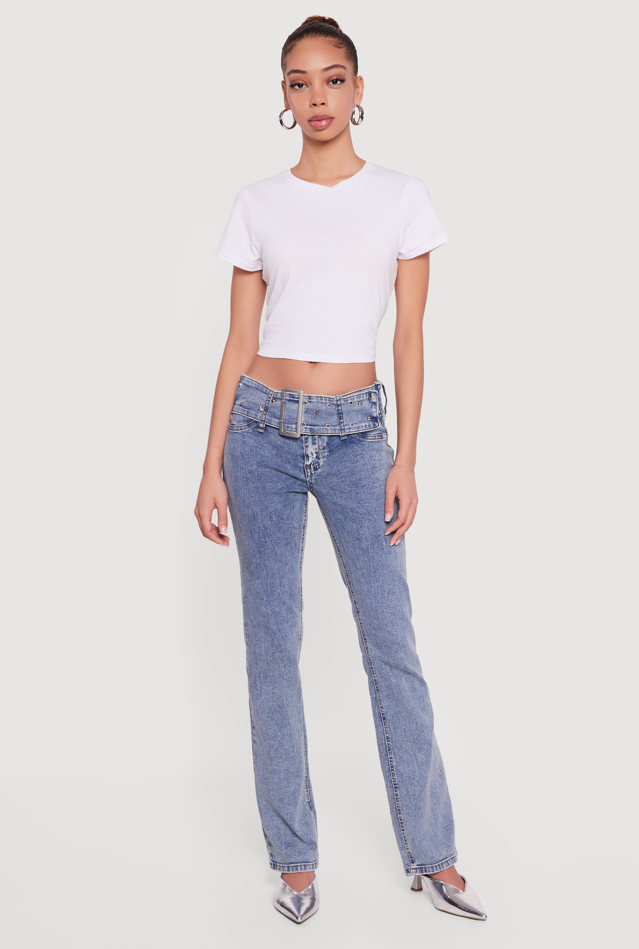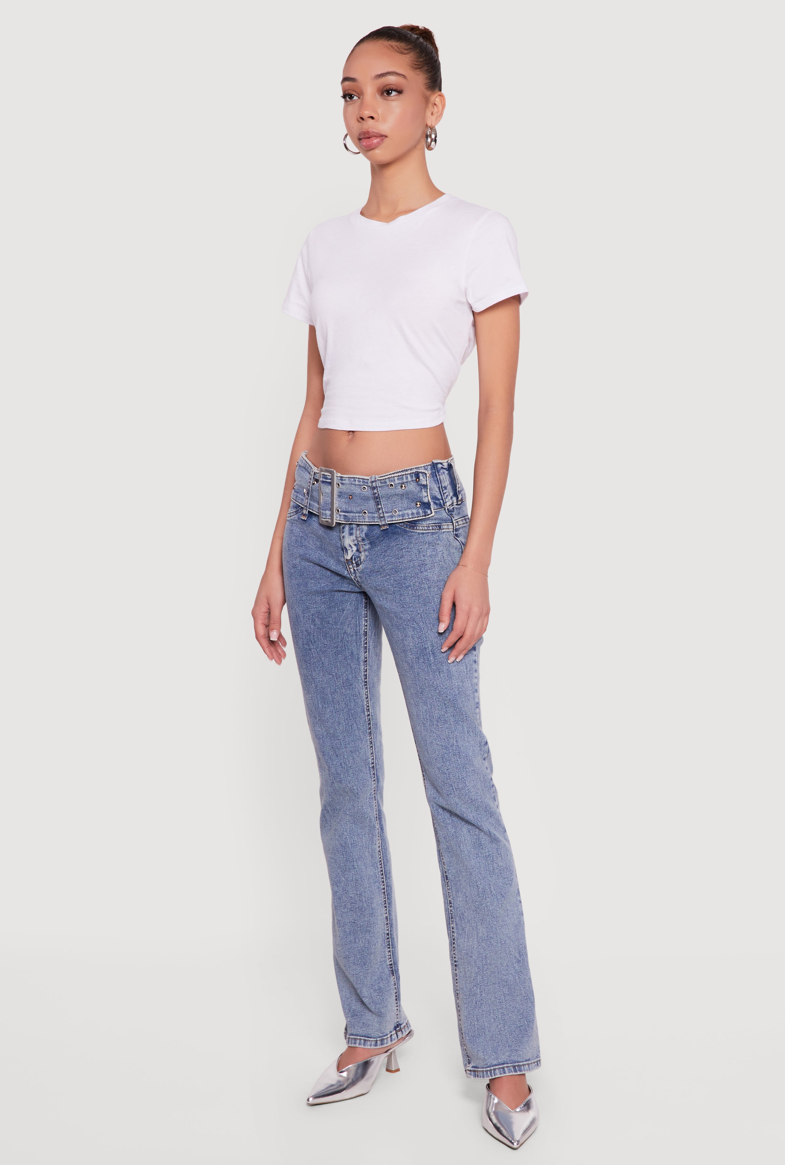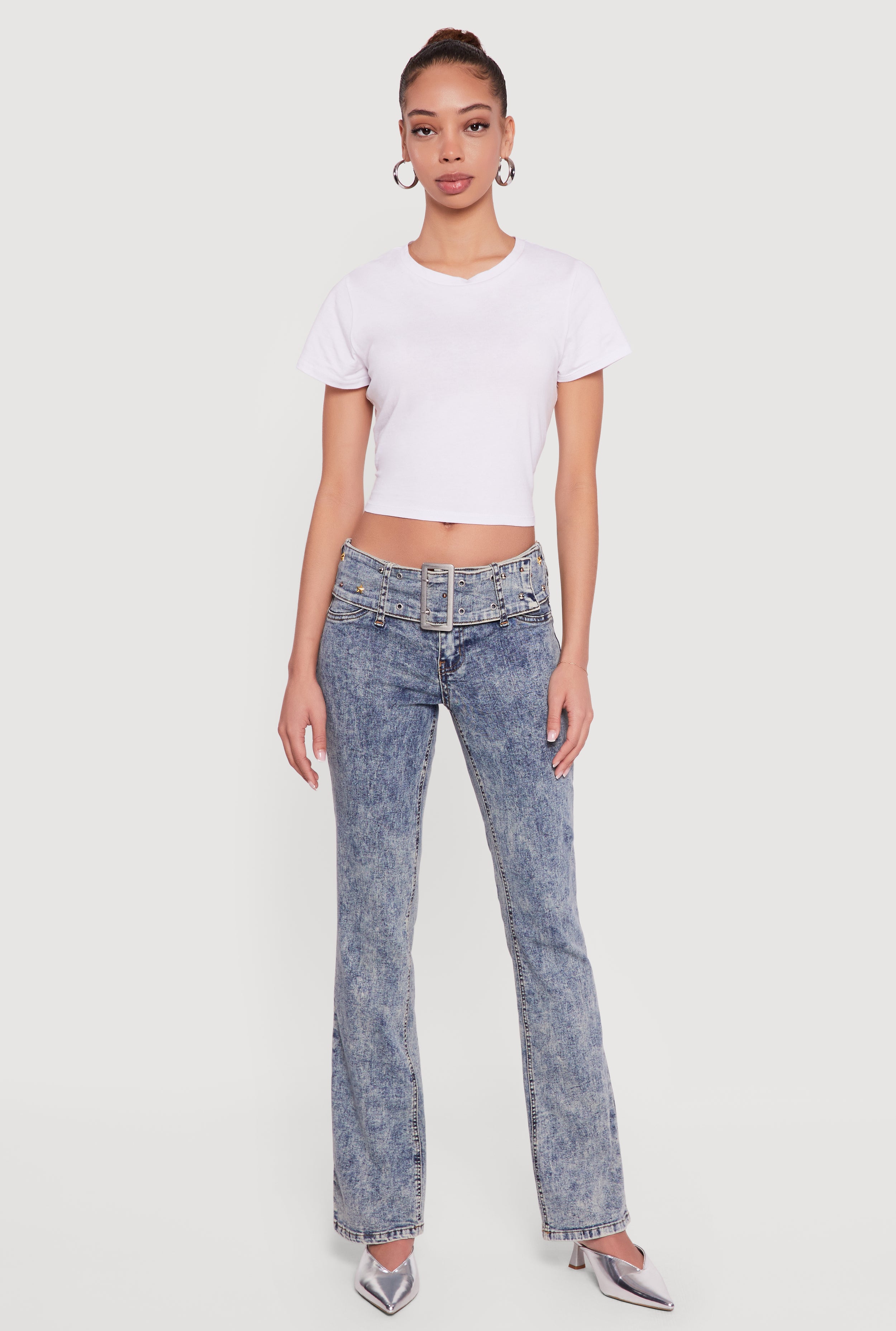 Rhinestone Belted Front Boot Cut Jeans