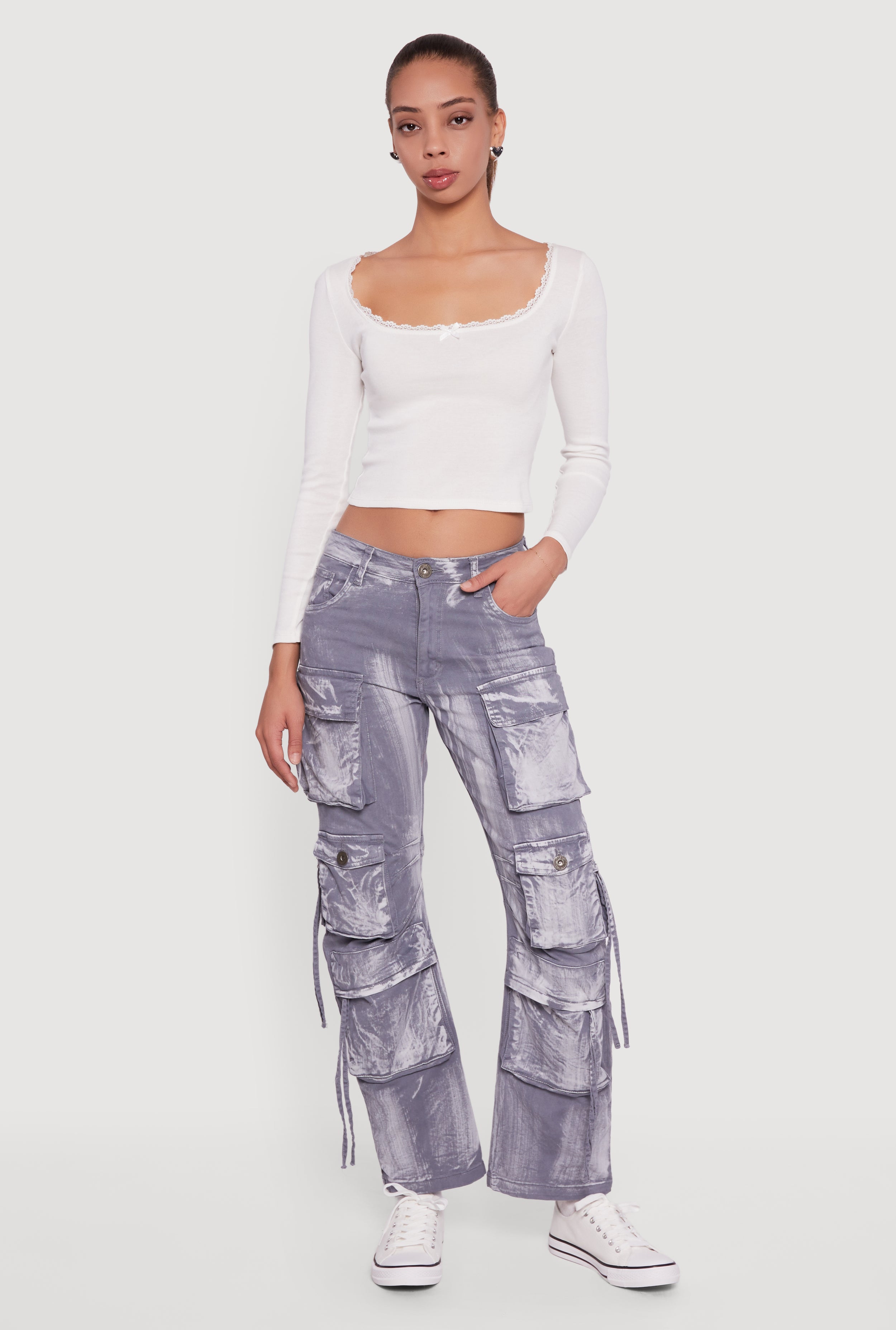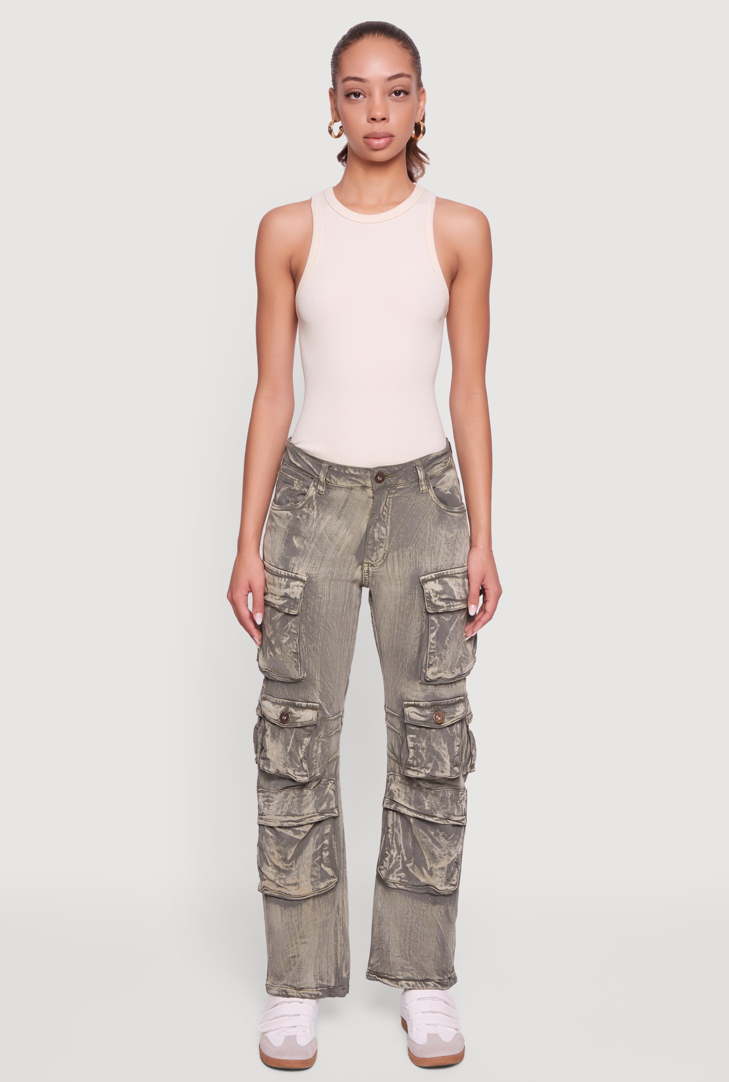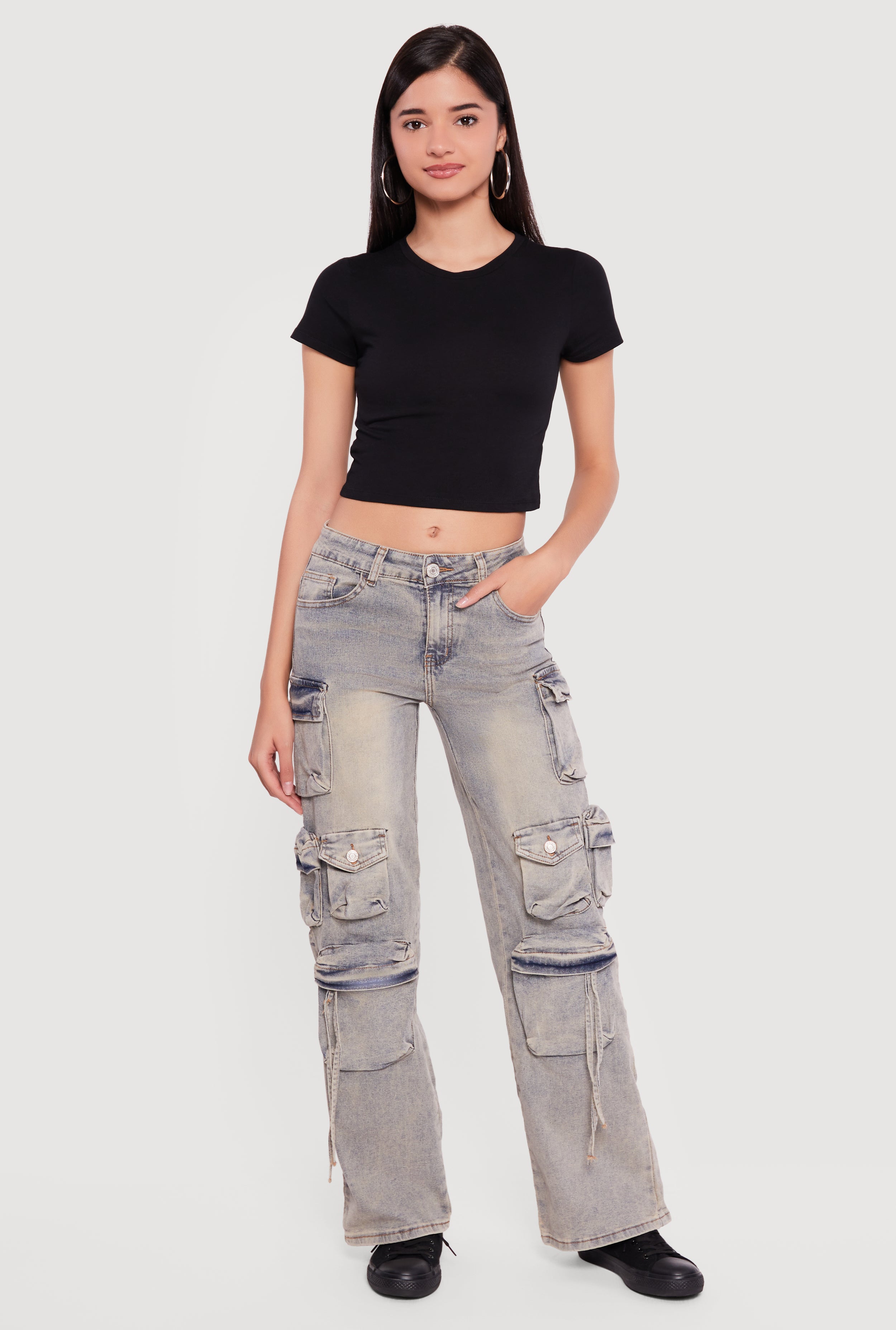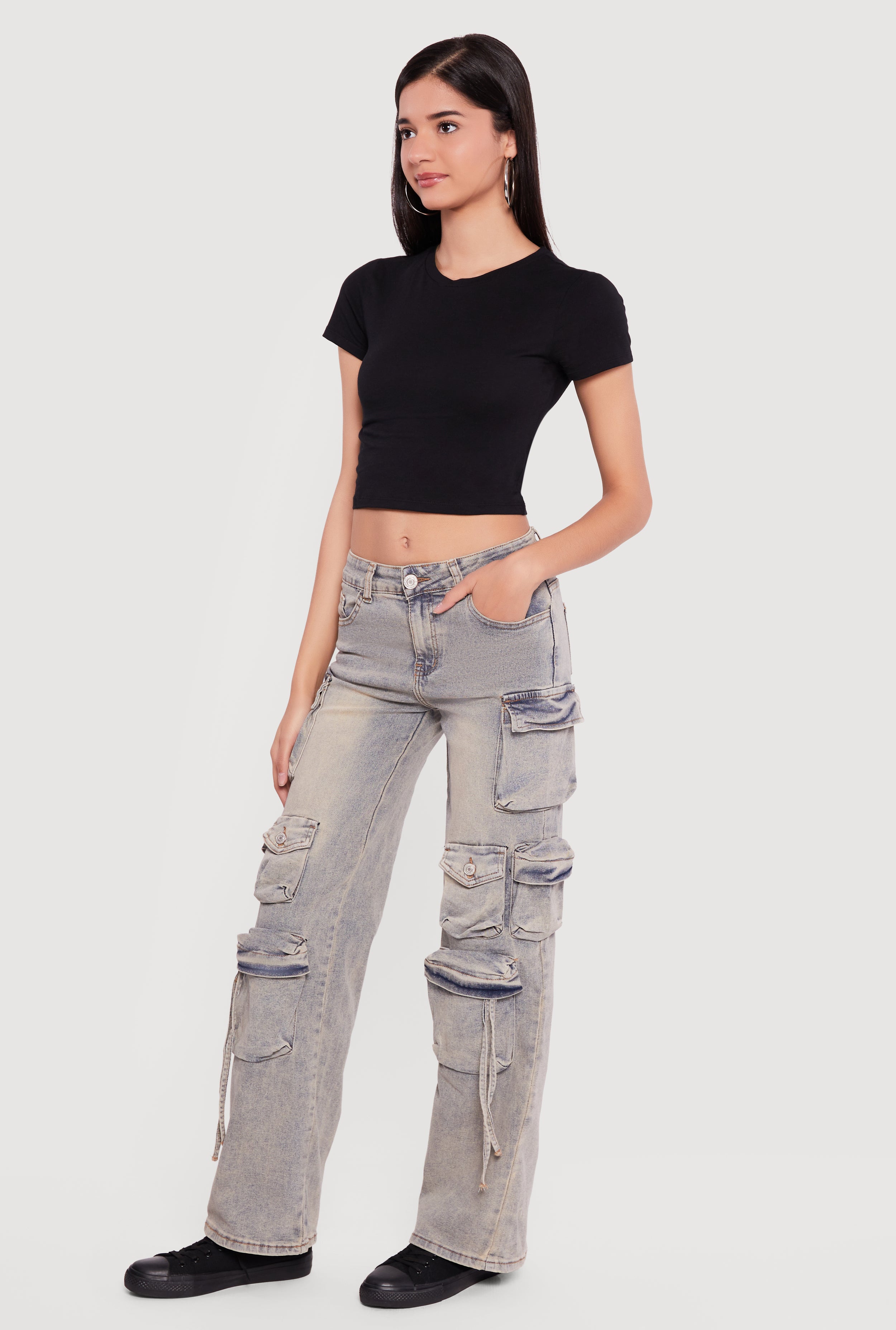 Mid Rise Wide Leg Acid Wash Cargo Jeans