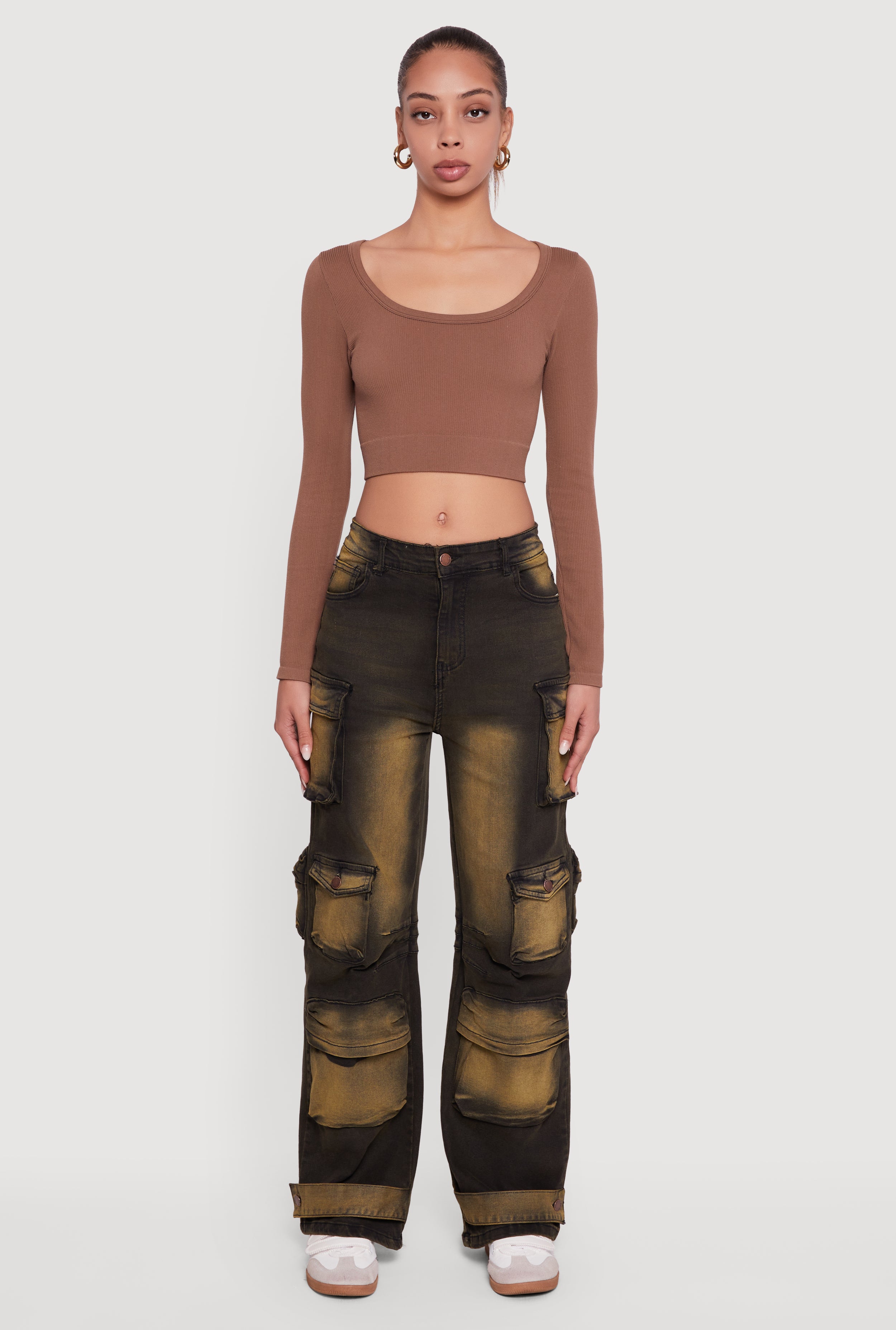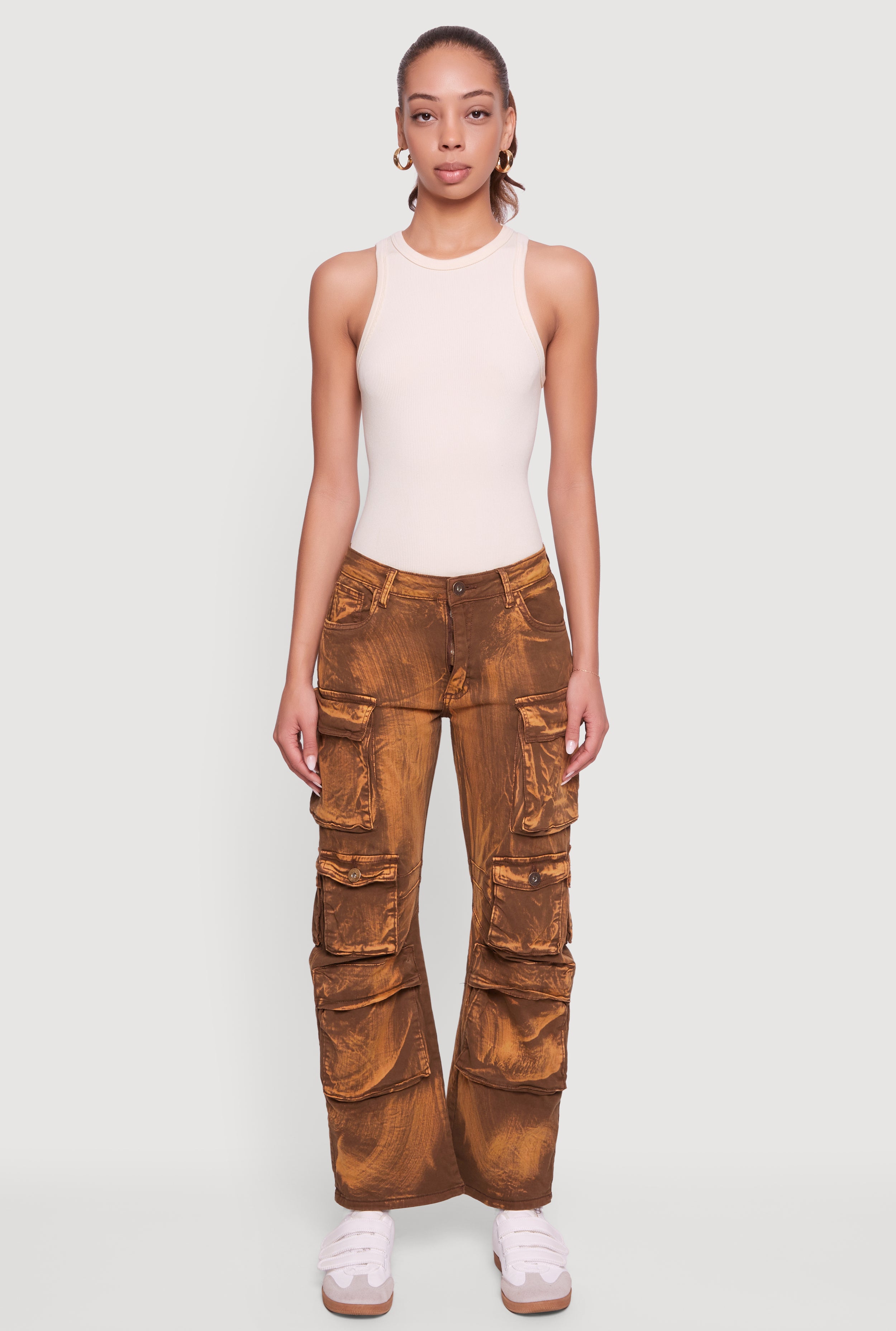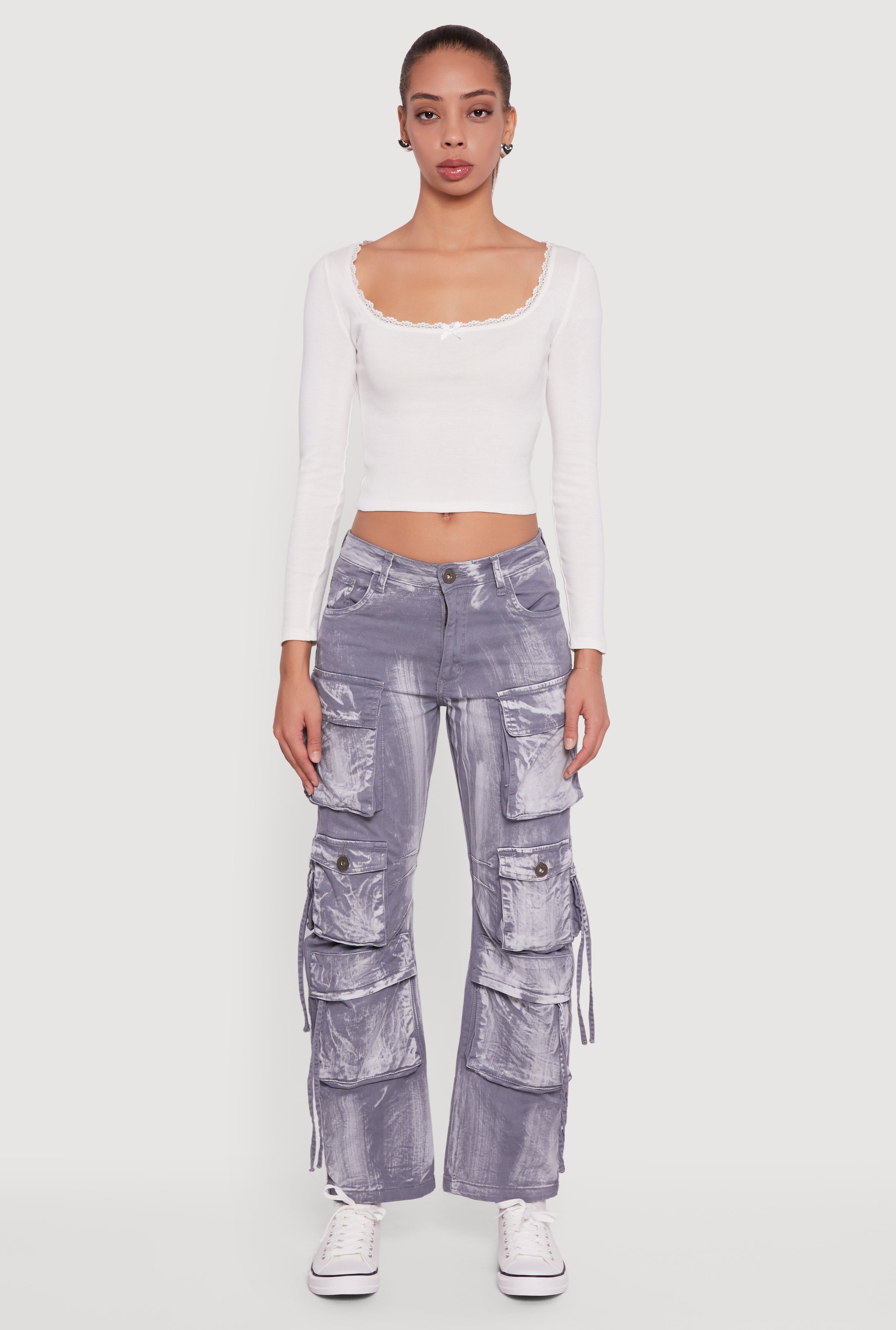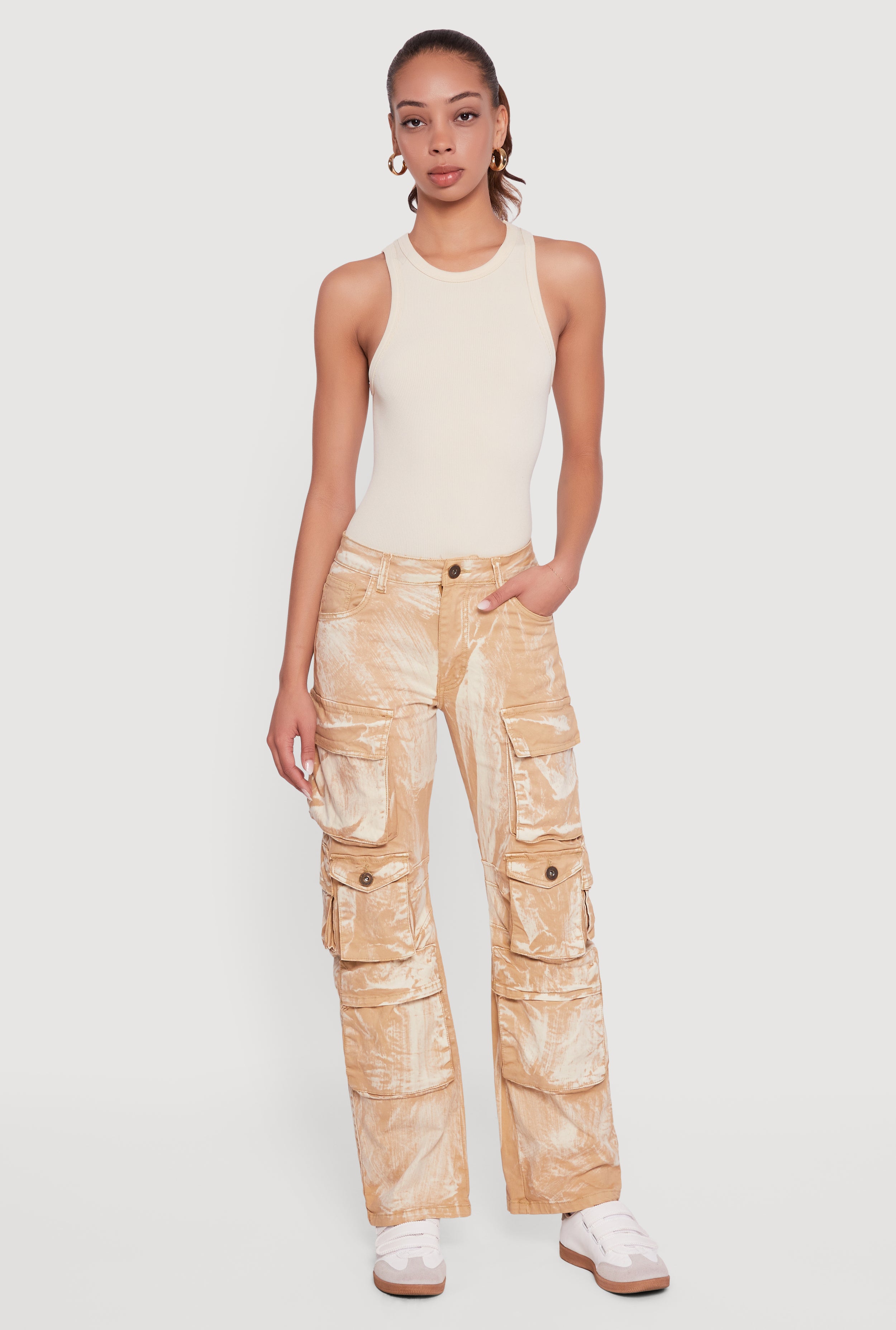 Mid Rise Wide Leg Acid Wash Cargo Jeans