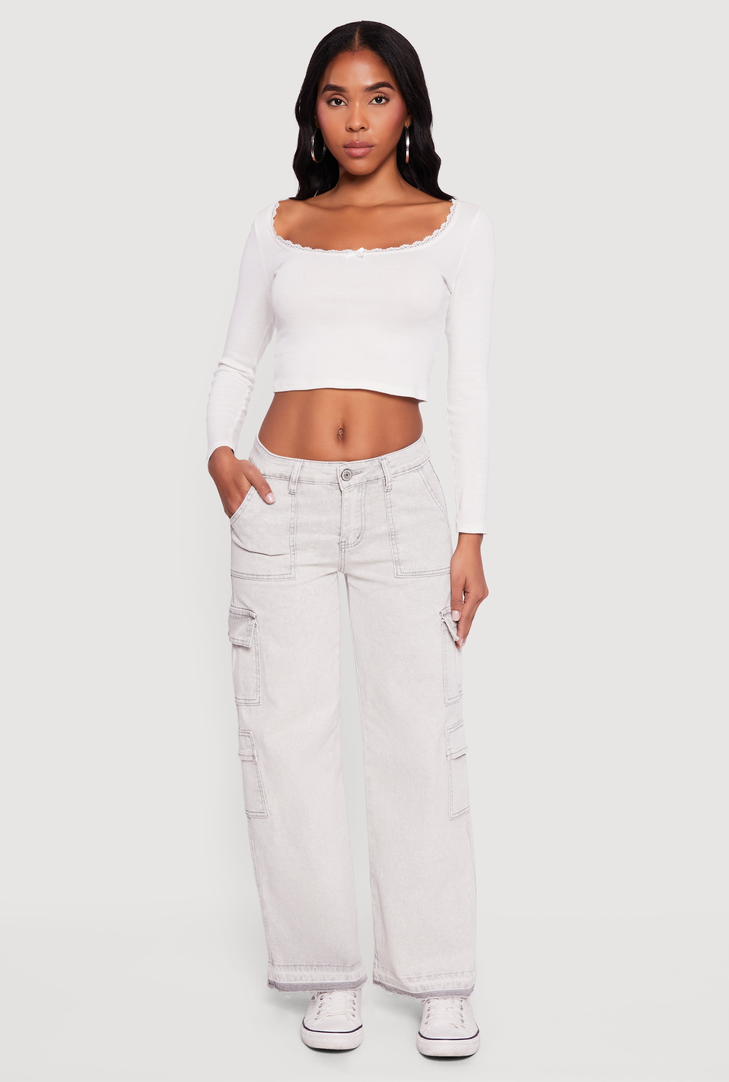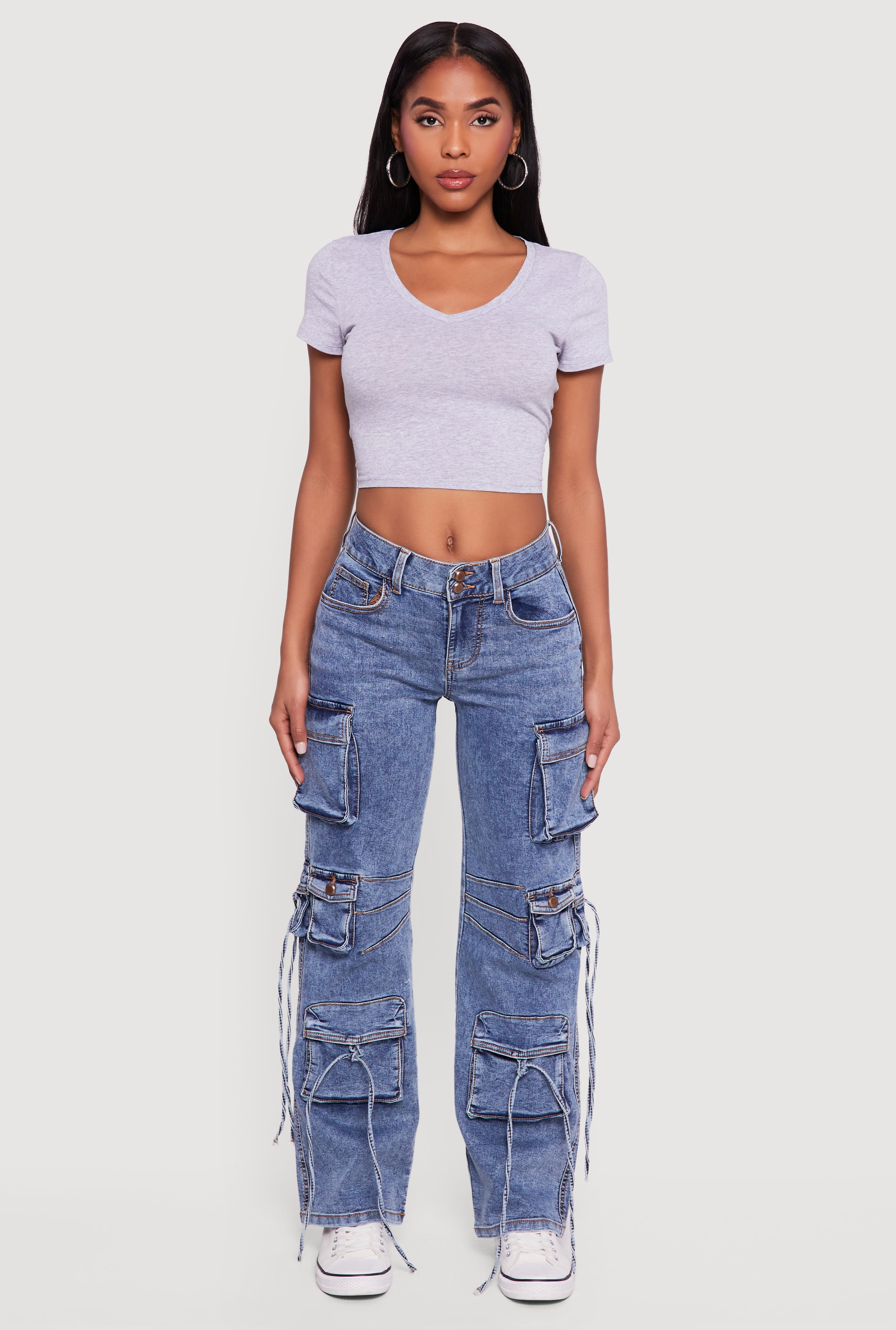 Bleached Detail Mid Rise Wide Leg Cargo Pocket Jeans