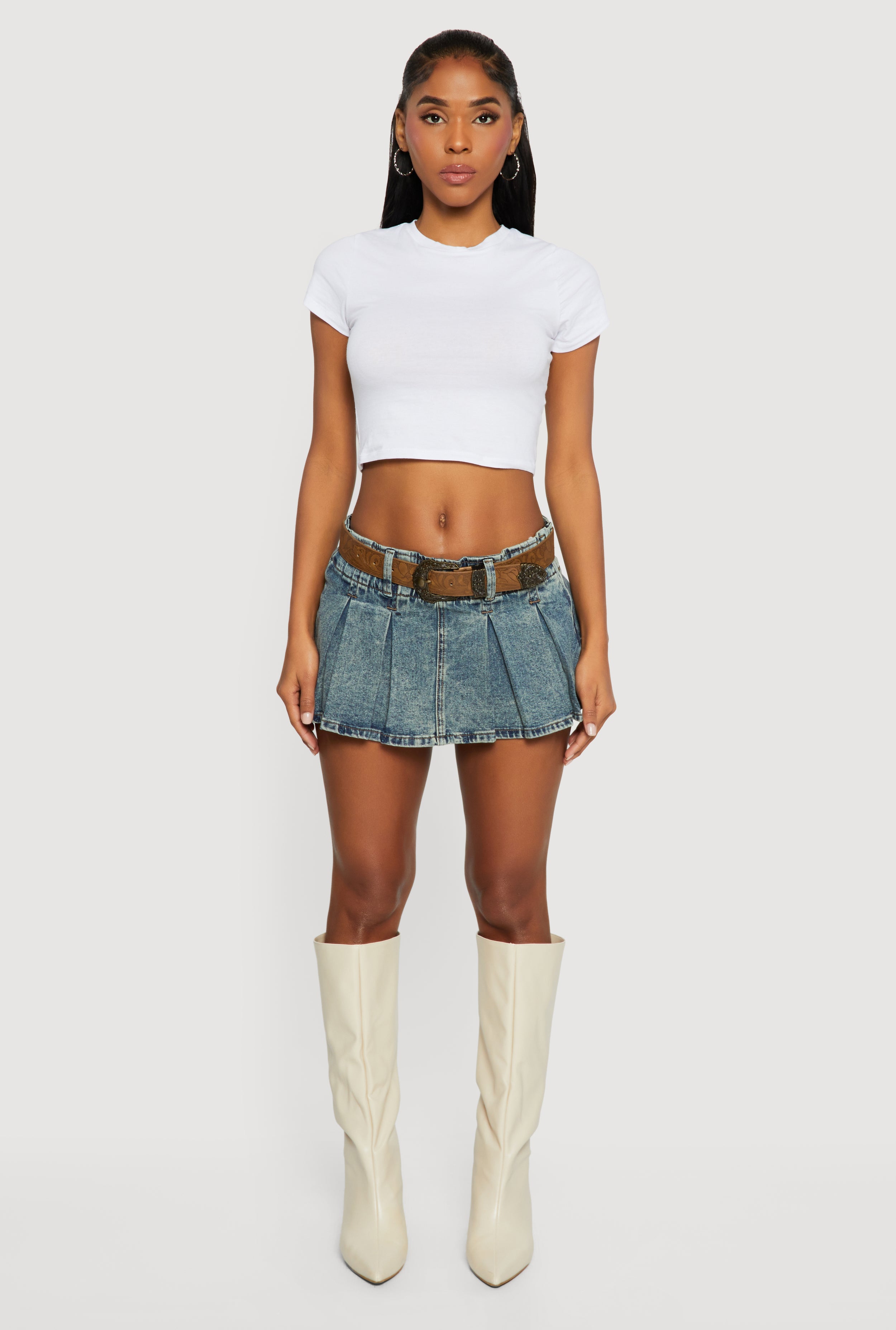 Cowboy Belted Mid Rise Acid Wash Pleated Skort