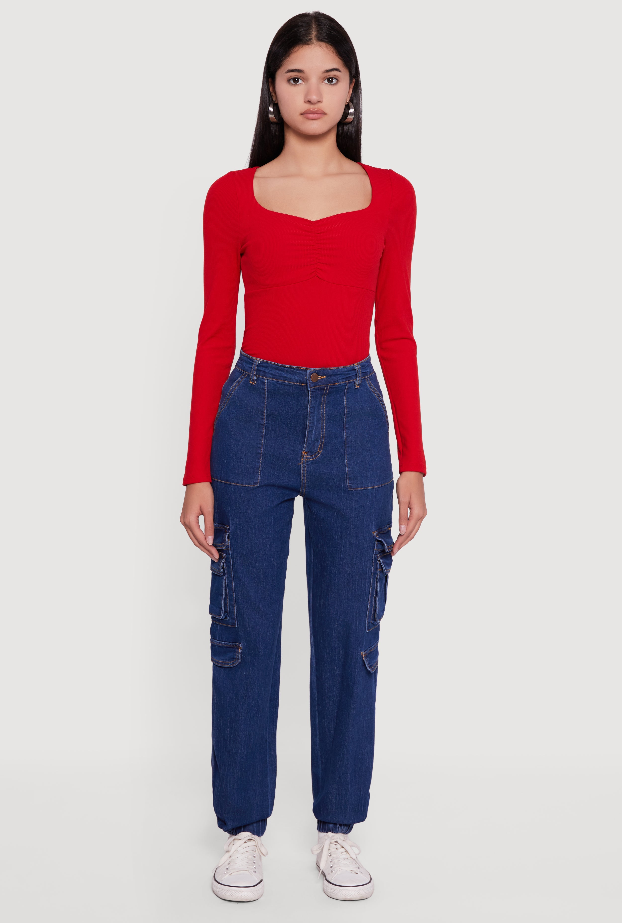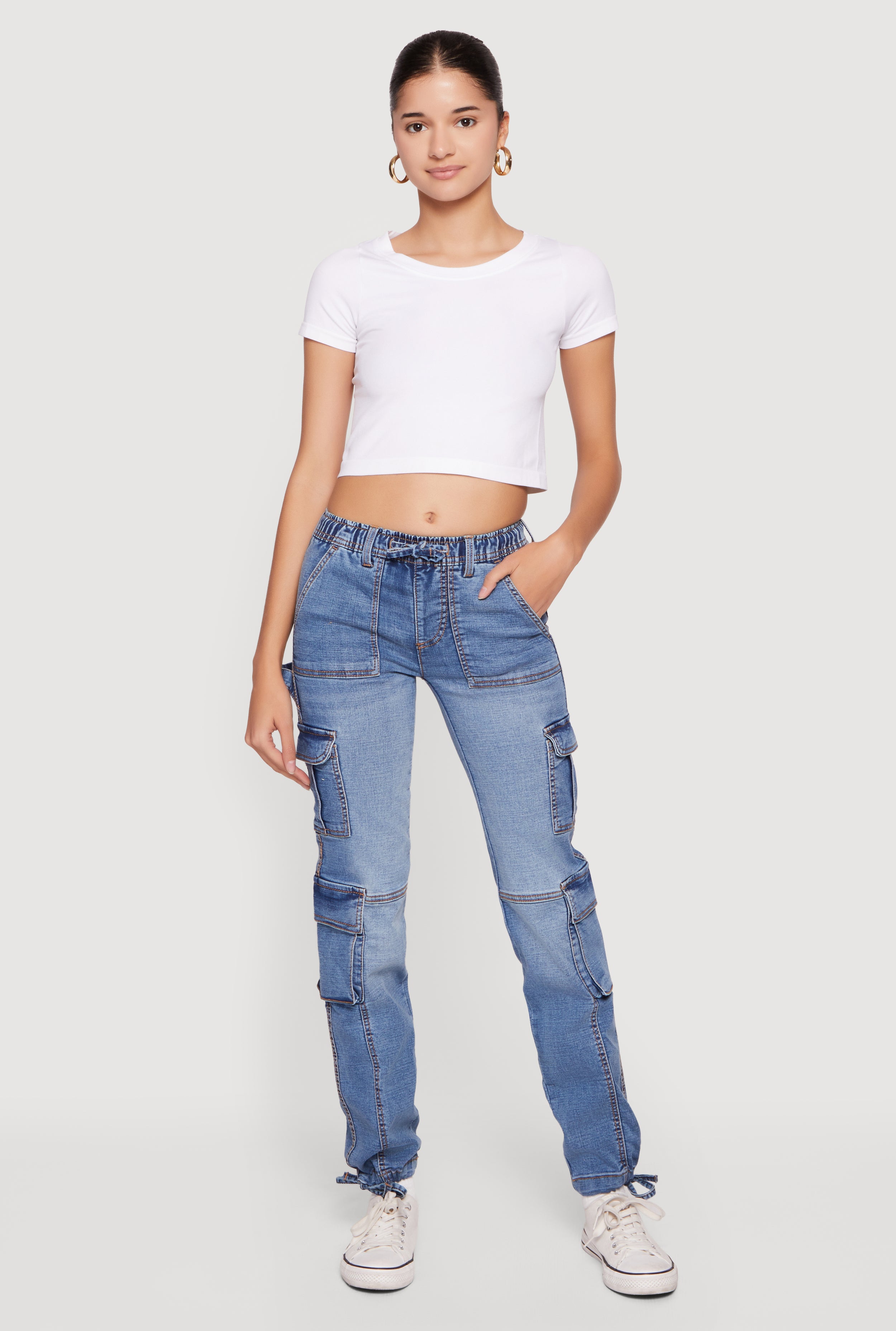 Drawstring Waist Mid Rise Cargo Pocket Denim Joggers