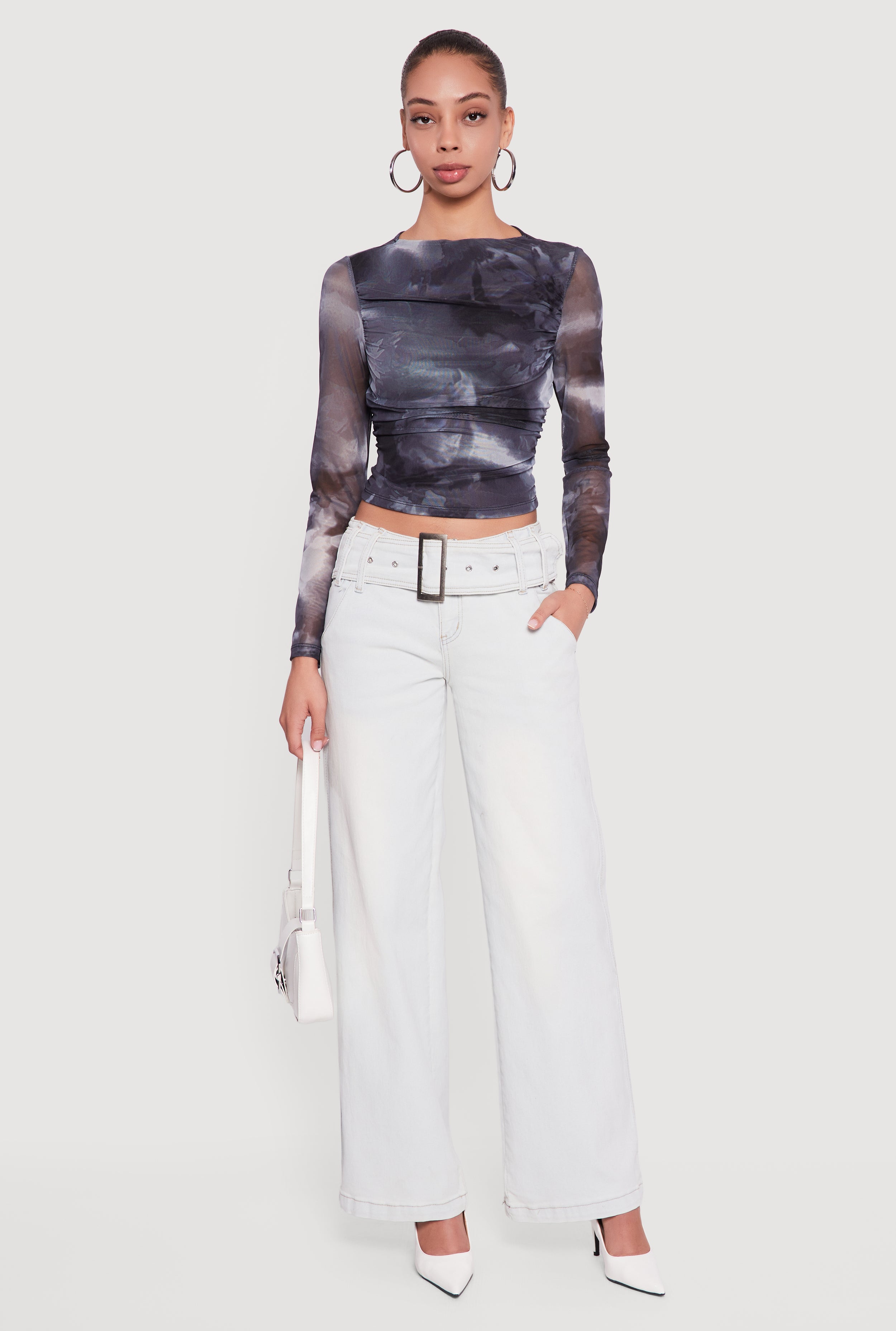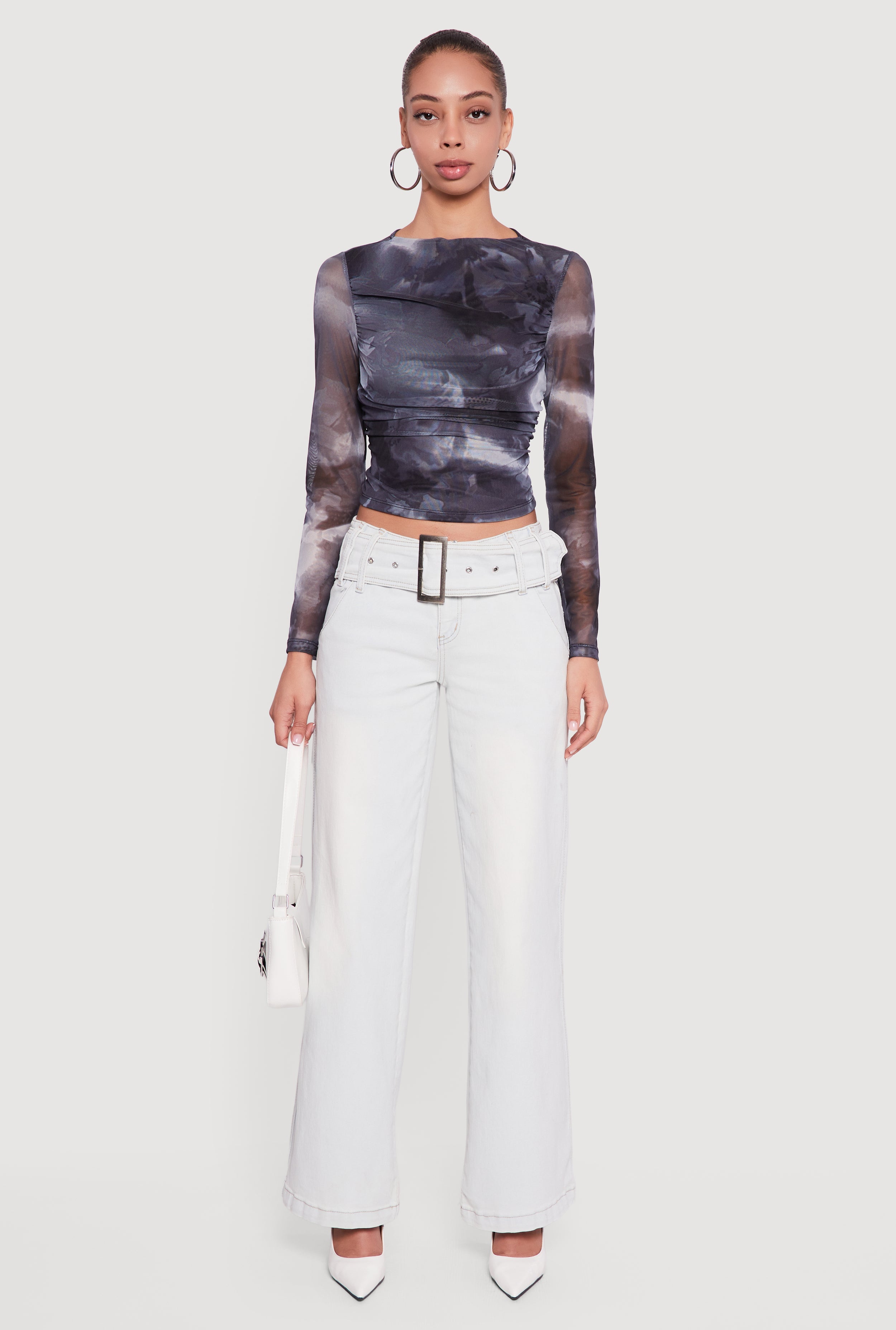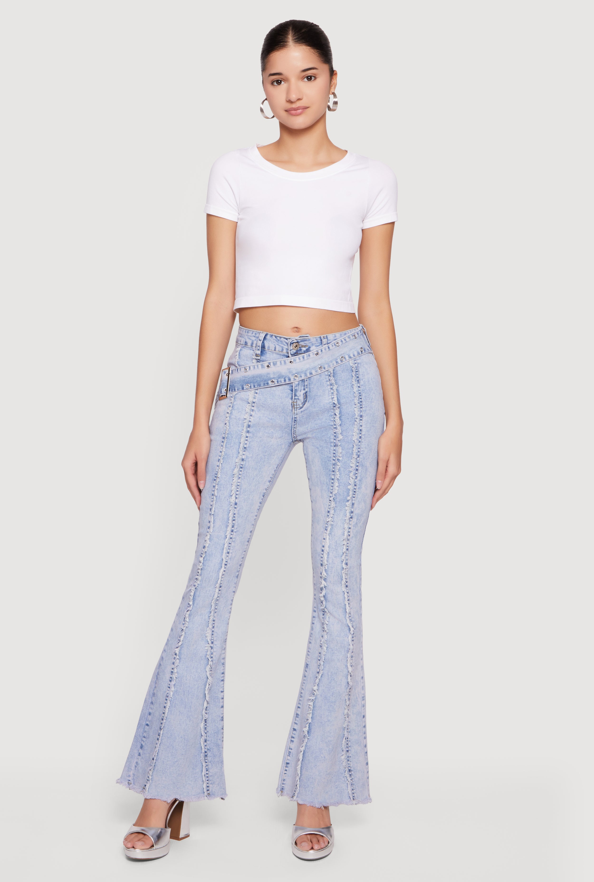 Acid Wash Belted Front Frayed Flare Jeans